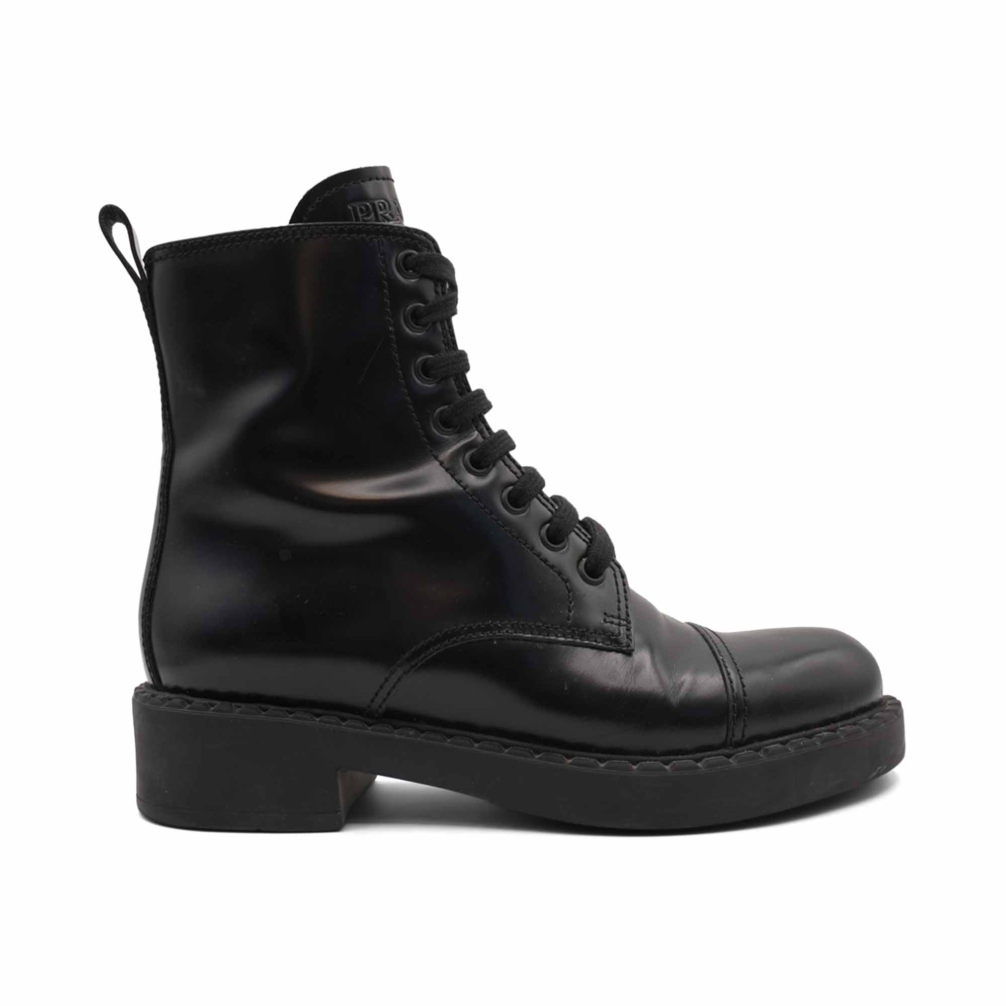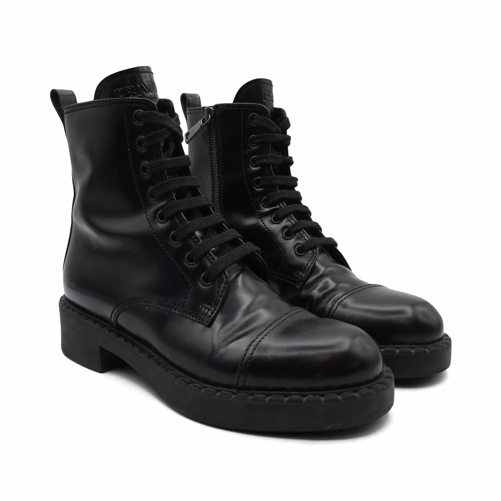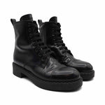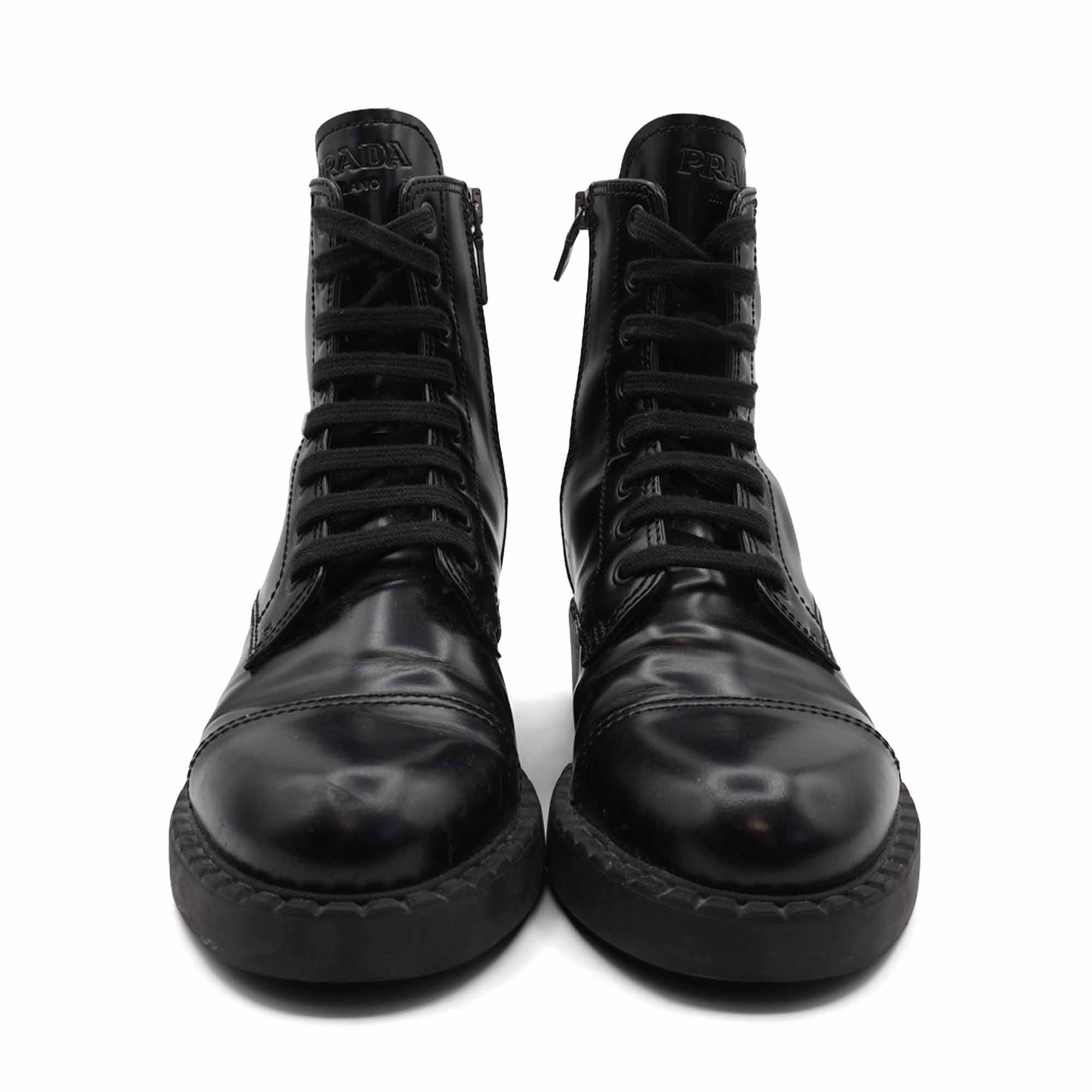 Prada combat boots in black smooth leather with a side zip opening in gunmetal hardware and tonal laces.