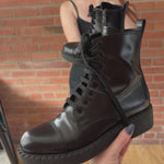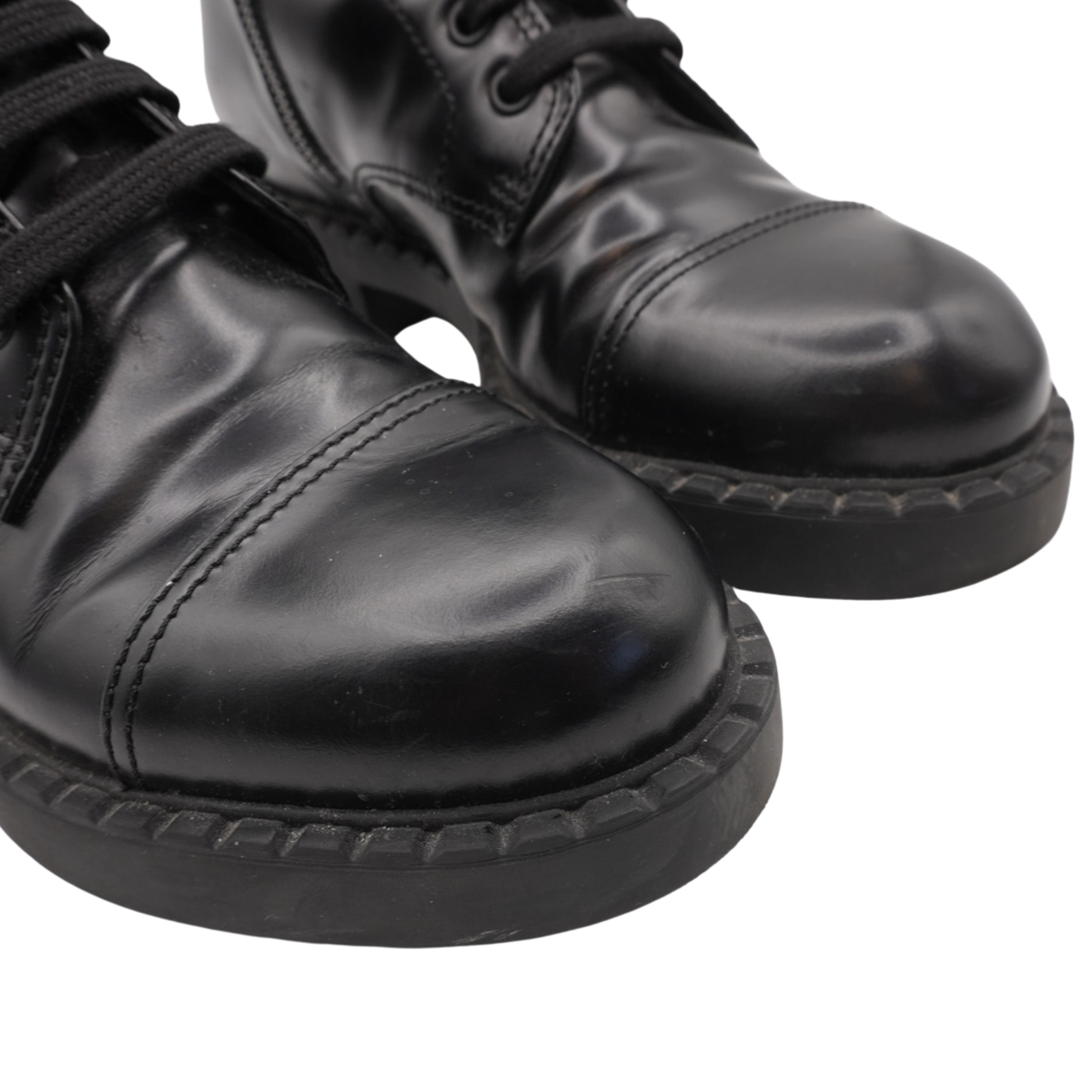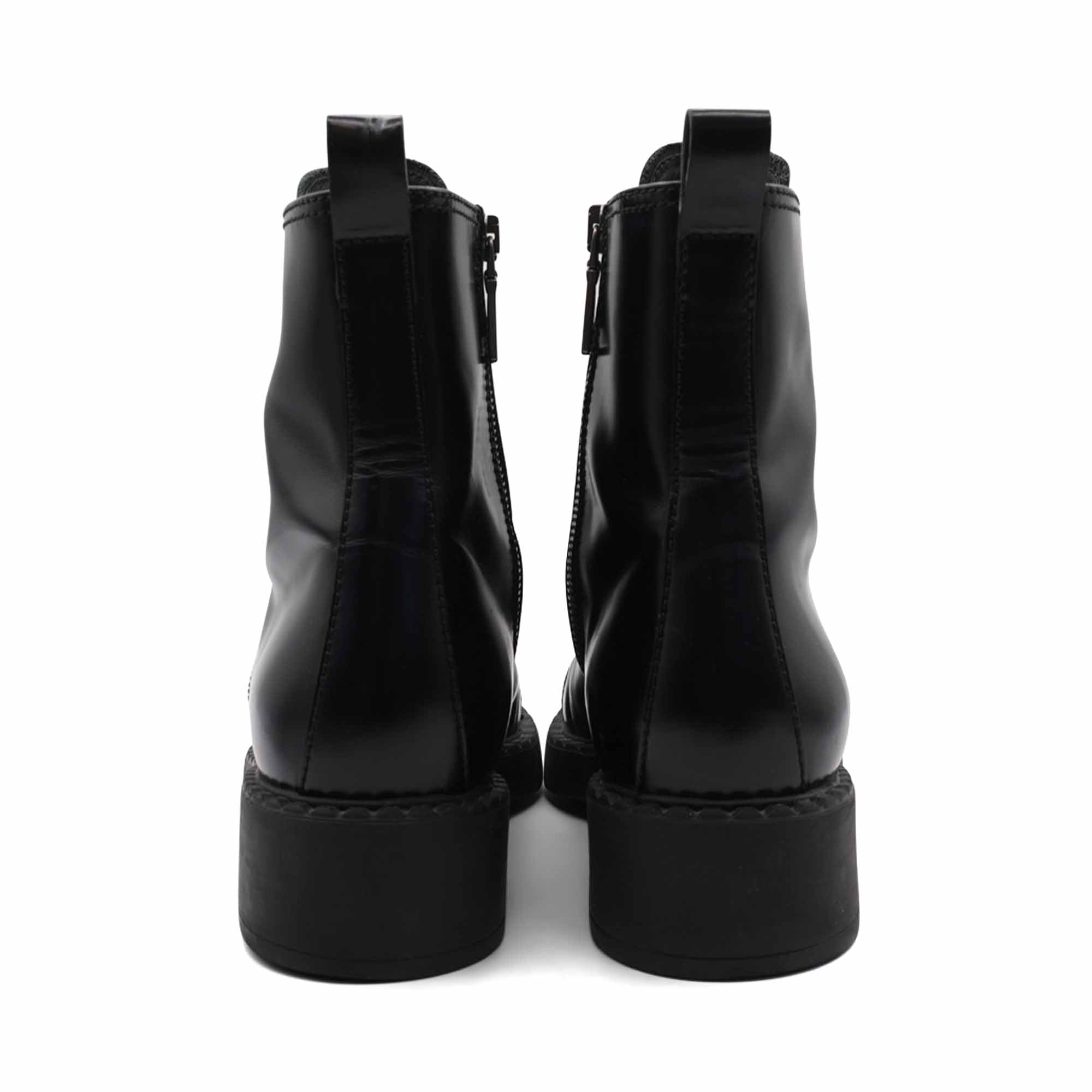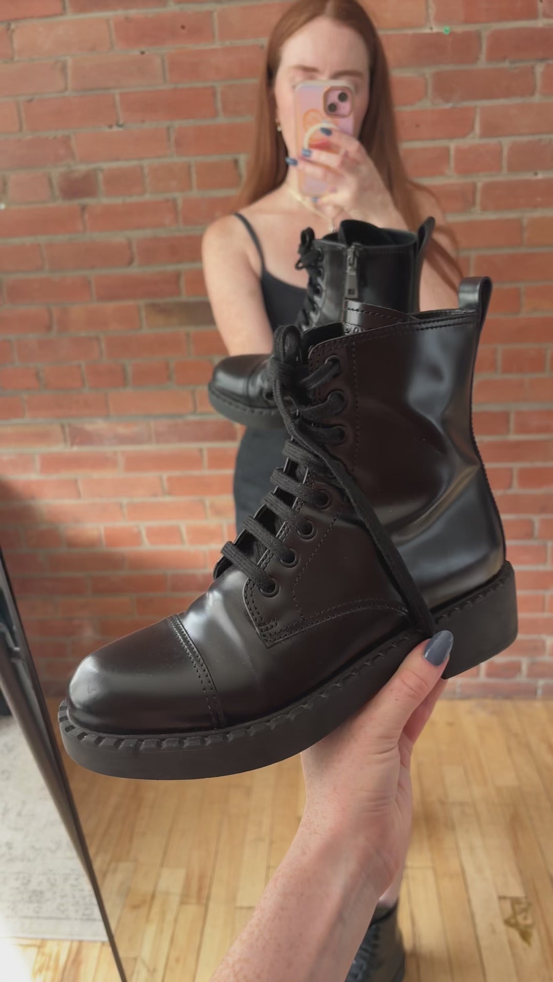 Prada combat boots in black smooth leather with a side zip opening in gunmetal hardware and tonal laces.