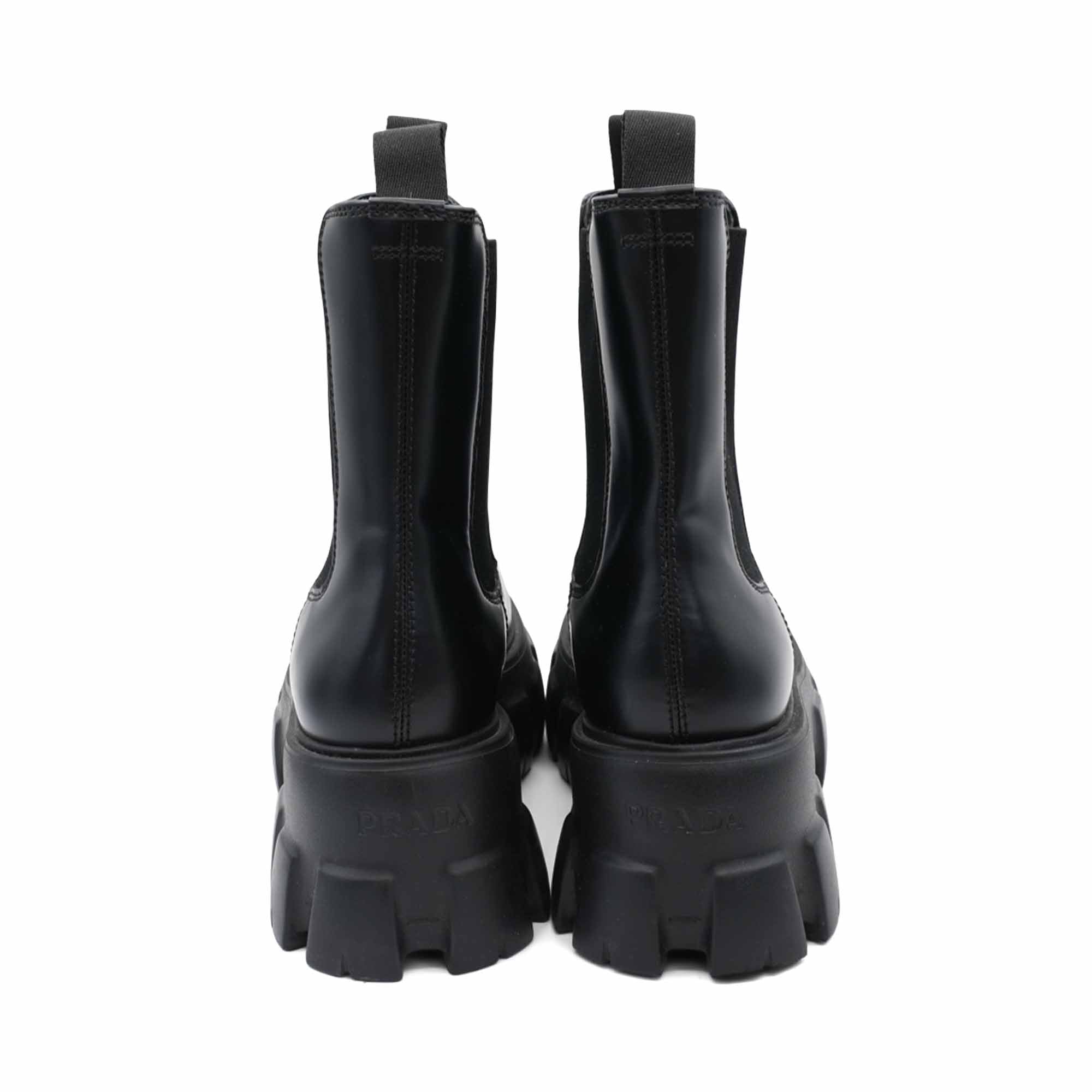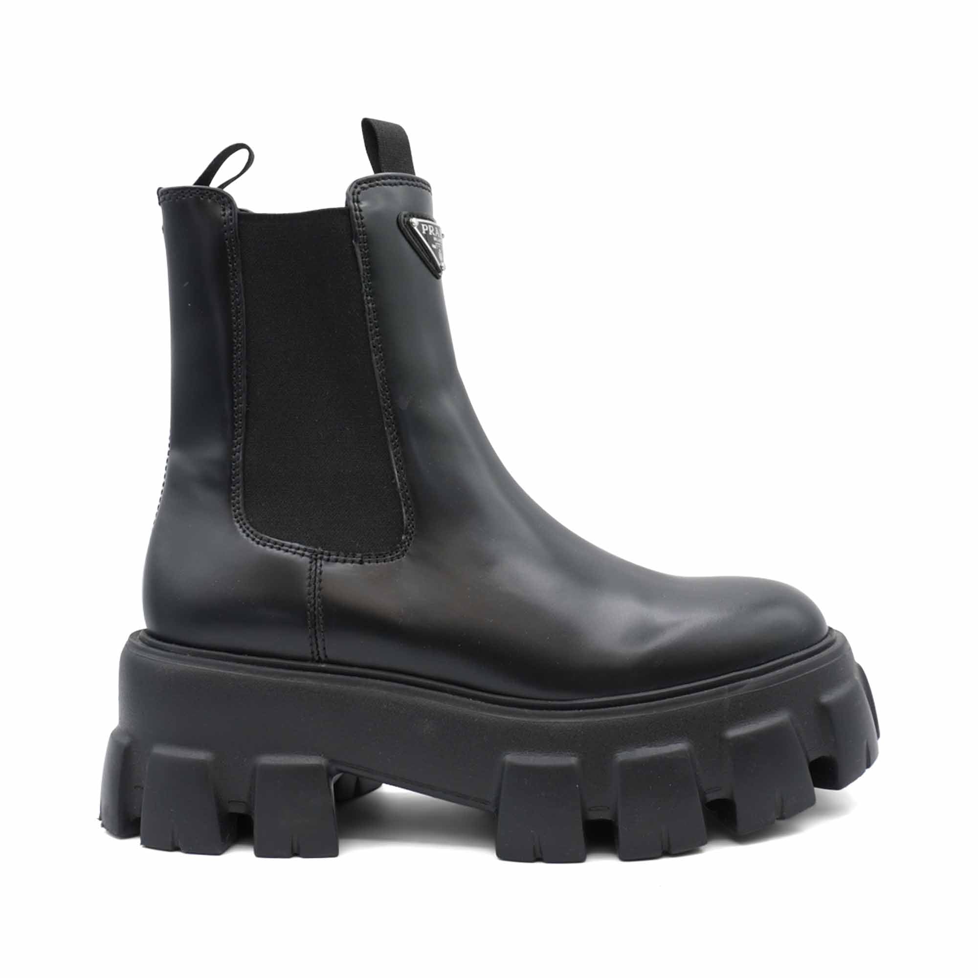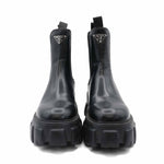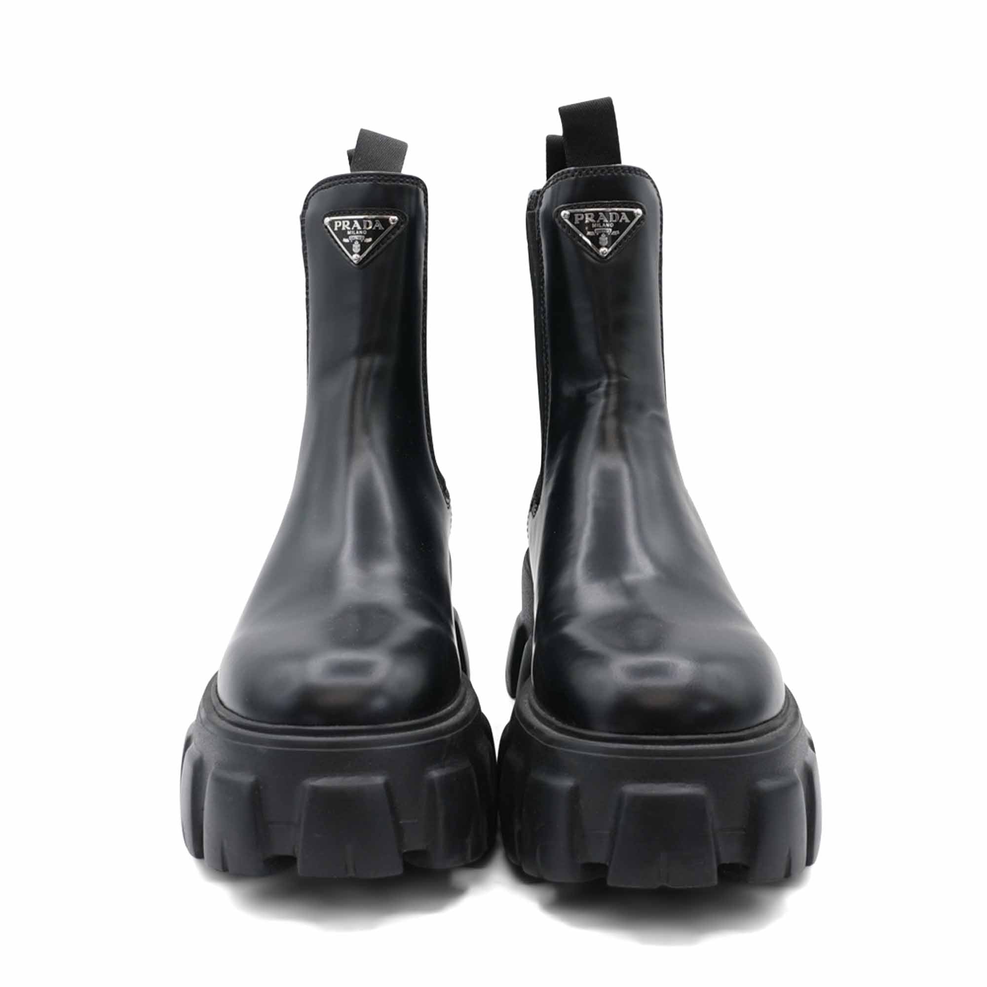 Prada 'Monolith' boots in black smooth leather with an elastic gusset on the sides, a silver triangle logo emblem on the front, and a chunky monolith sole.