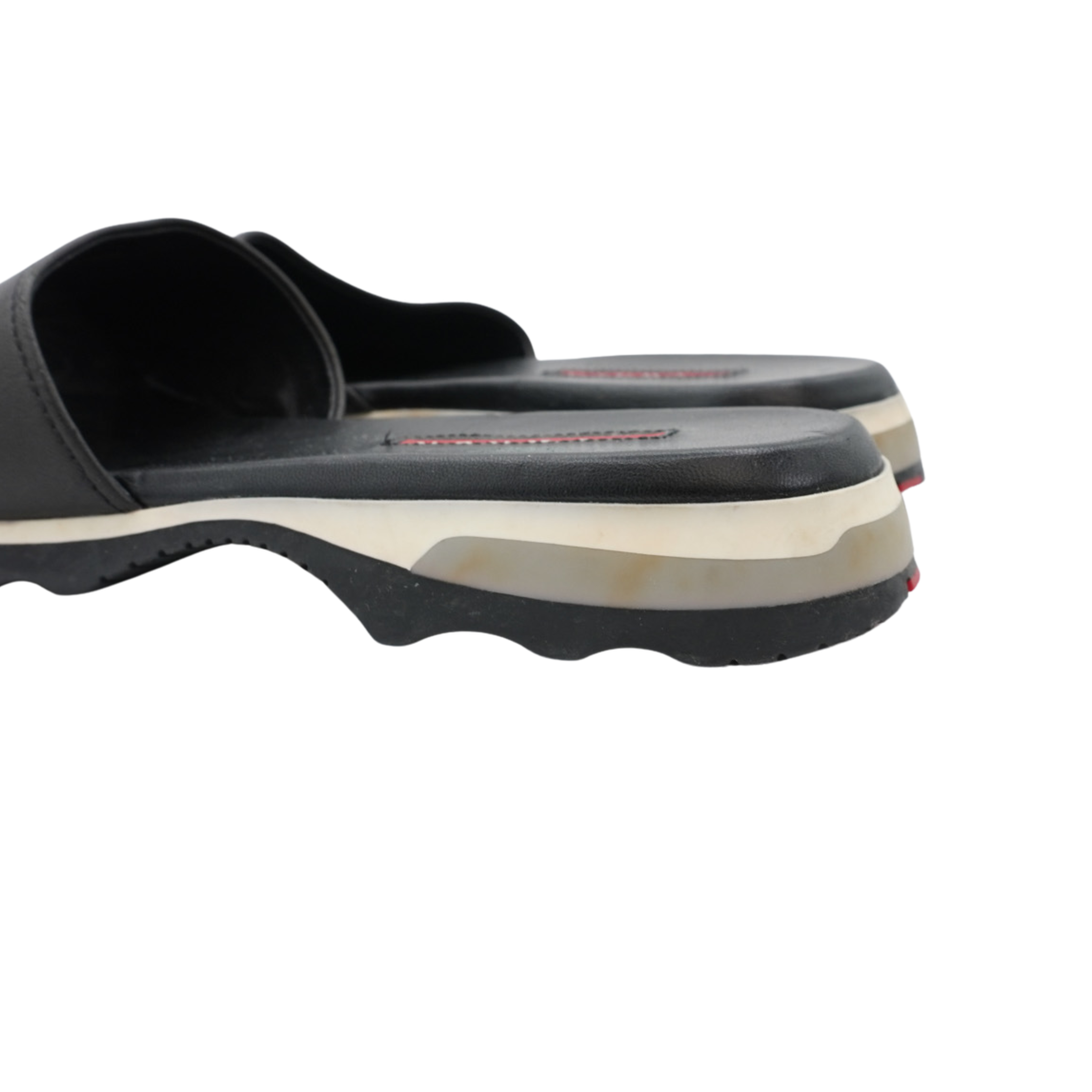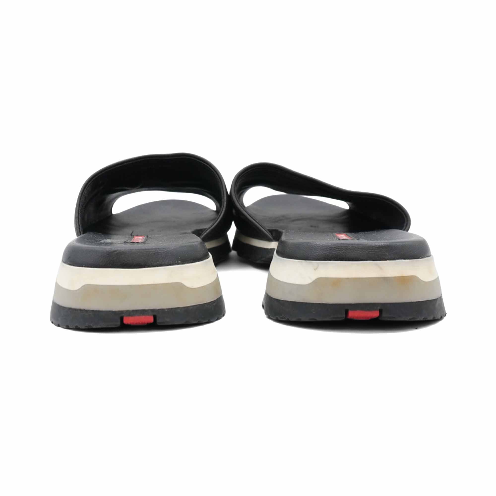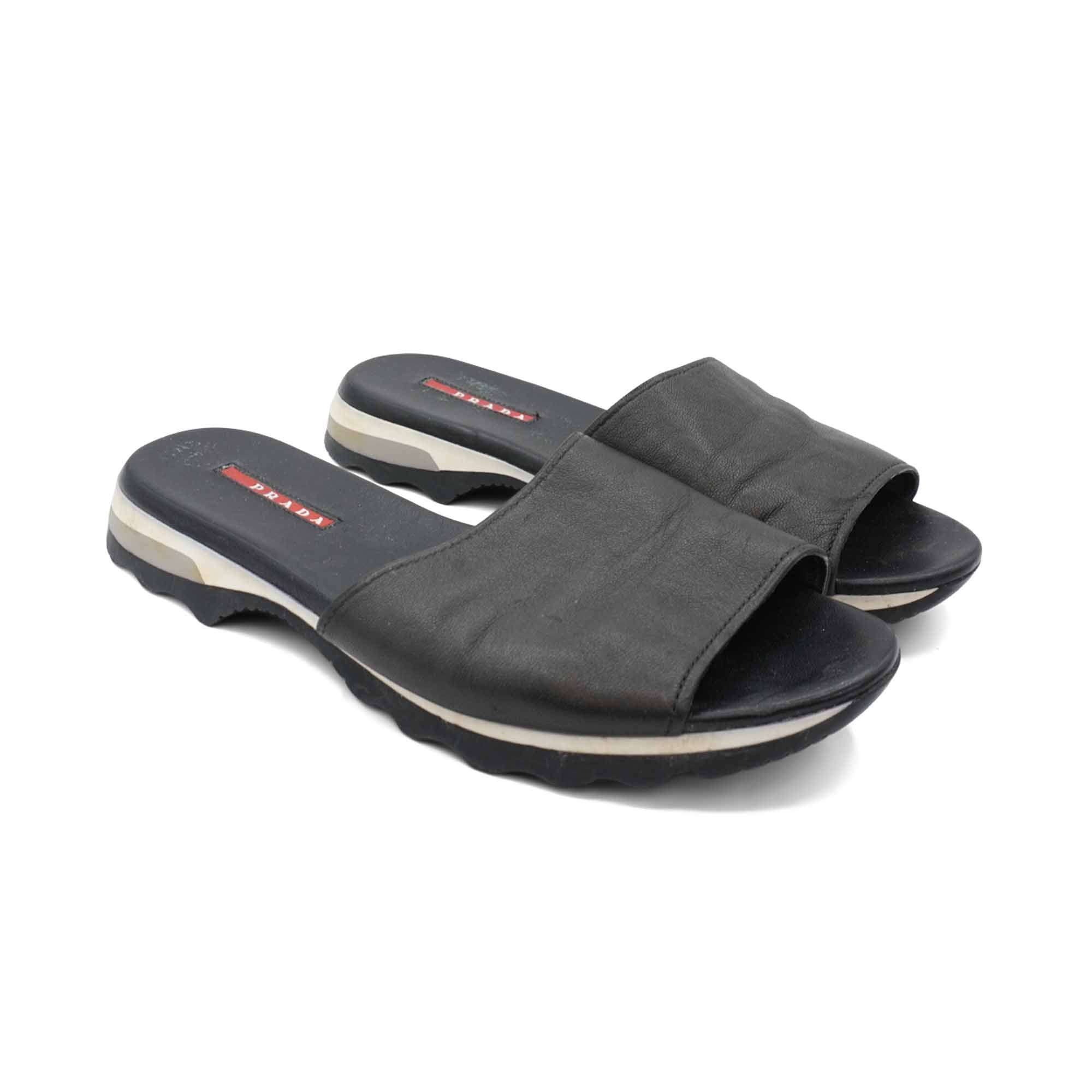 Prada sport slip on sandals in black leather with white and grey rubber sole.