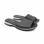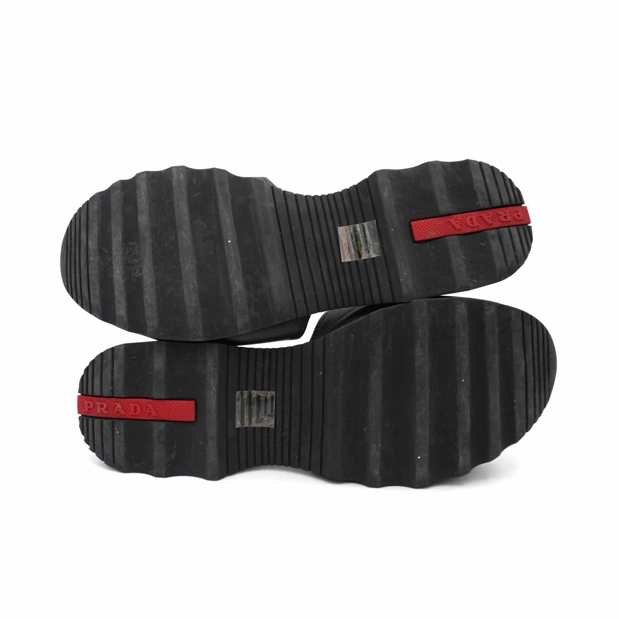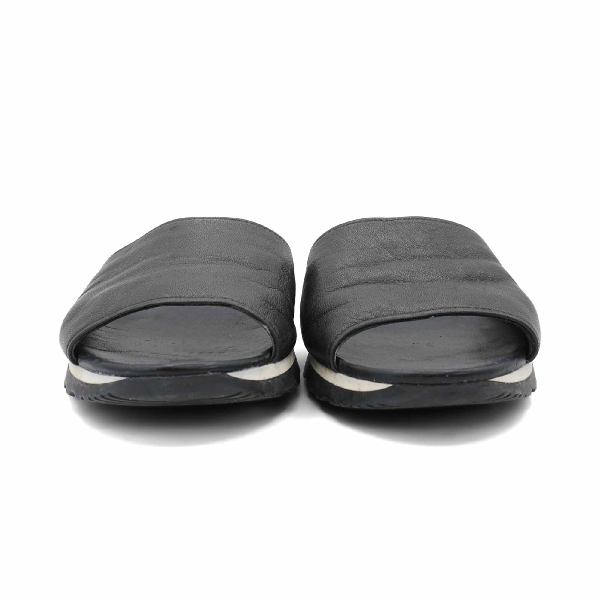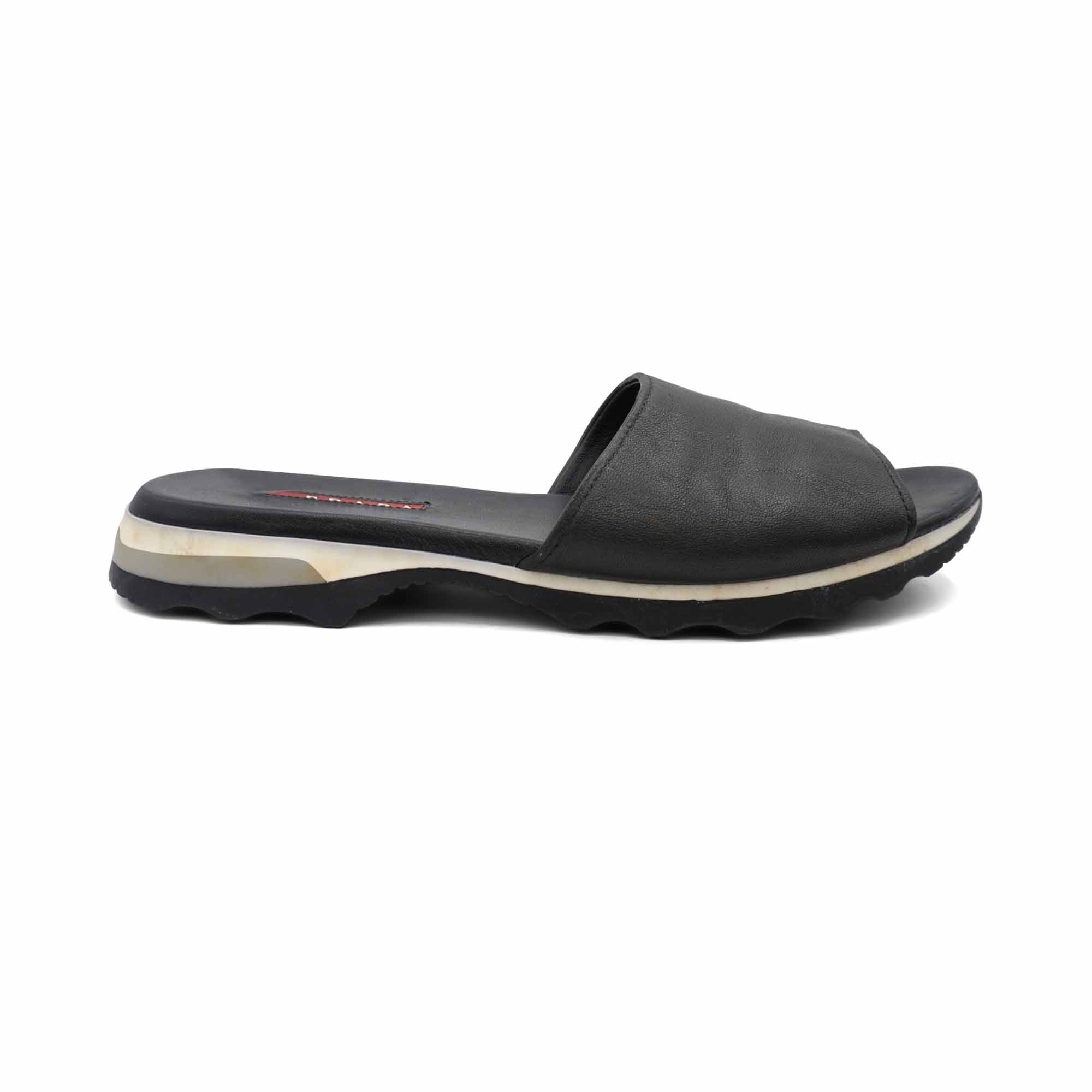 Prada sport slip on sandals in black leather with white and grey rubber sole.