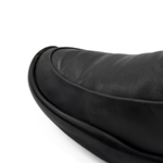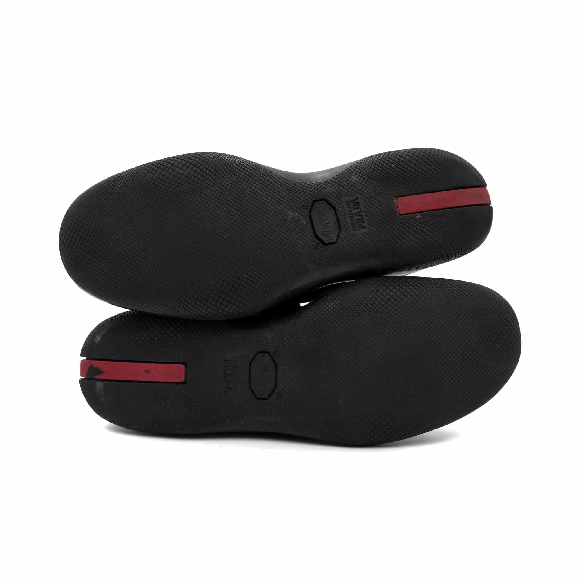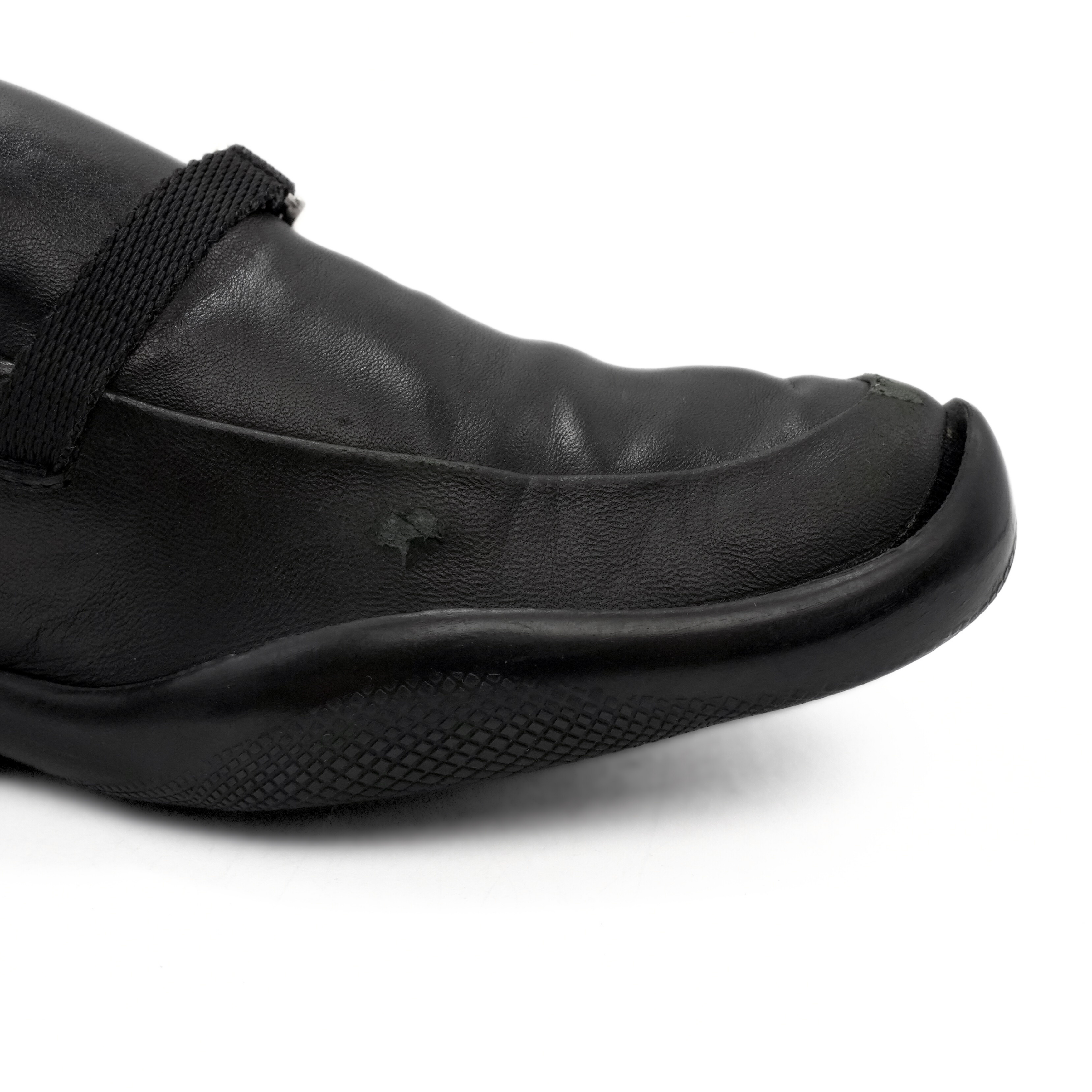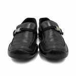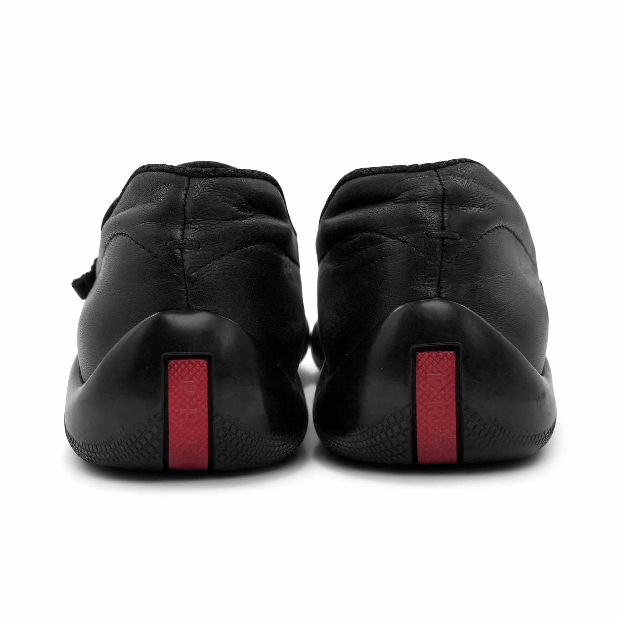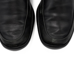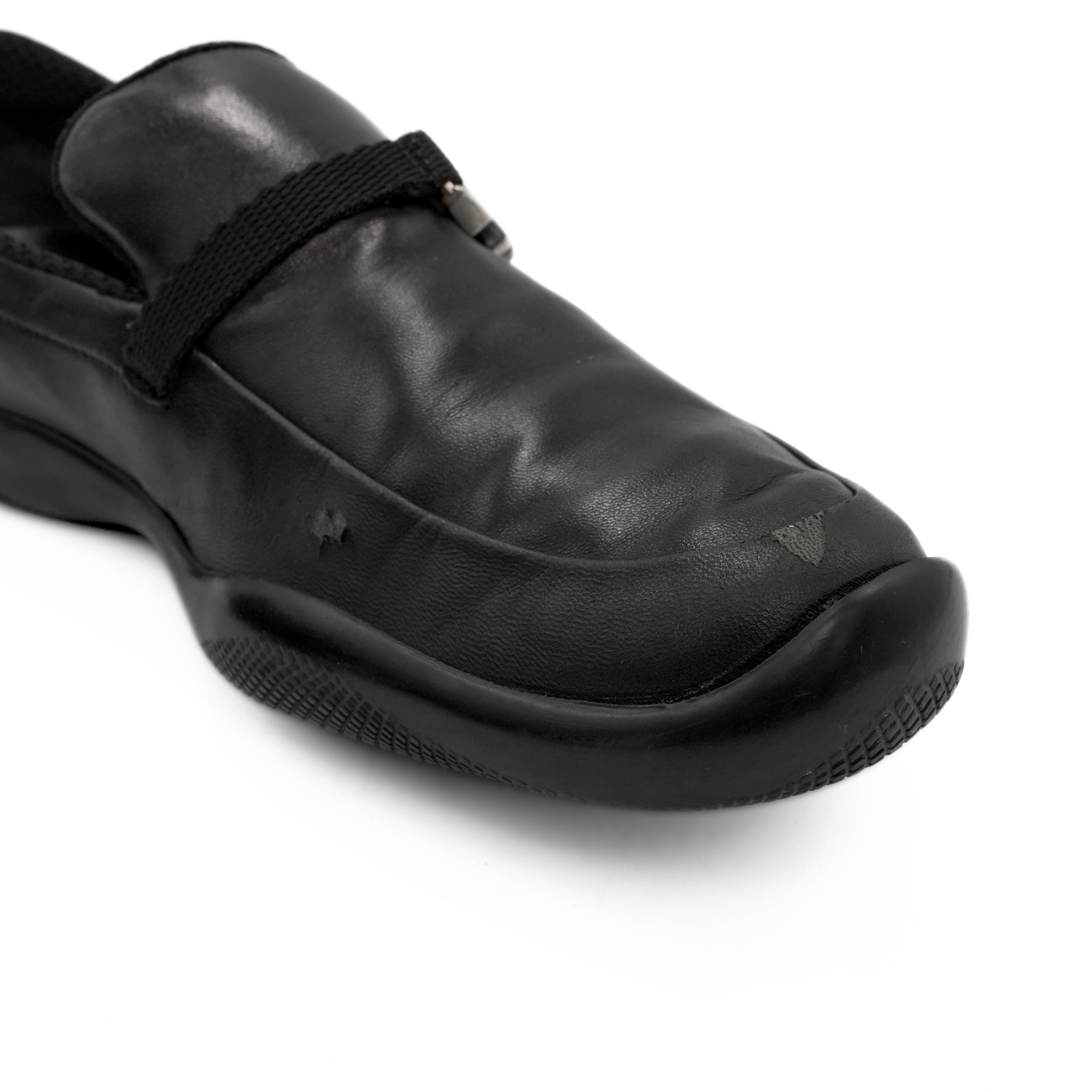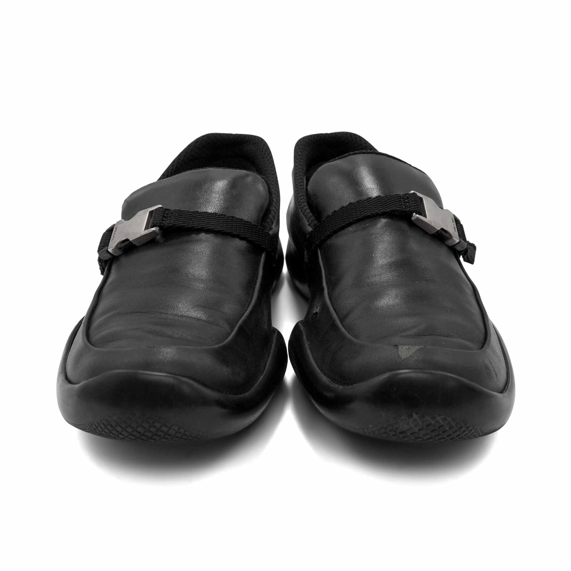 Prada vintage loafers in black leather with a silver buckle detail on the front and a rubber sole with a red stripe detail at the heel.