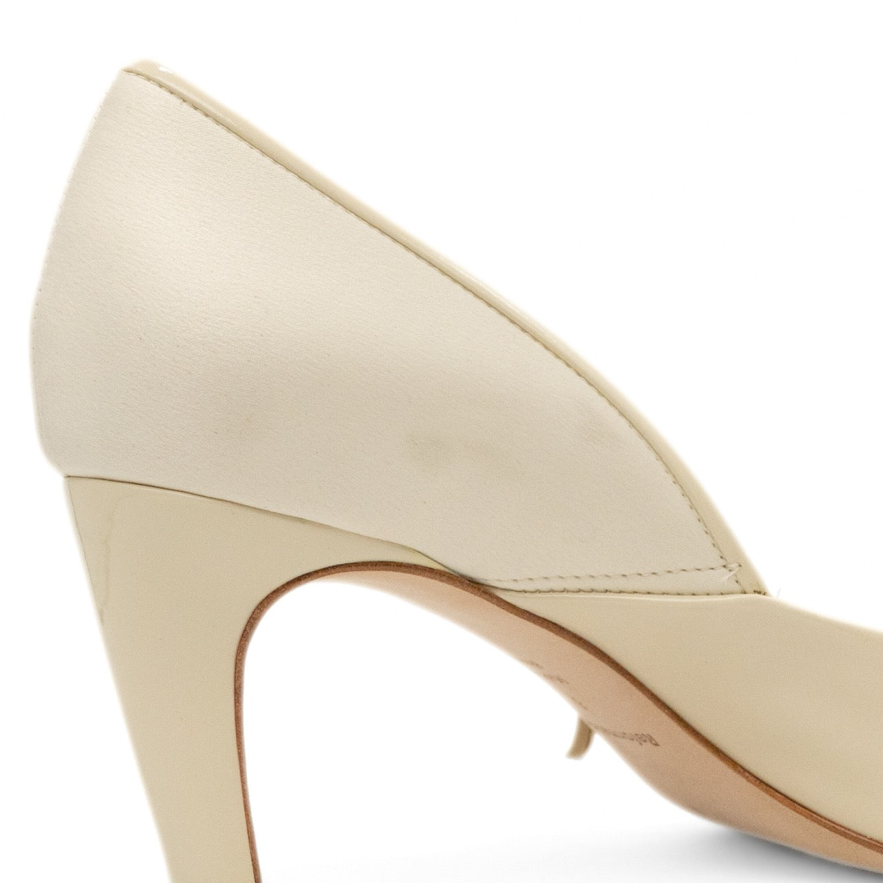 Reformation 'Neve Bow' squared pointed toe pumps in beige patent leather with satin side, heel and counter. Featuring bow detail at the side.