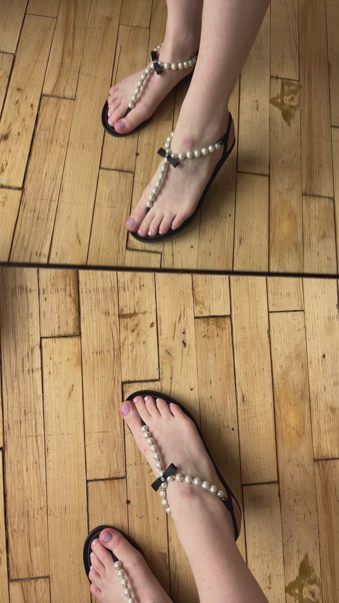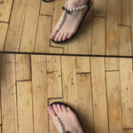 Rene Caovilla 'Pearl' sandals in black leather with a pearl and gold beaded T-strap with a black ribbon bow detail.