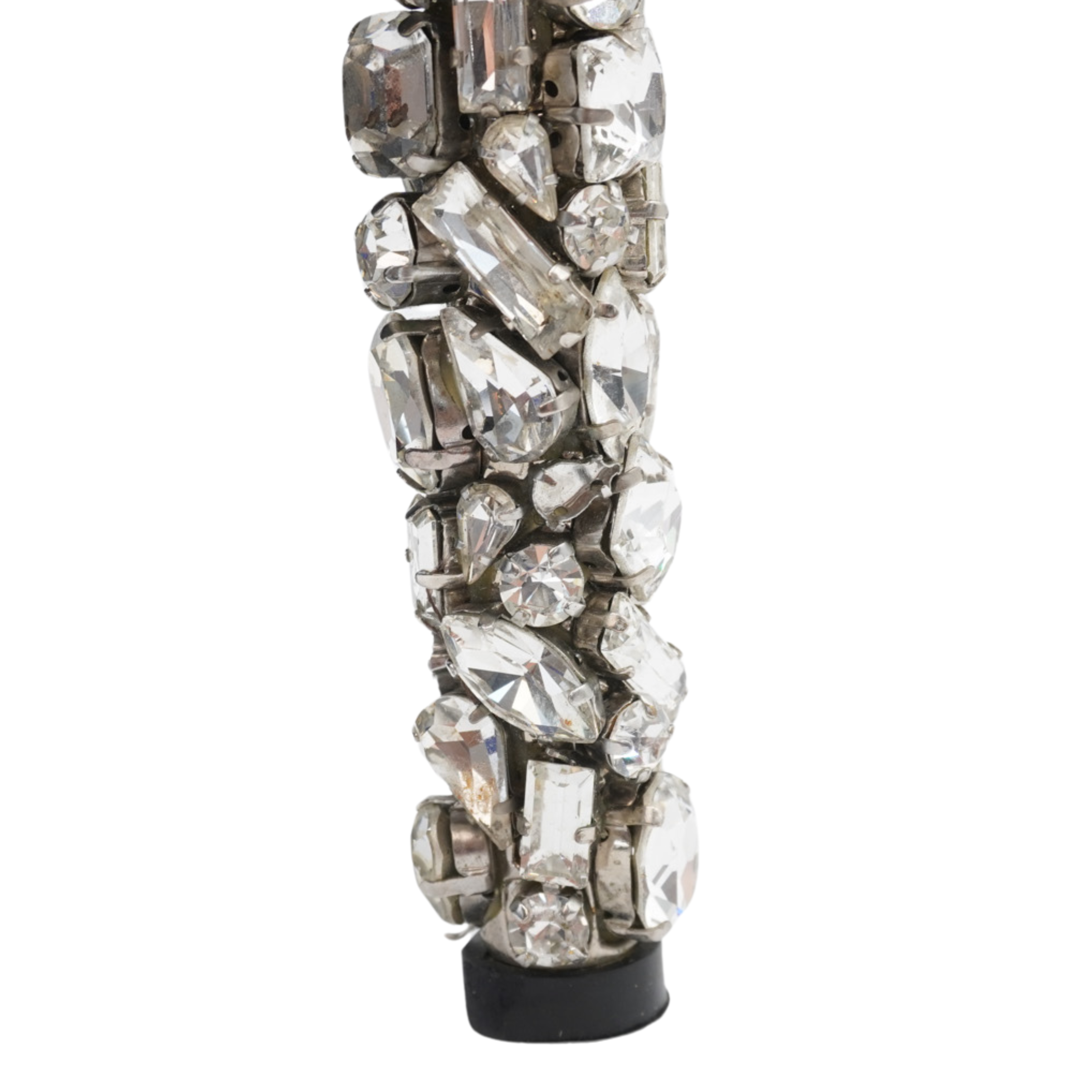 As is. Wear to velvet throughout shoe, staining in velvet at toe strap, missing some crystals in heels.