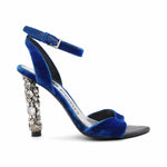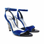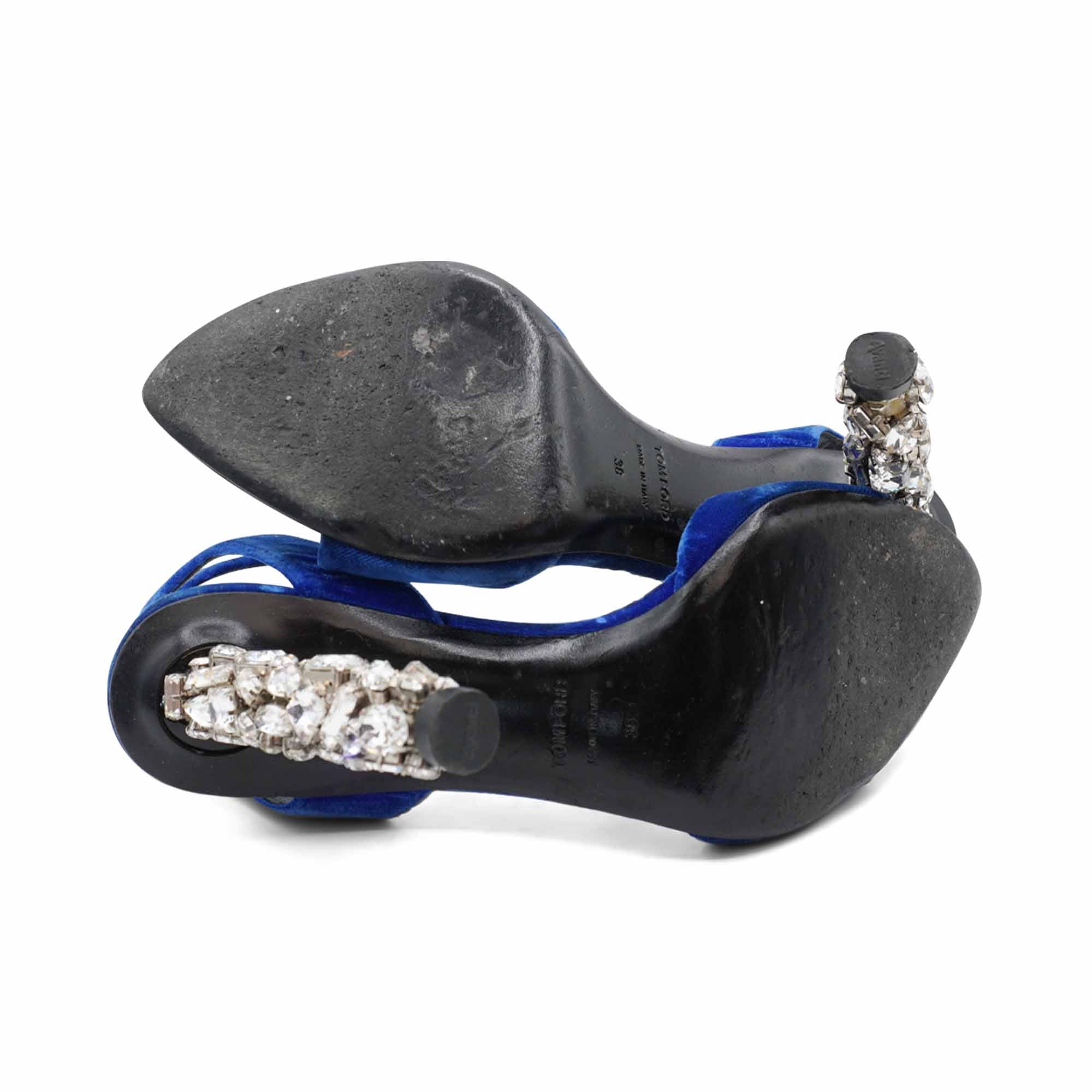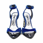 Tom Ford pumps in blright blue velvet with a black patent pointed toe, an ankle strap with silver buckle hardware, and a stiletto heel with large crystal embellishments.
