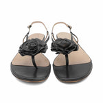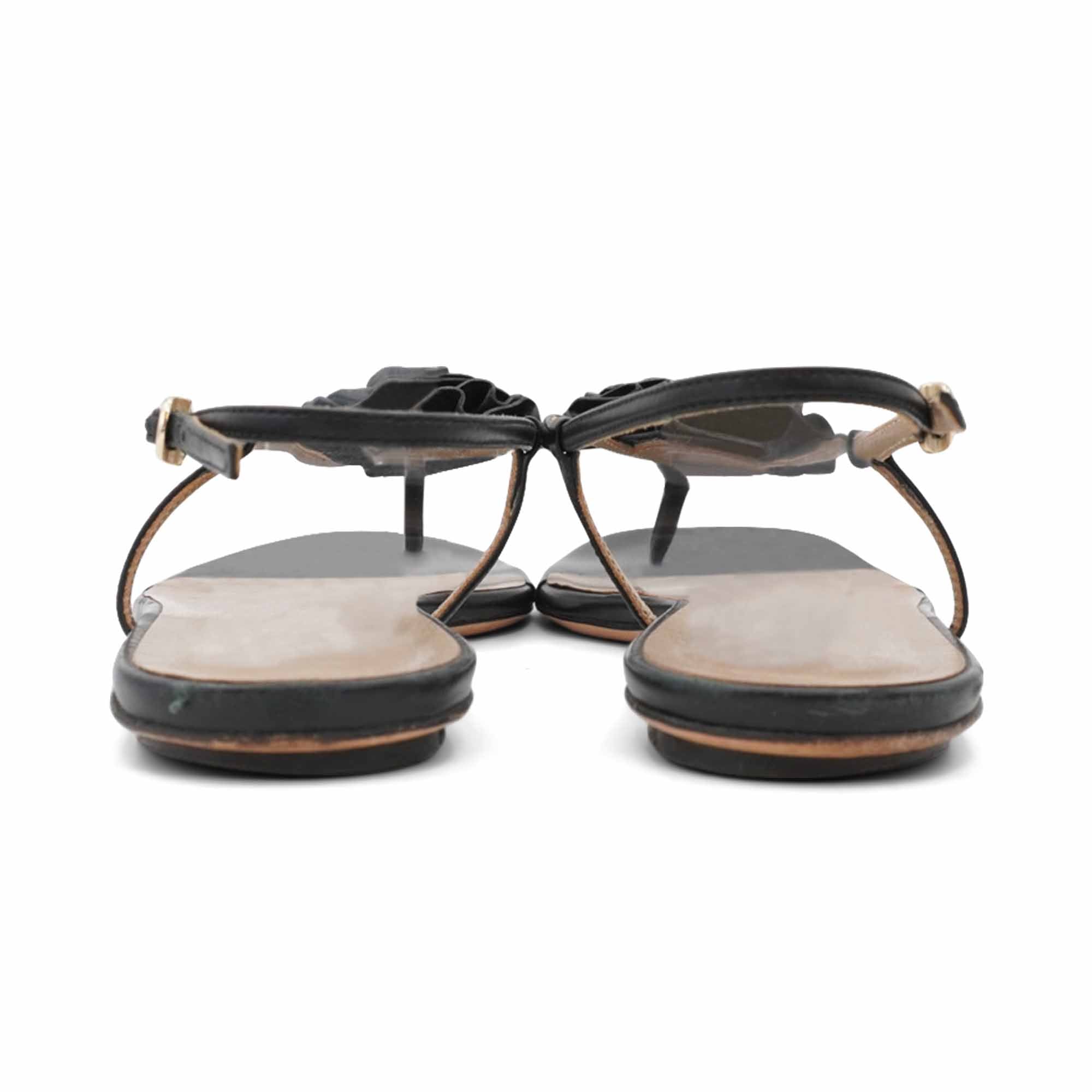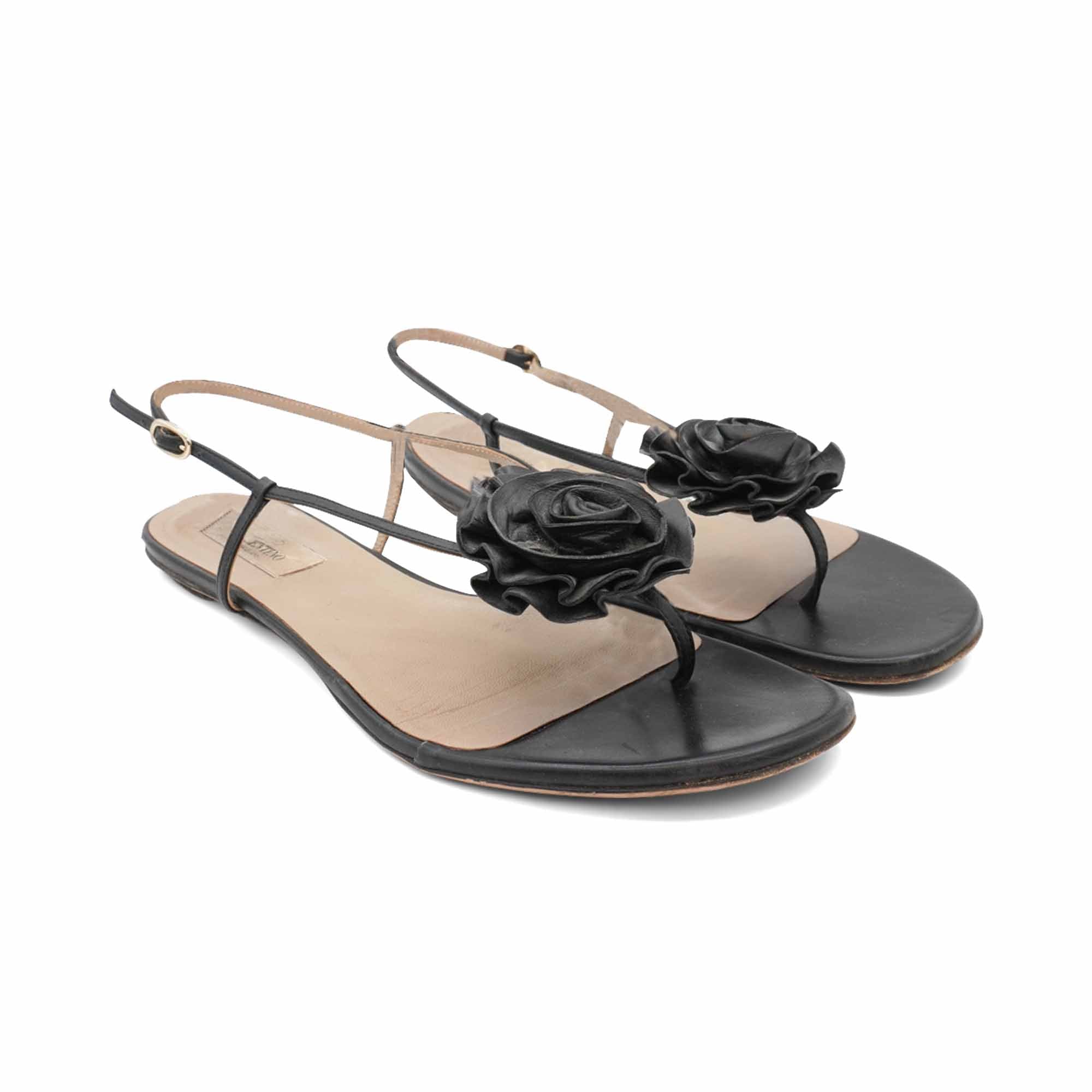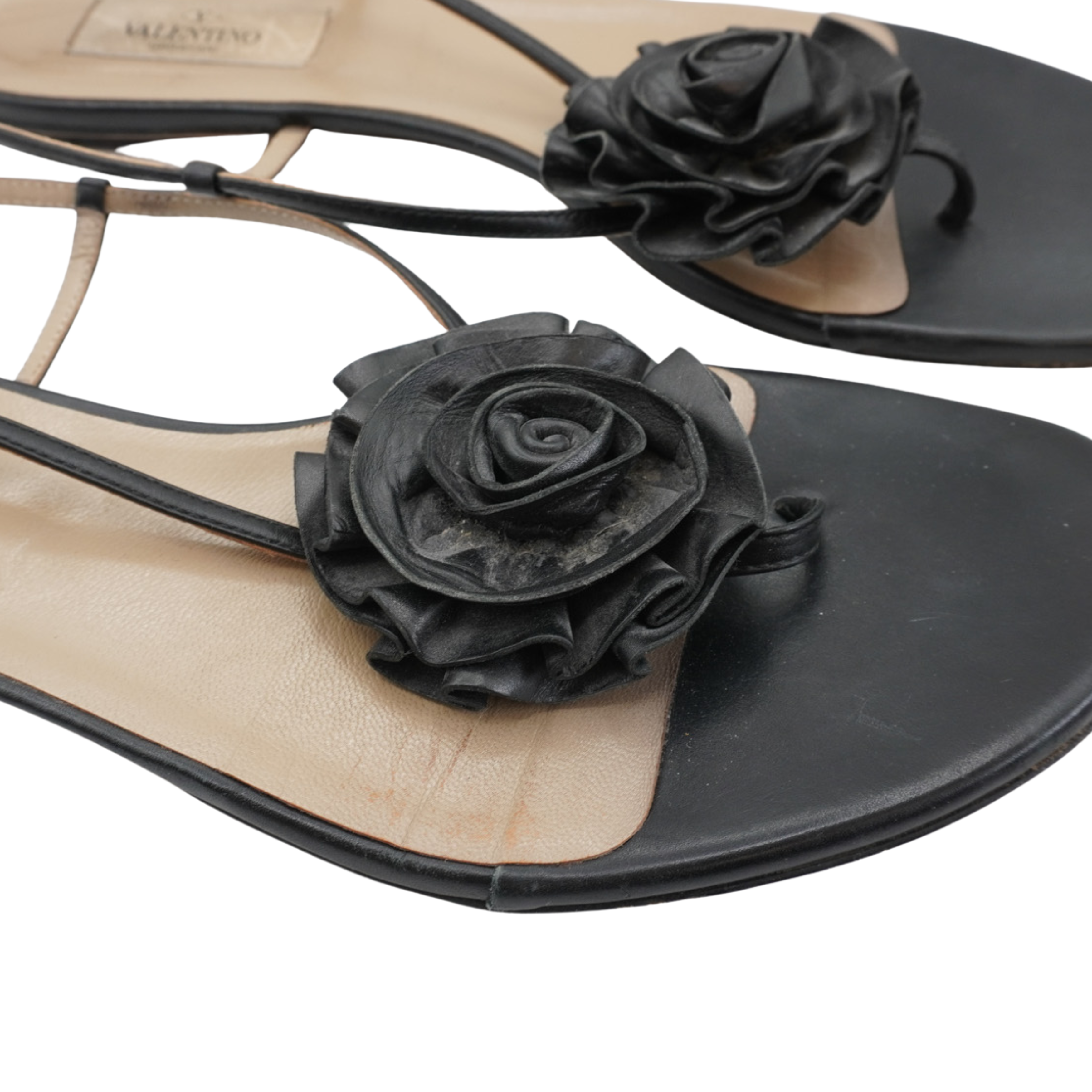 Valentino sandals in black leather with thin straps, a gold buckle closure at the ankle, and a large leather flower applique at the toe.