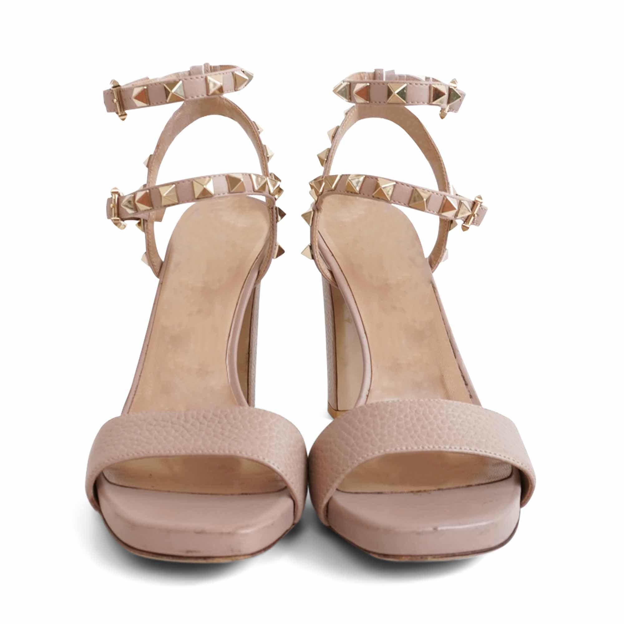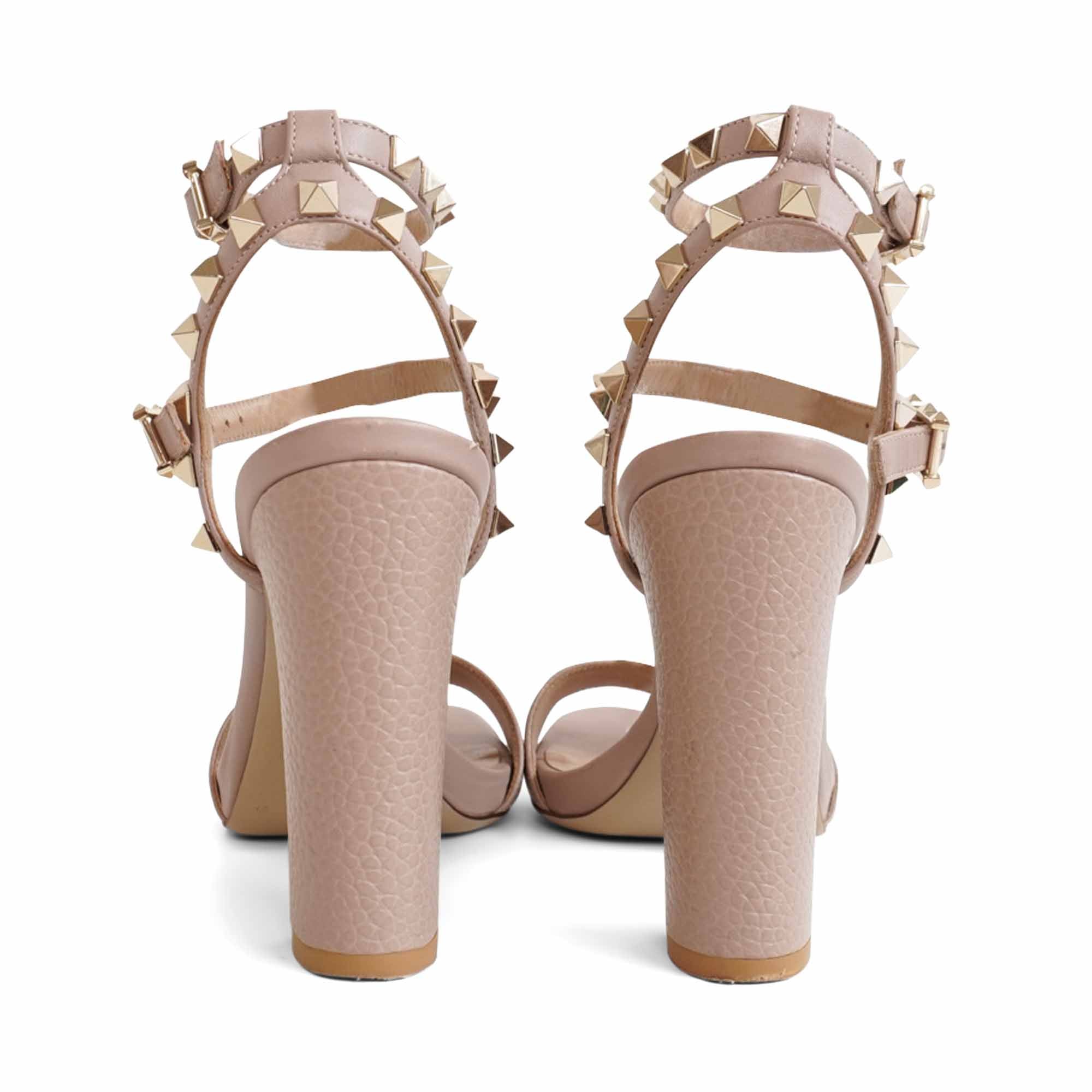 Valentino strappy heels in blush pink leather with gold rockstud ankle straps and a block heel.