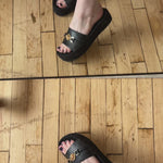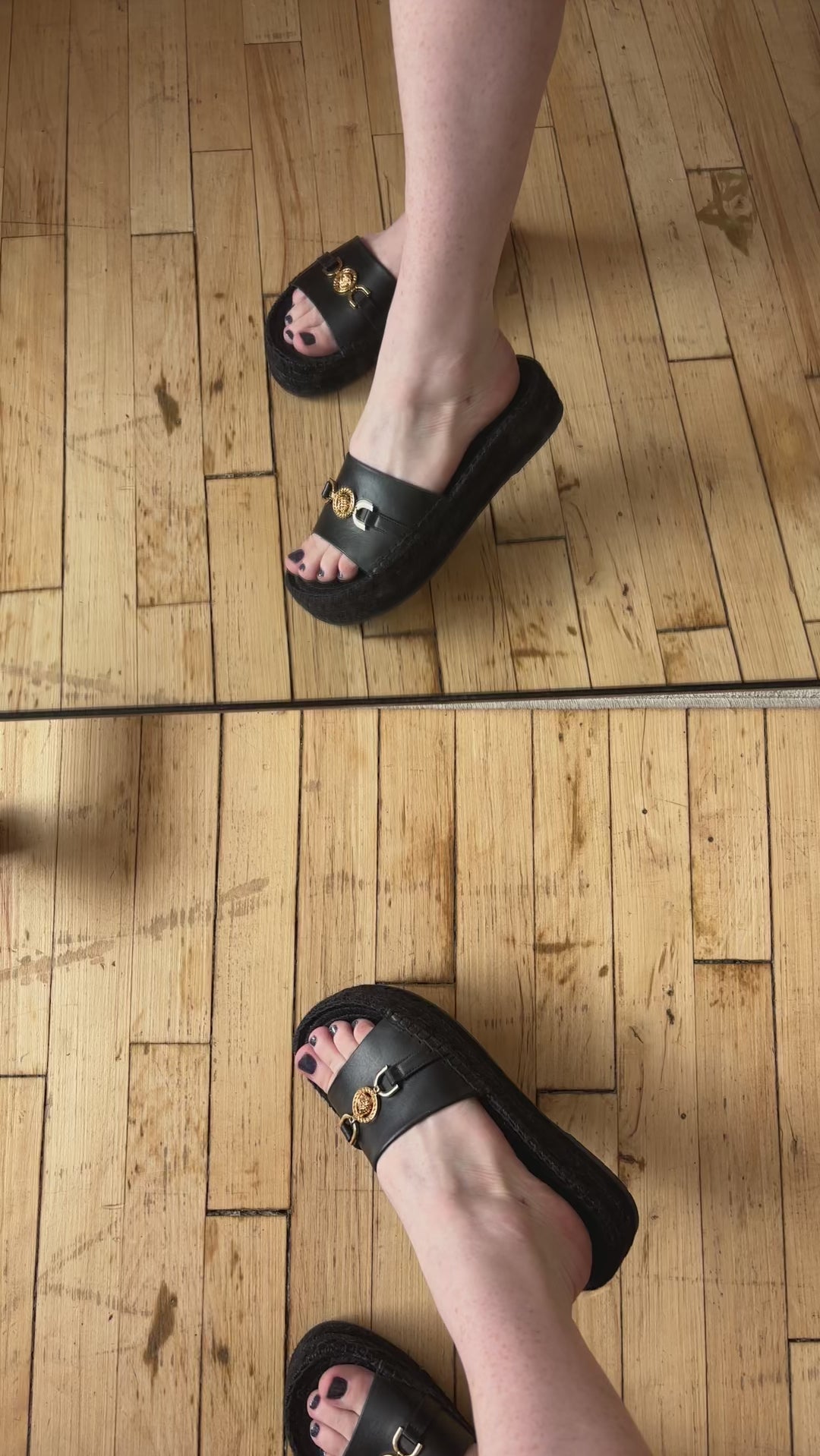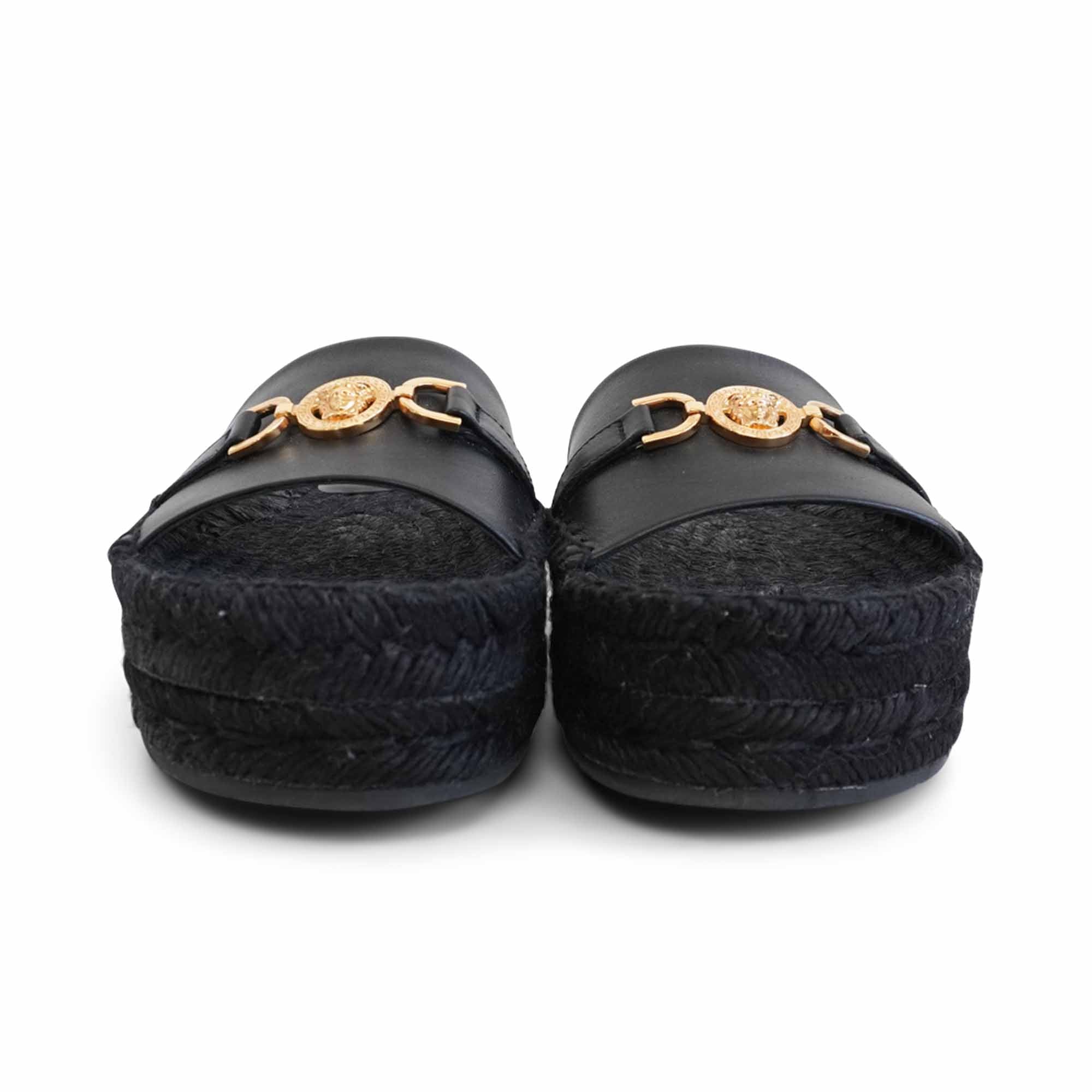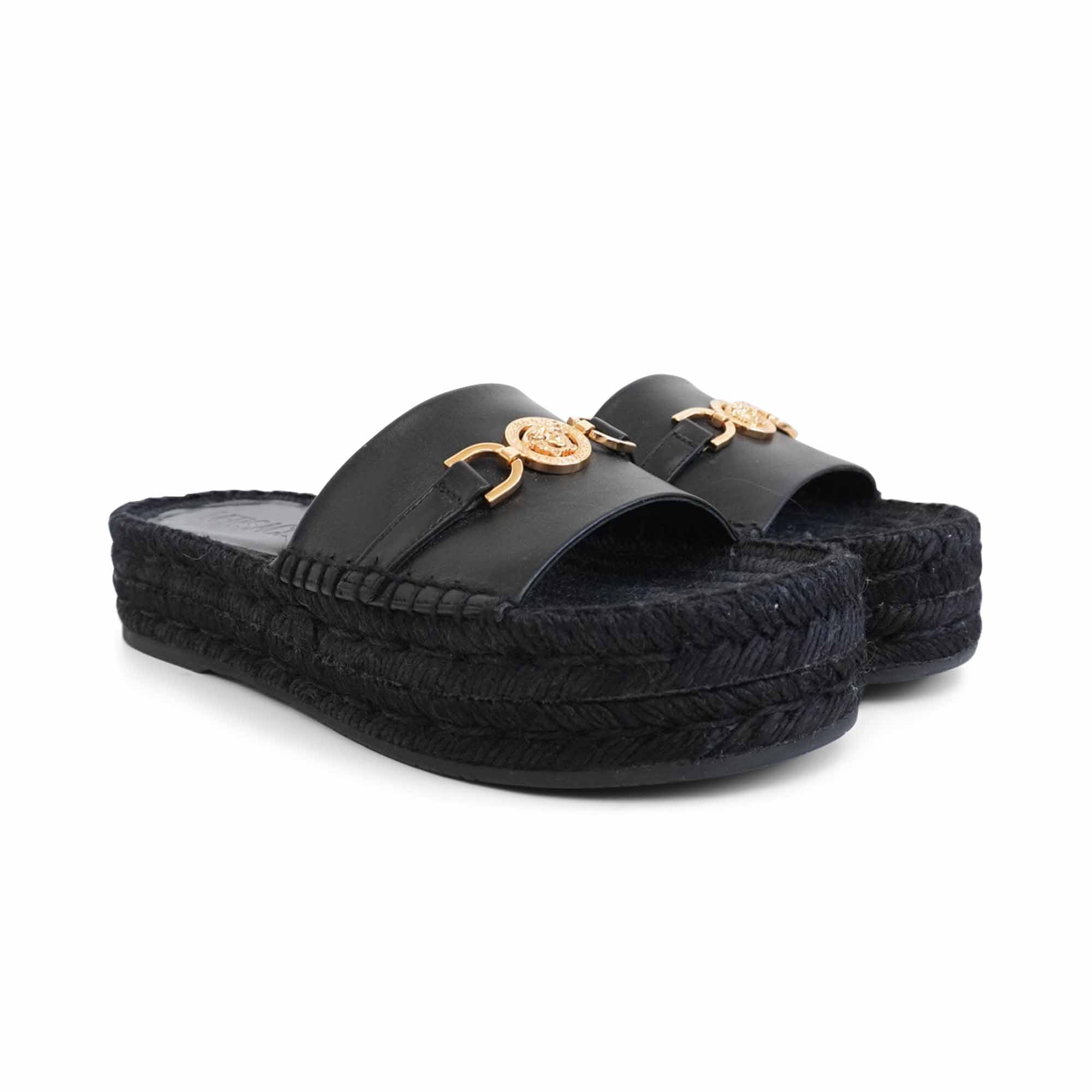 Versace 'Medusa '95' slide sandals with black leather strap featuring gold Medusa head buckle and platform espadrille soles.