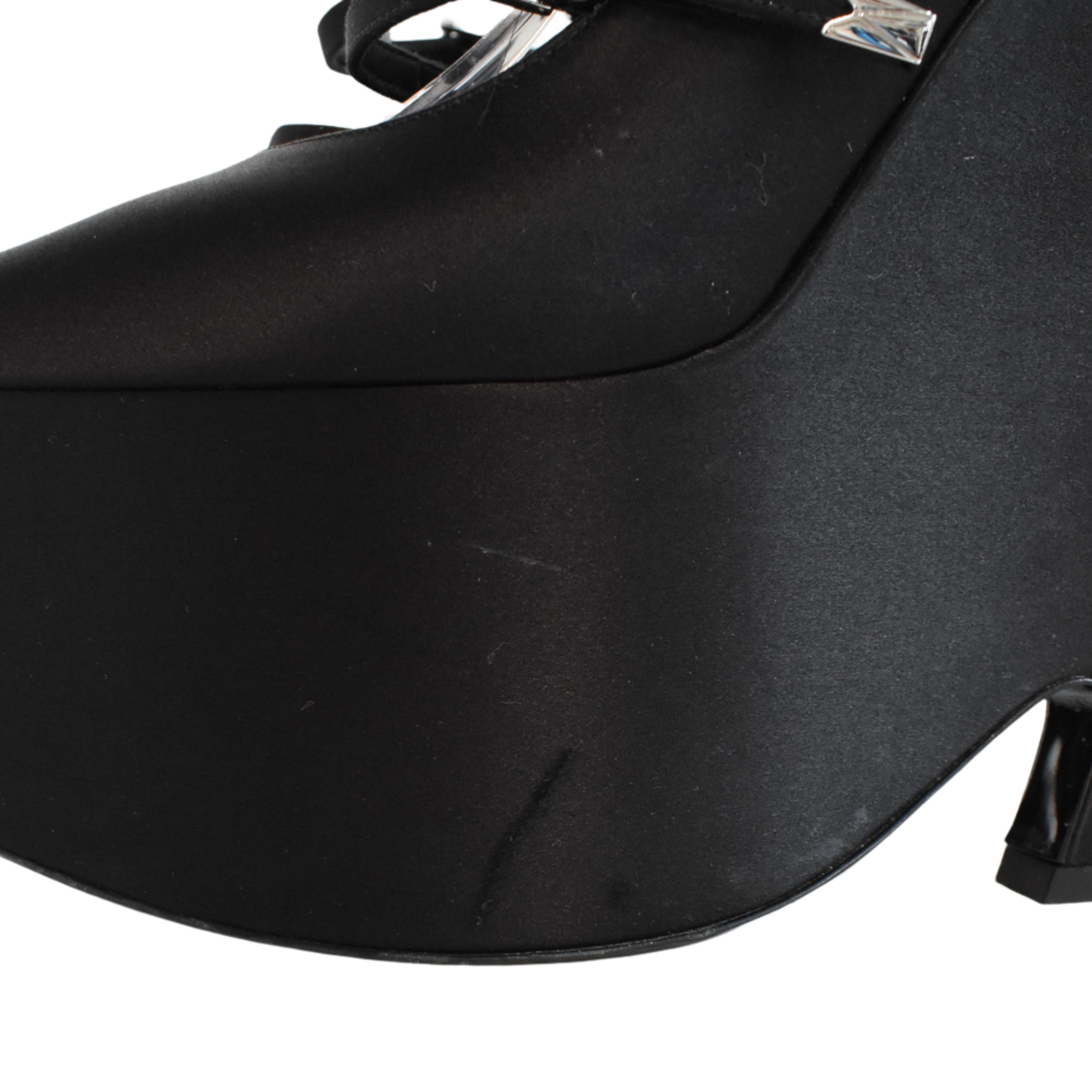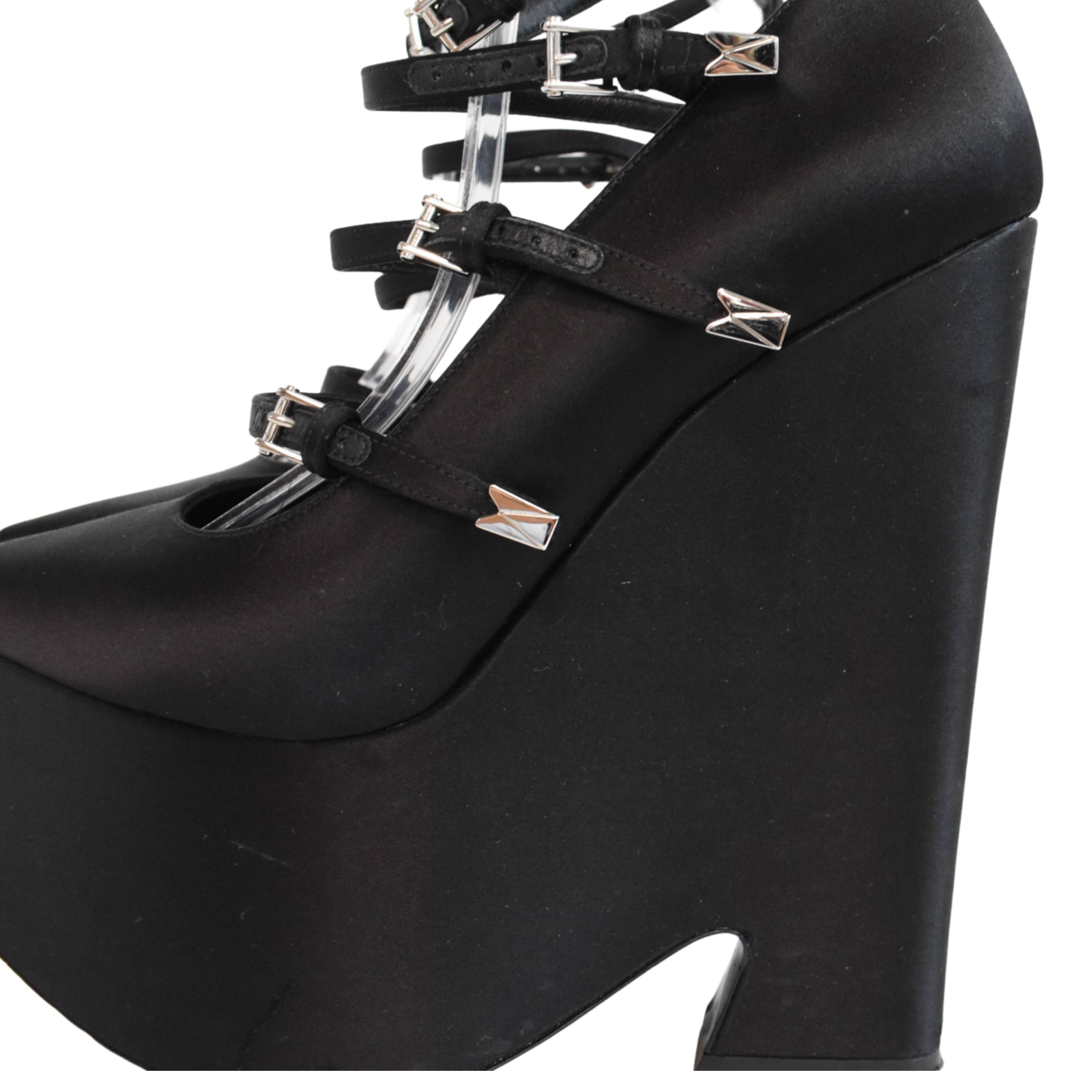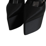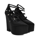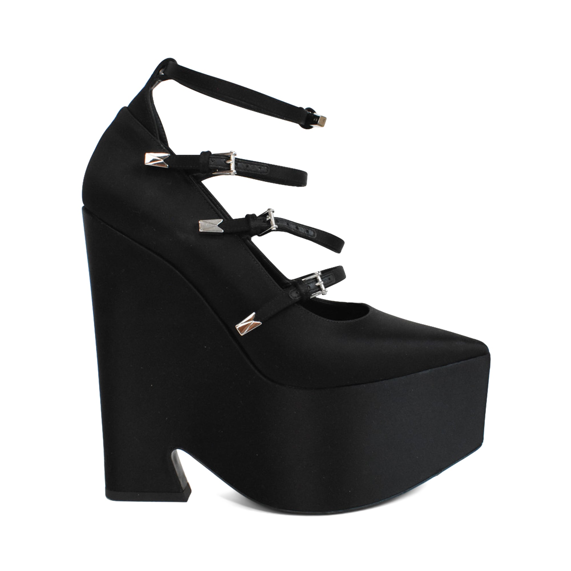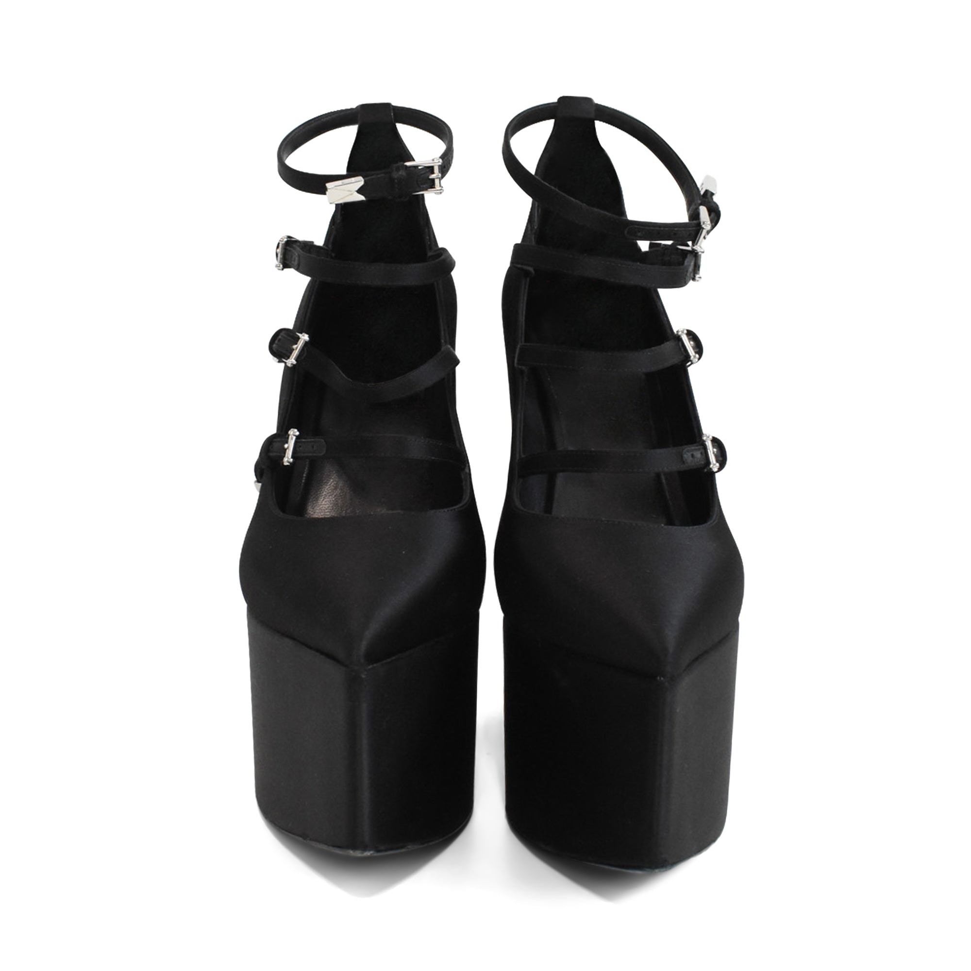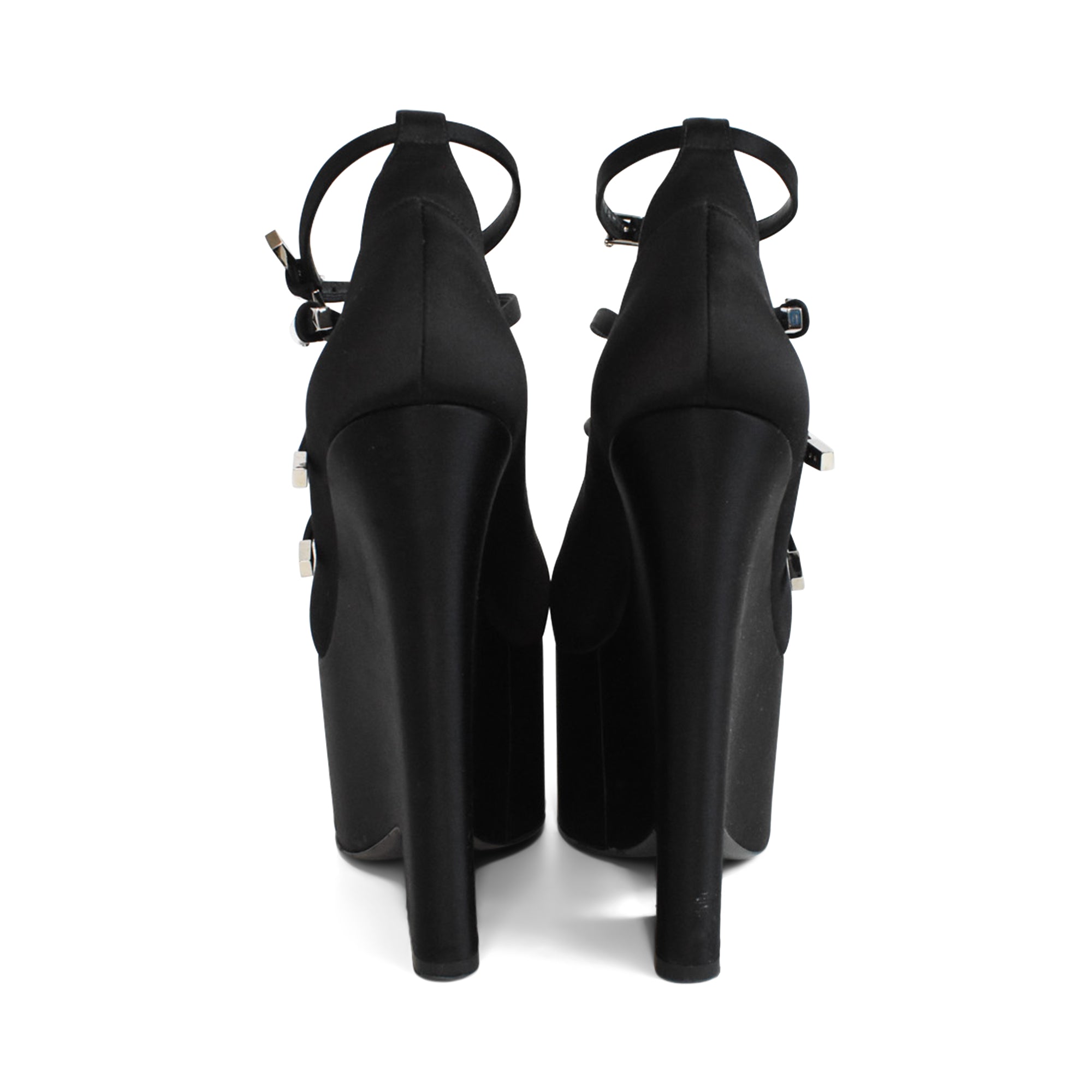 Versace 'Tempest' platform heels in black satin with 4 straps with silver buckle hardware, a wedge heel, and a pointed toe.
