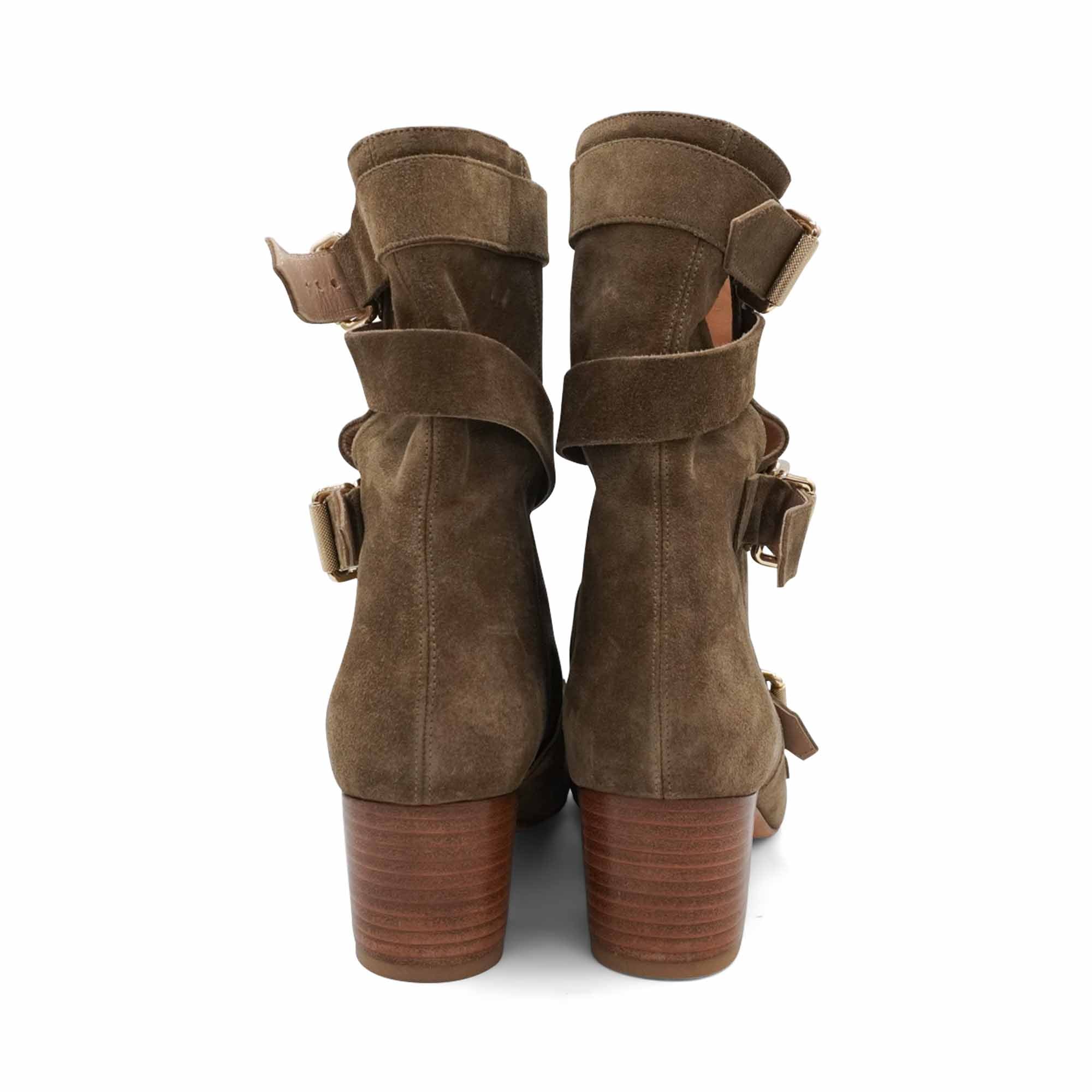 Zadig & Voltaire ankle boots in an olive green suede with a pointed toe, a stacked heel, and four straps going up boot with the gold tone buckle hardware.