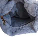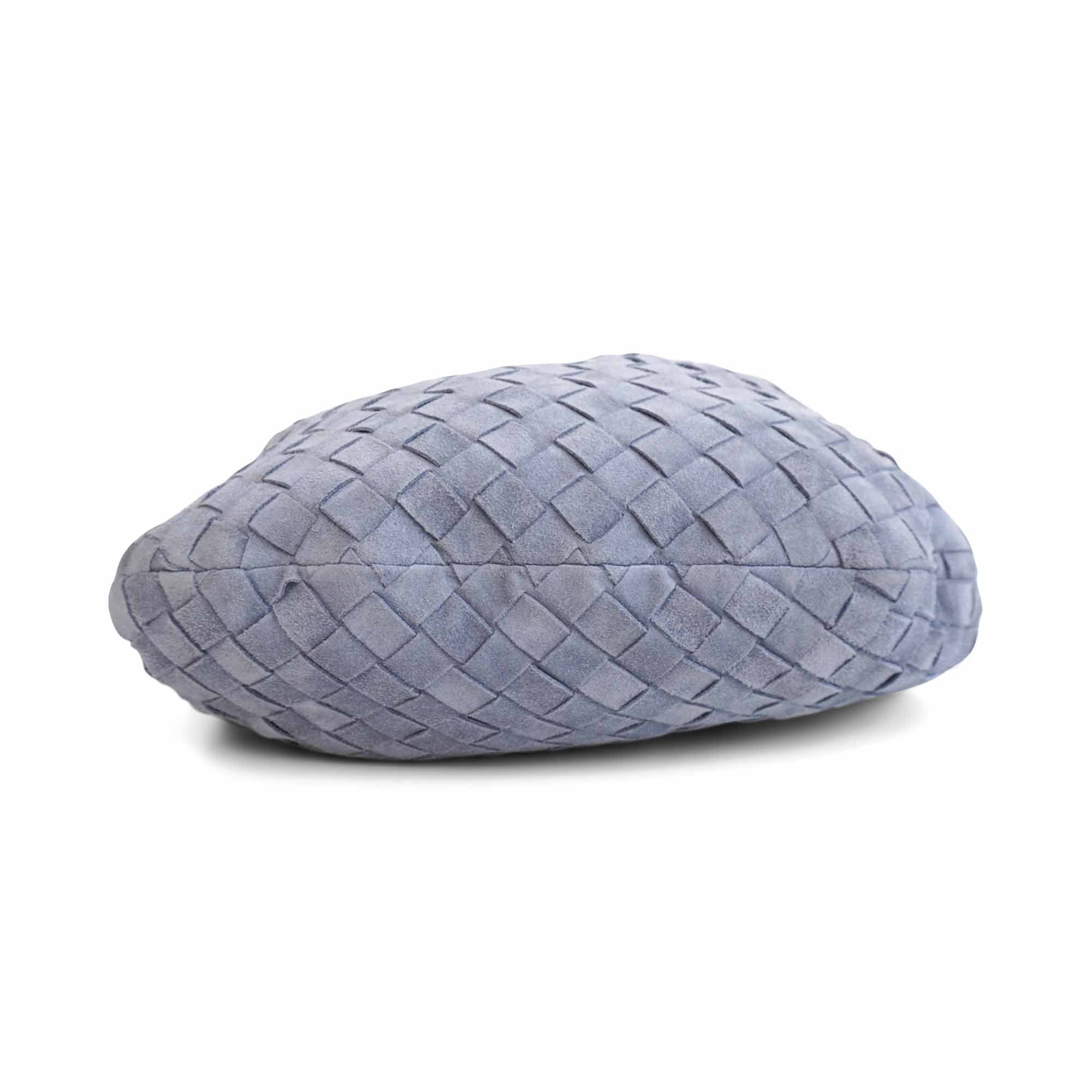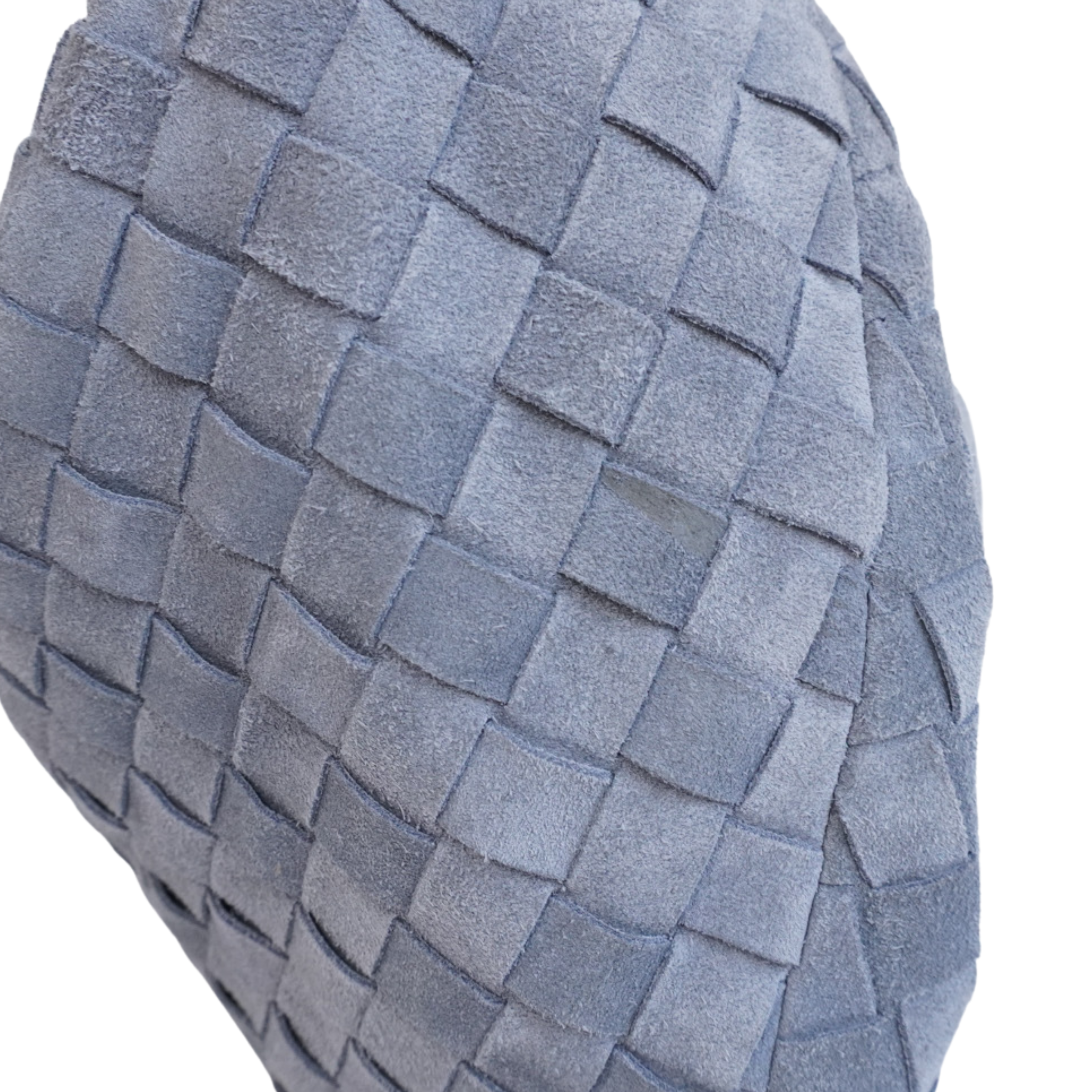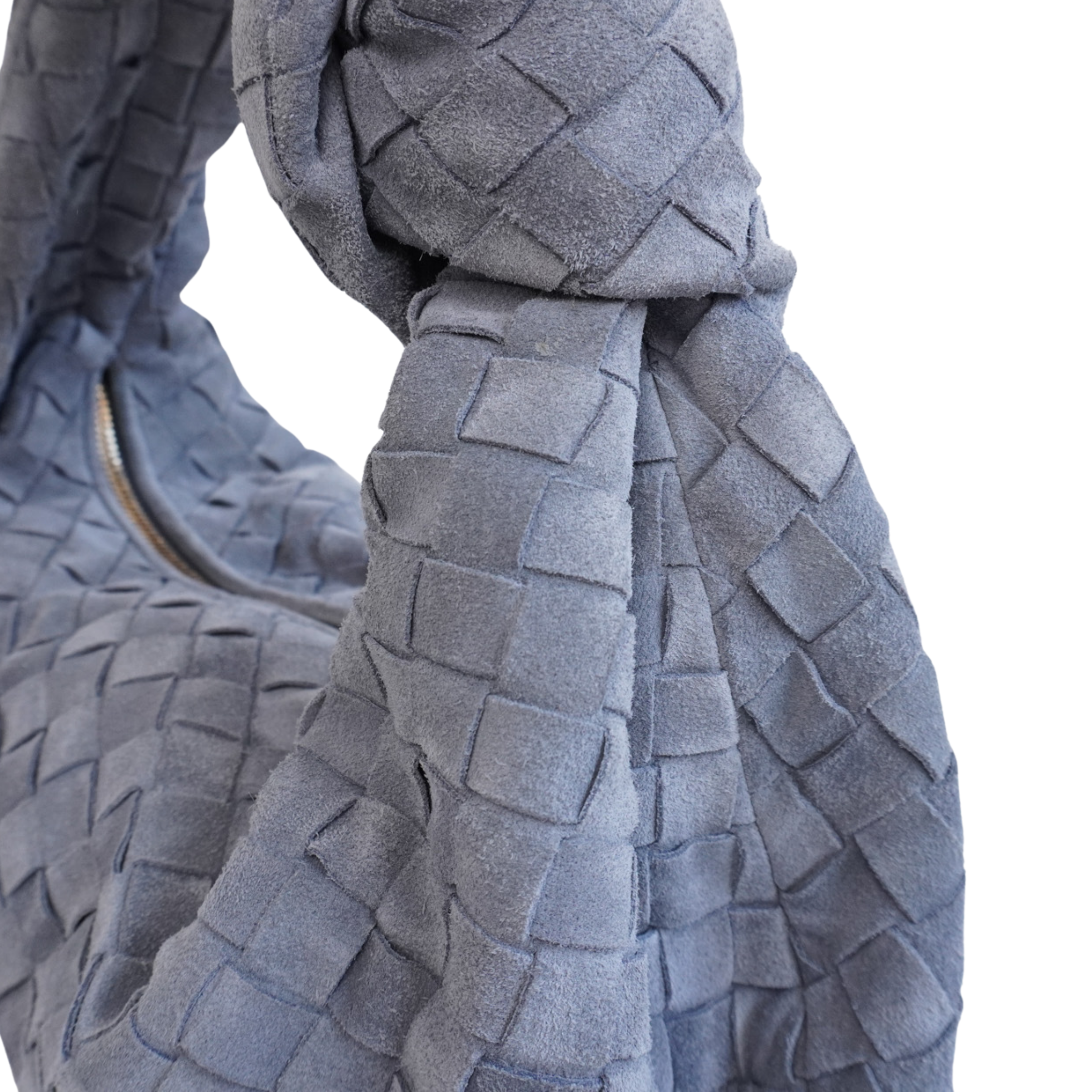 Bottega Veneta 'Teen Jodie' shoulder bag in intrecciato woven grey suede with gold hardware. Features a signature knotted strap and single zip pocket with grey suede lining.