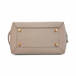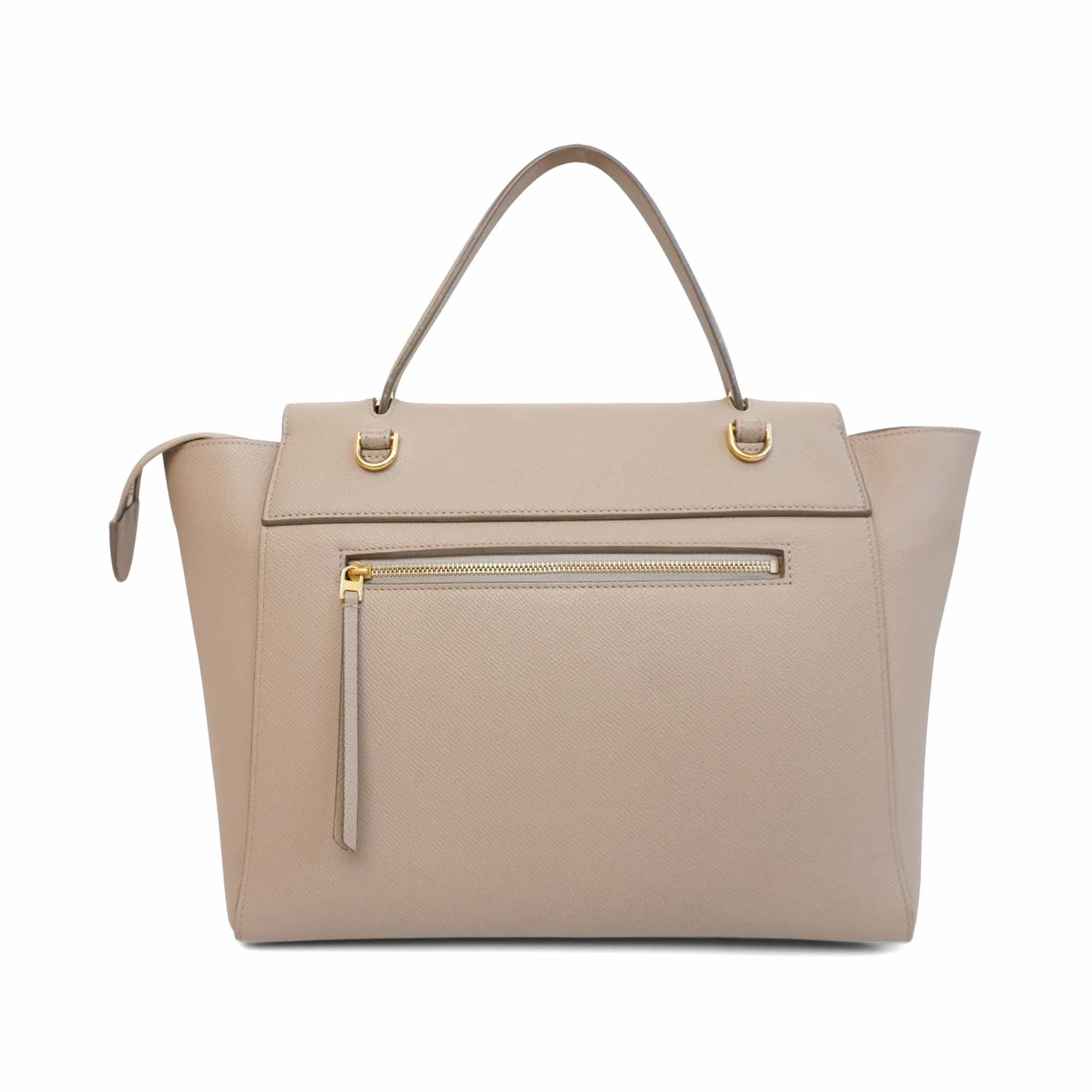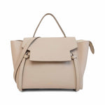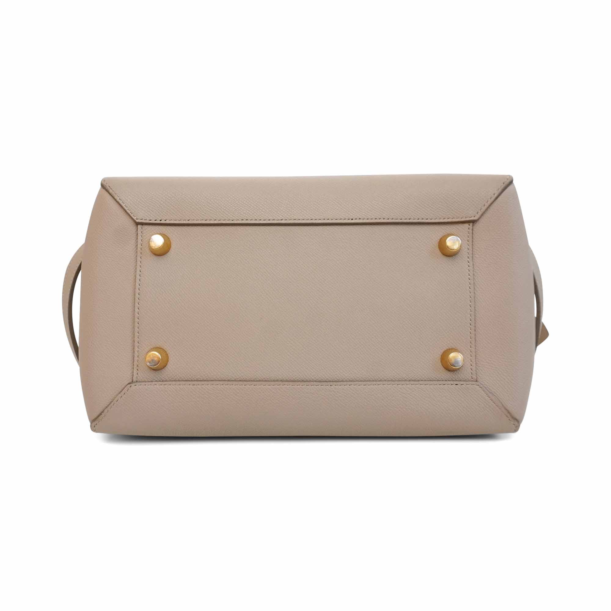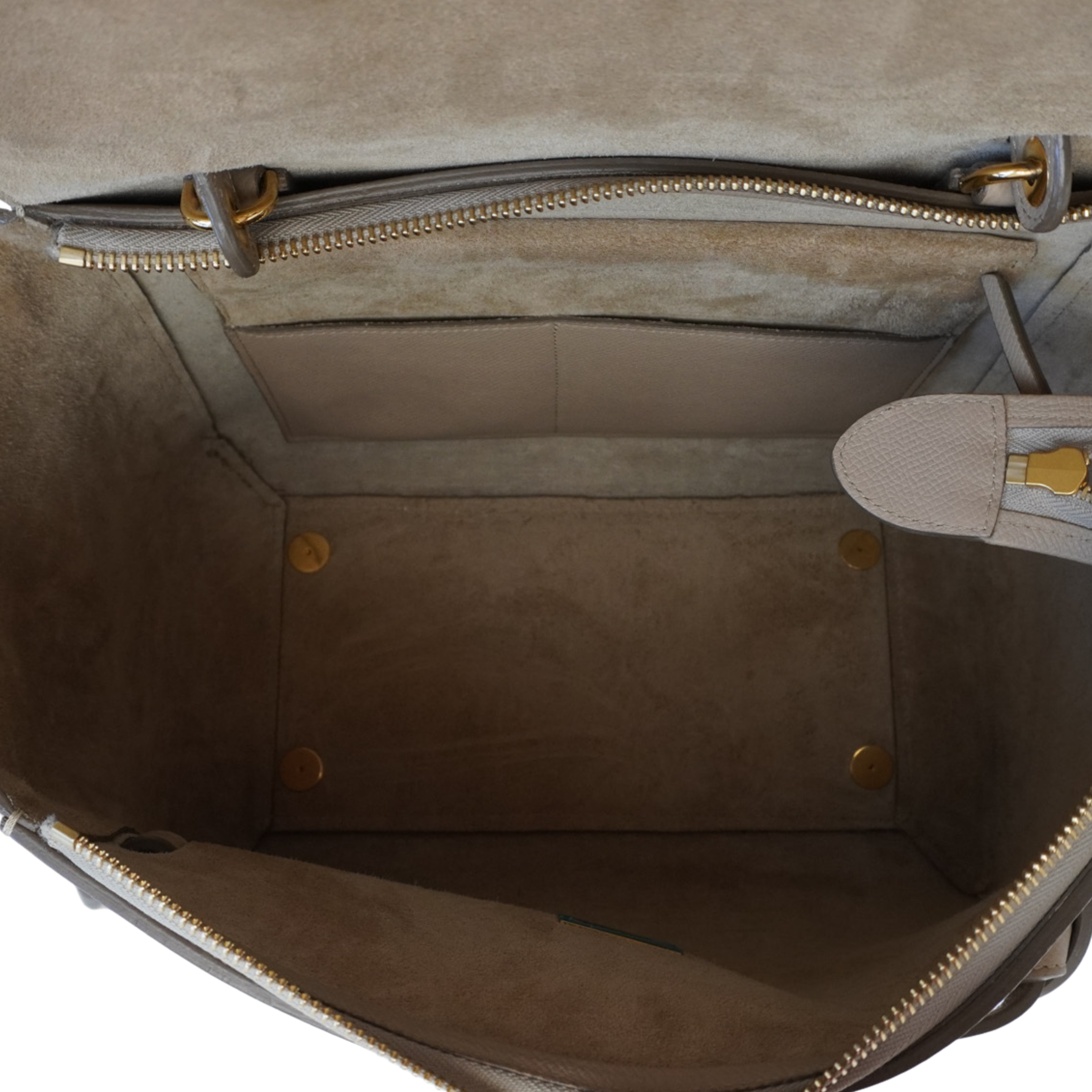 Celine 'Mini Belt' bag in beige grained leather with gold hardware. Features a front flap that tucks into a knotted strap, interior zipper, and suede lining with flat slip pockets inside. The bag has a flat zip pocket on the back and a removable shoulder strap.