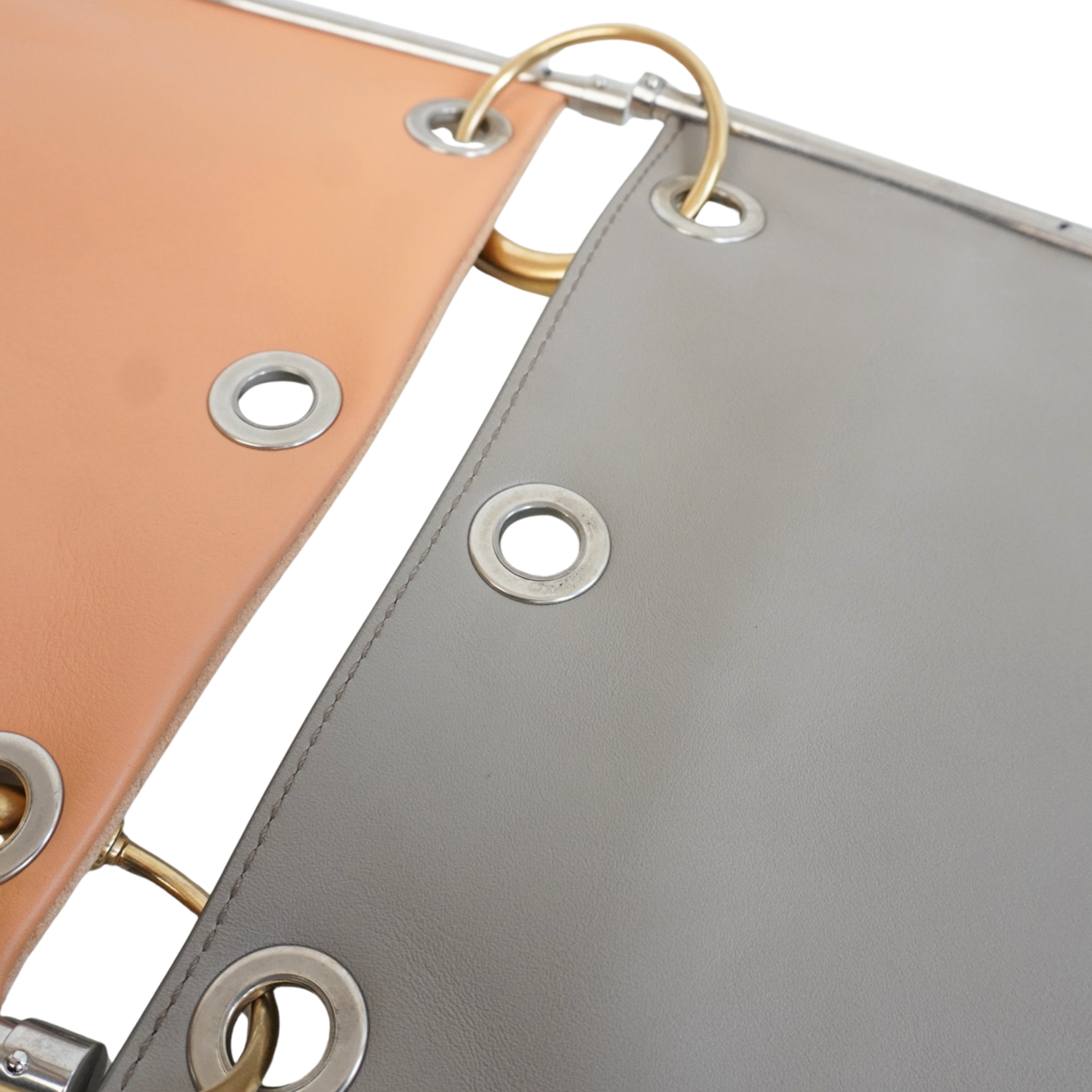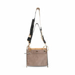 Chloe 'Roy' multiwear shoulder bag in grey and peach suede and leather with two-tone hardware. Features two zip pouches connected with gold O-rings, a removable leather shoulder strap, and a removable and adjustable canvas and chain crossbody strap. The O-rings have sliders that allow the two pouched to be disconnected and converted into a single pouch bag or carried as a clutch.