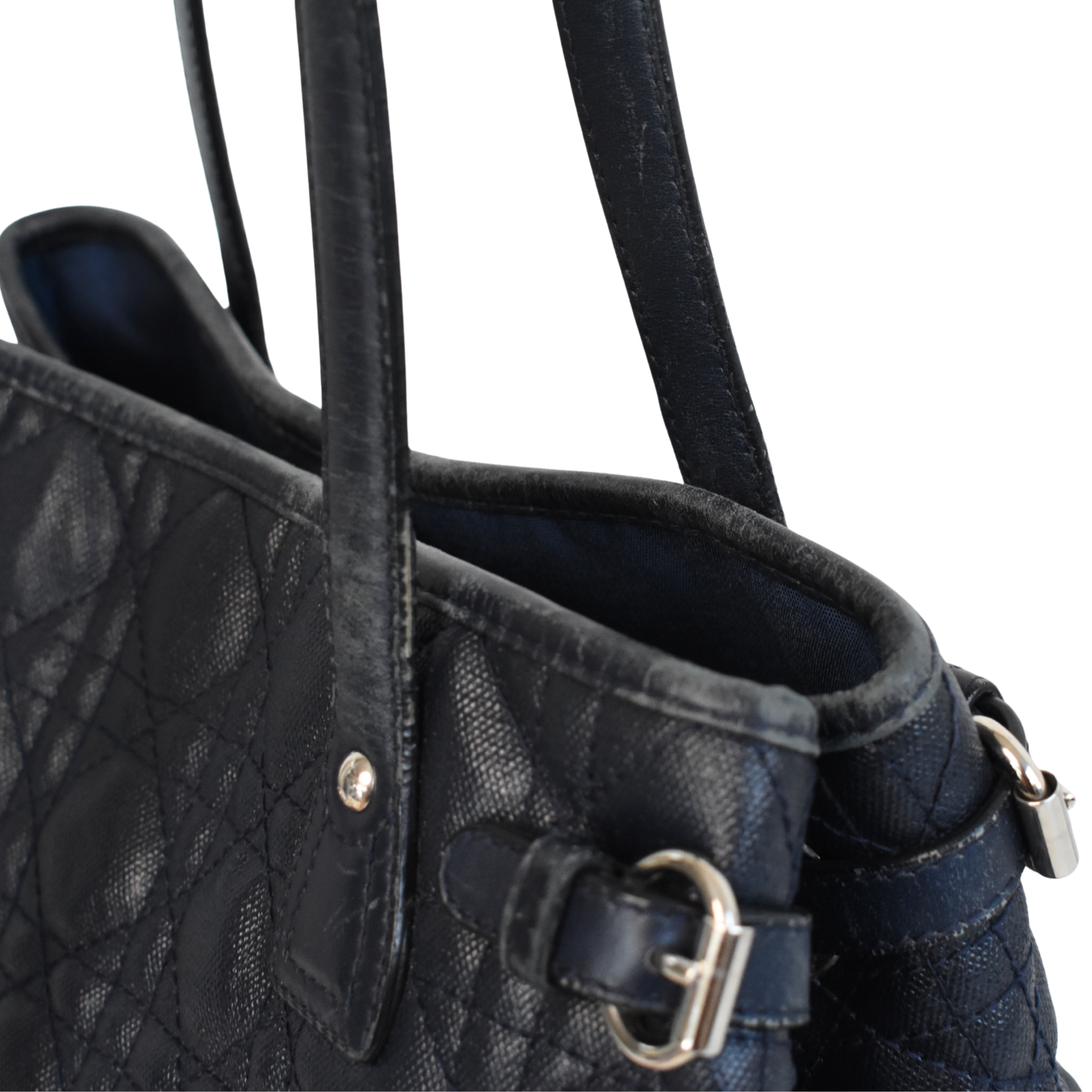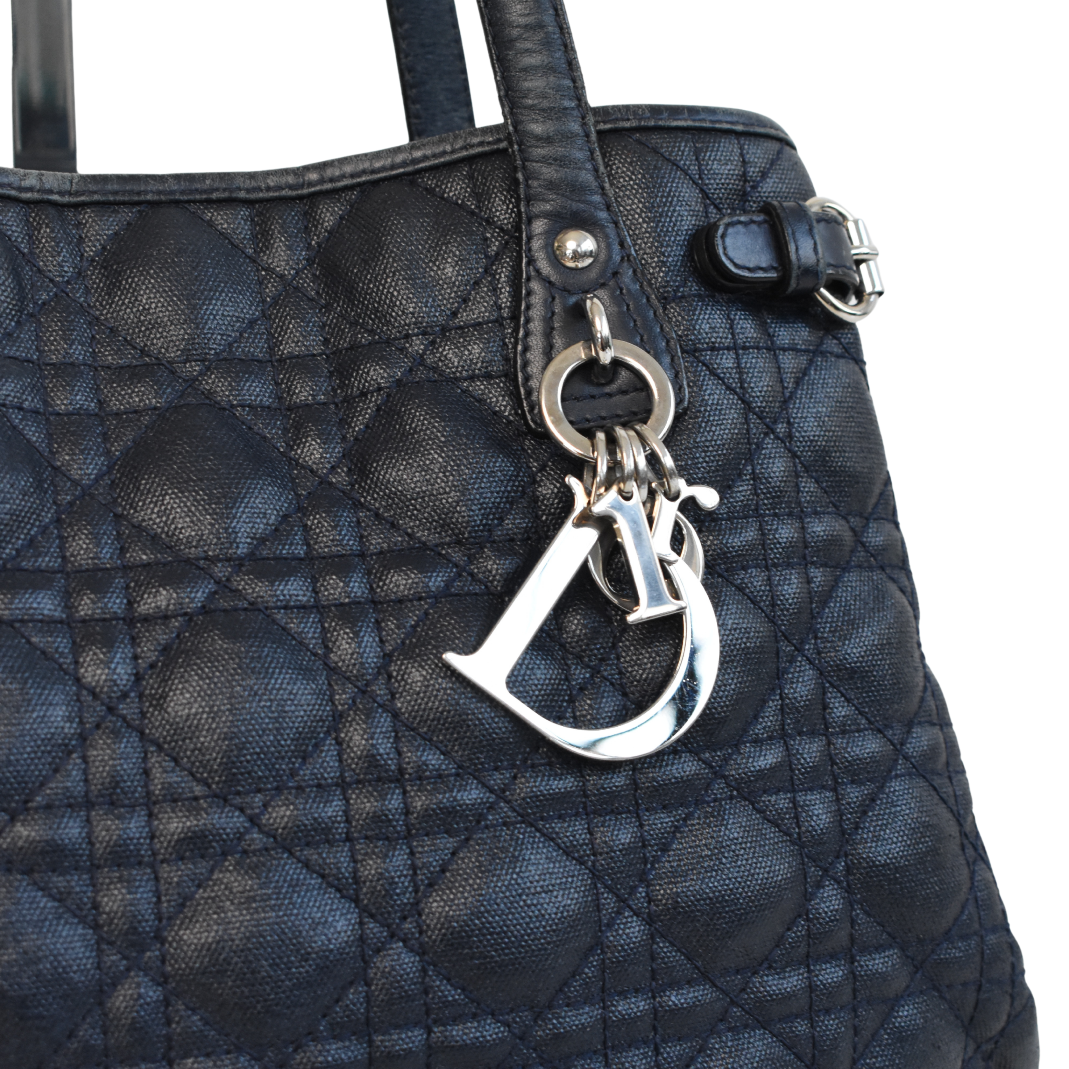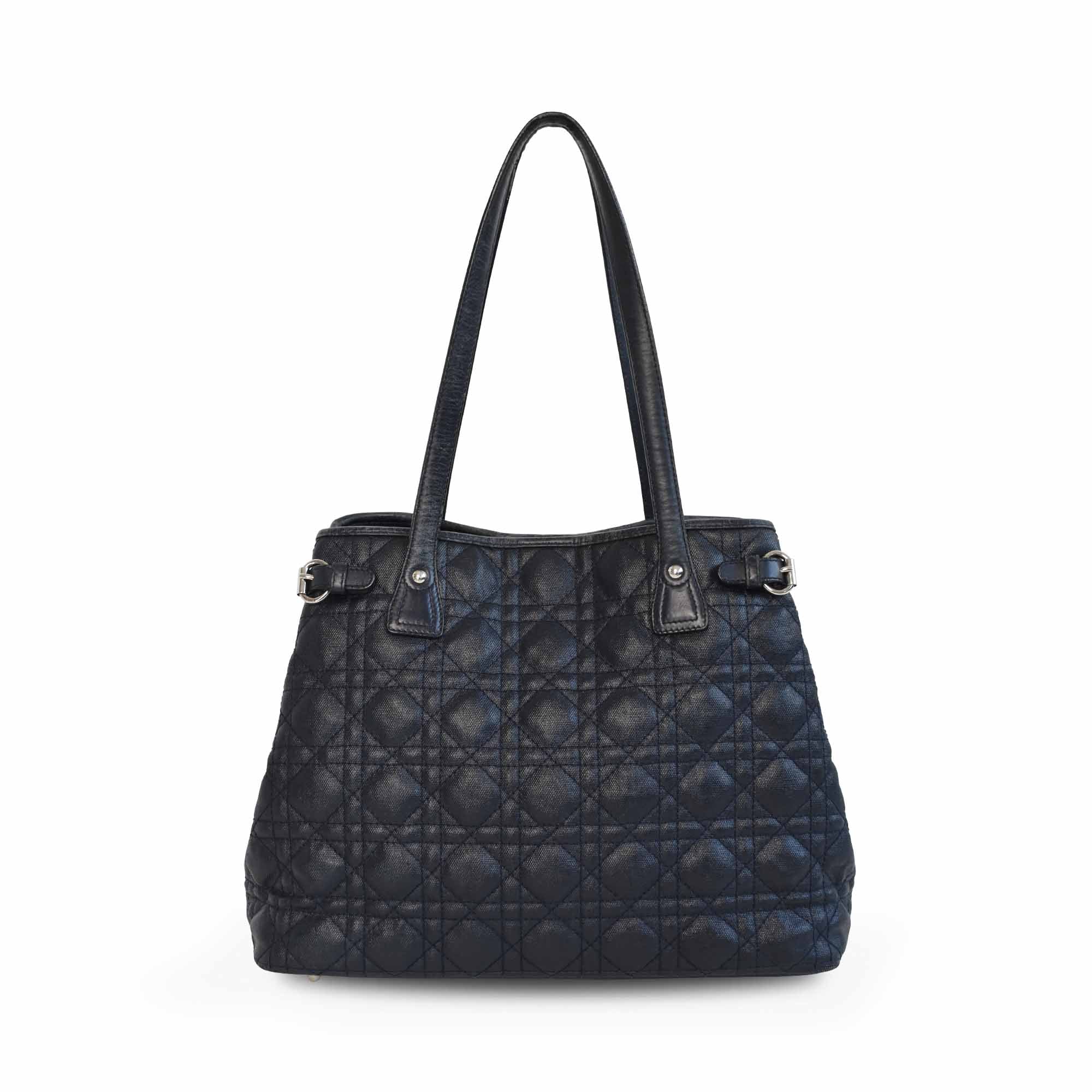 Christian Dior 'Panerea' shoulder tote bag in cannage quilted navy coated canvas with leather accents and silver hardware. Features logo letter charms and buckle detailing on the sides. The interior is lined with navy canvas and has a magnetic closure and clip that pinches in the gussets.