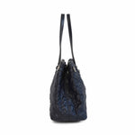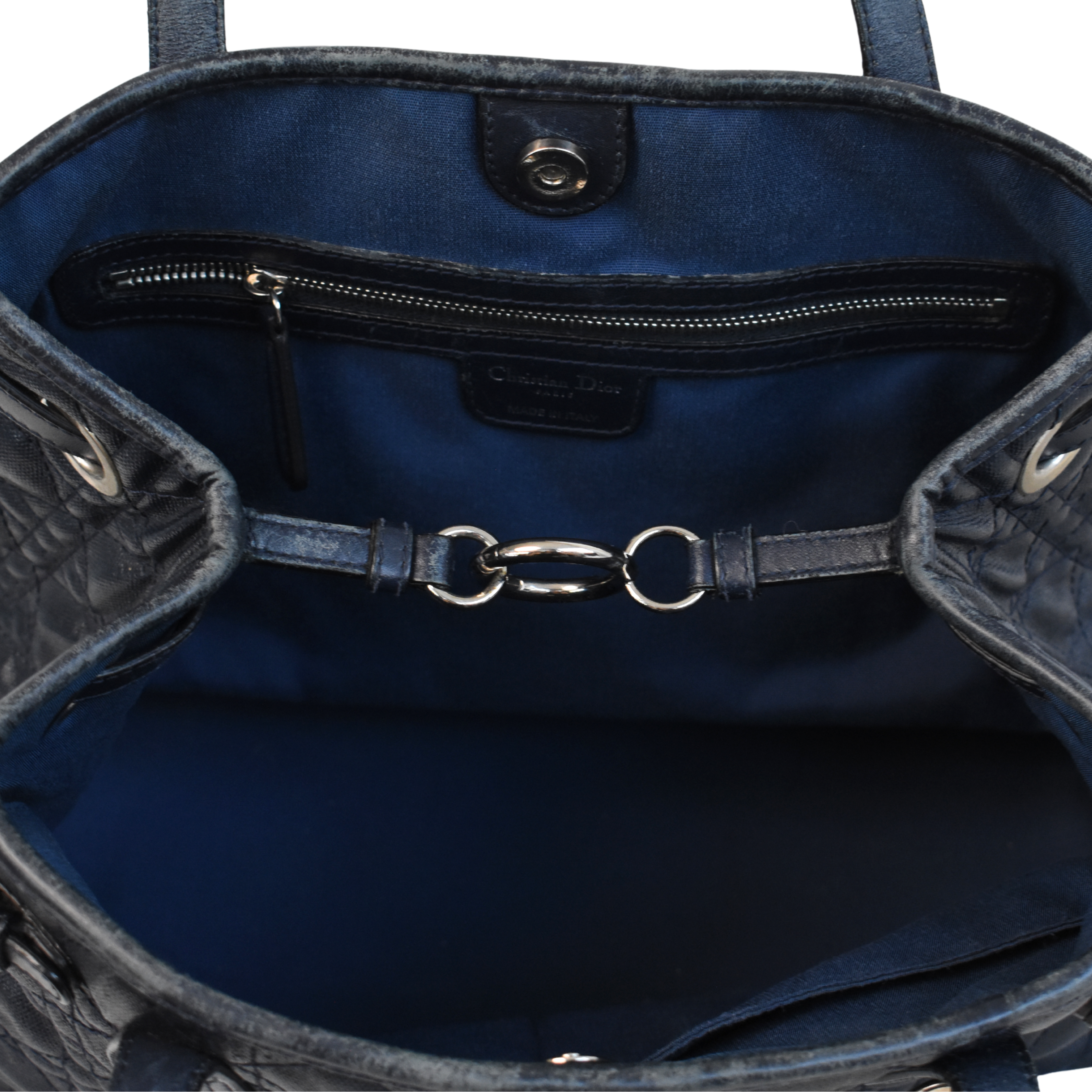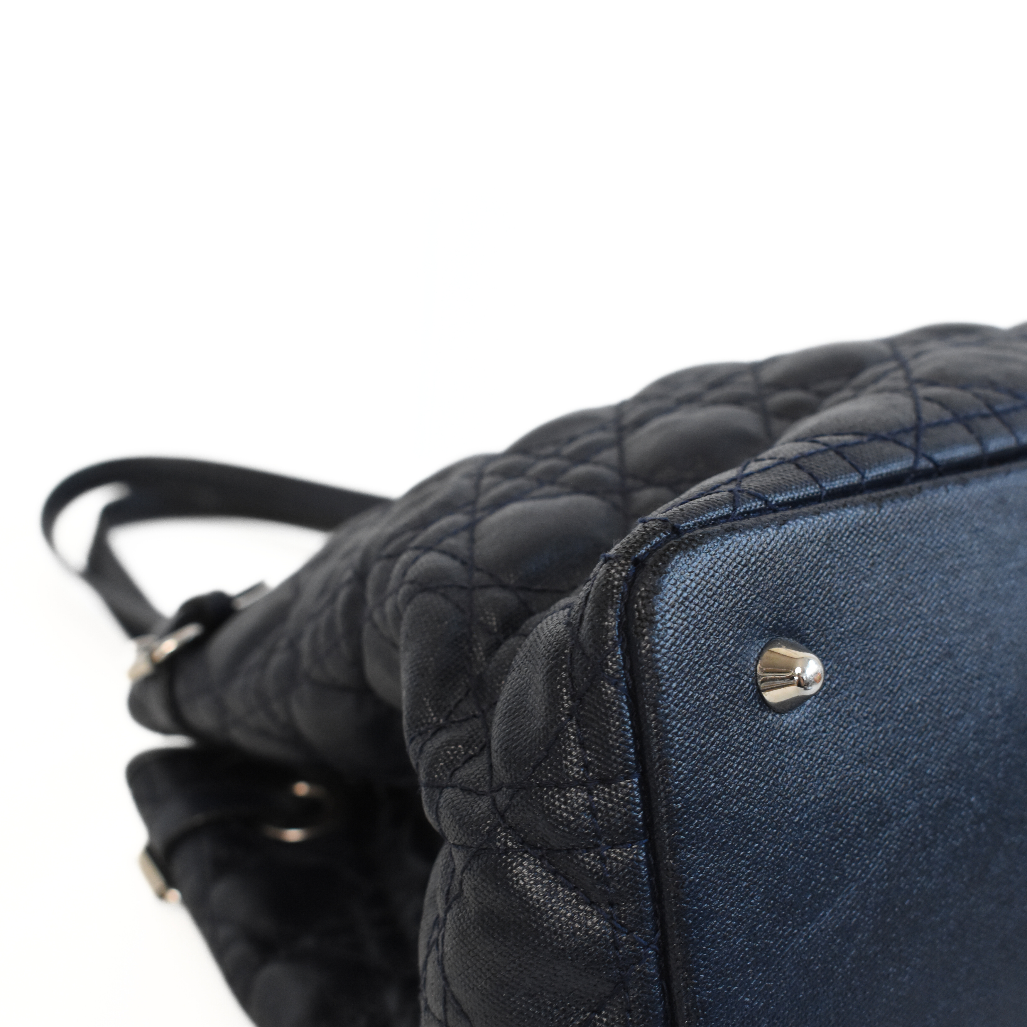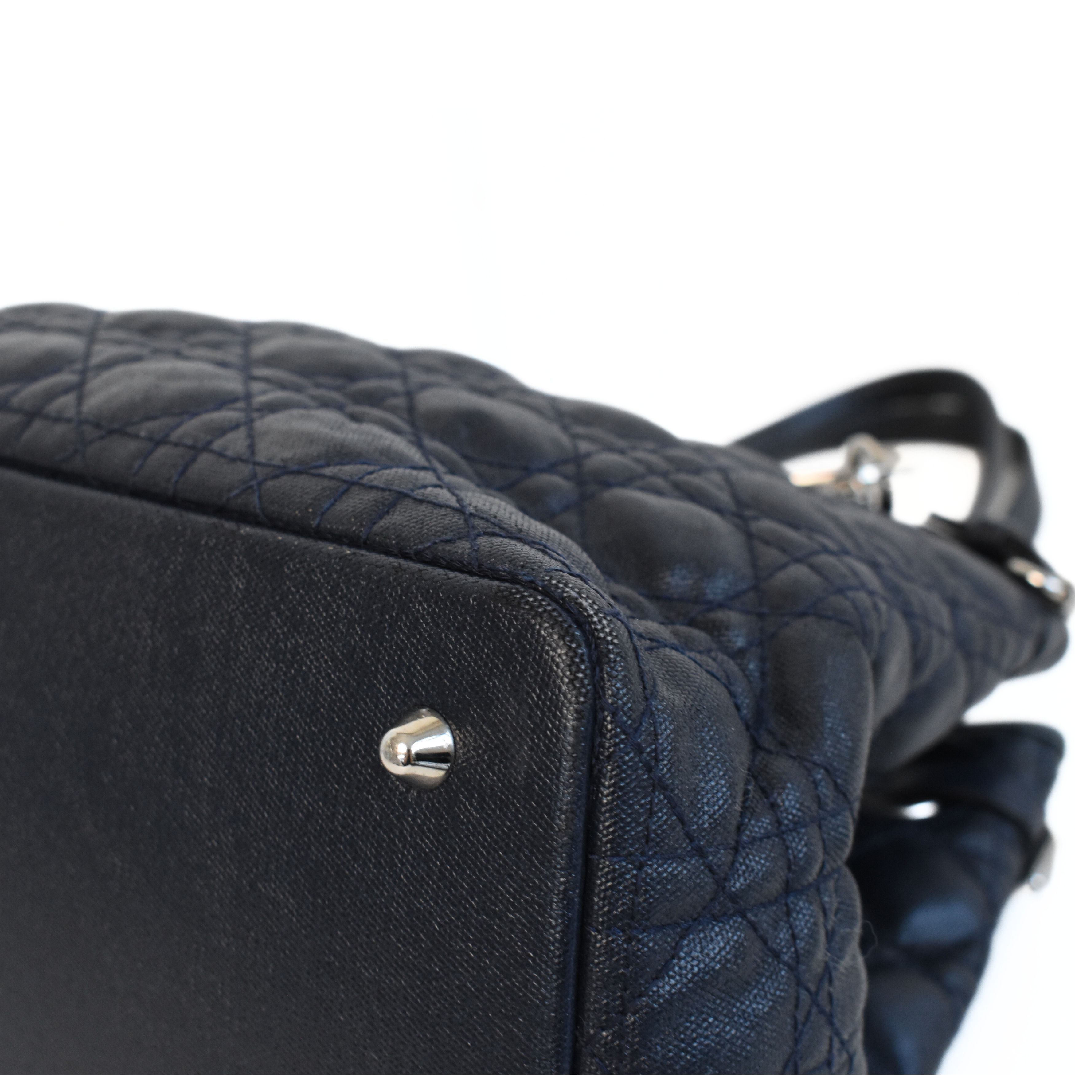 Christian Dior 'Panerea' shoulder tote bag in cannage quilted navy coated canvas with leather accents and silver hardware. Features logo letter charms and buckle detailing on the sides. The interior is lined with navy canvas and has a magnetic closure and clip that pinches in the gussets.