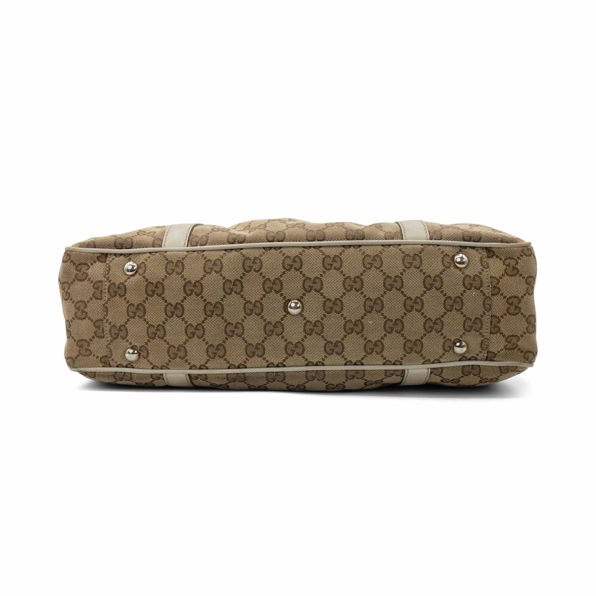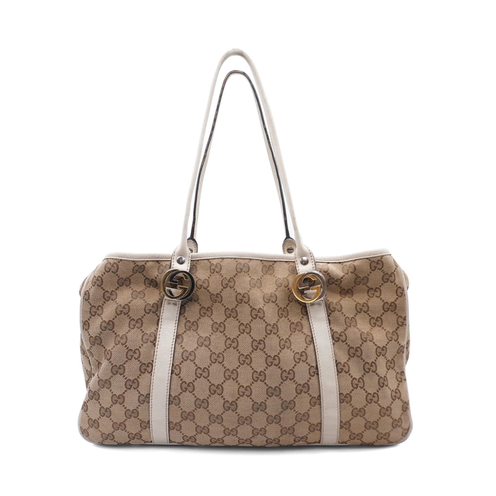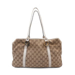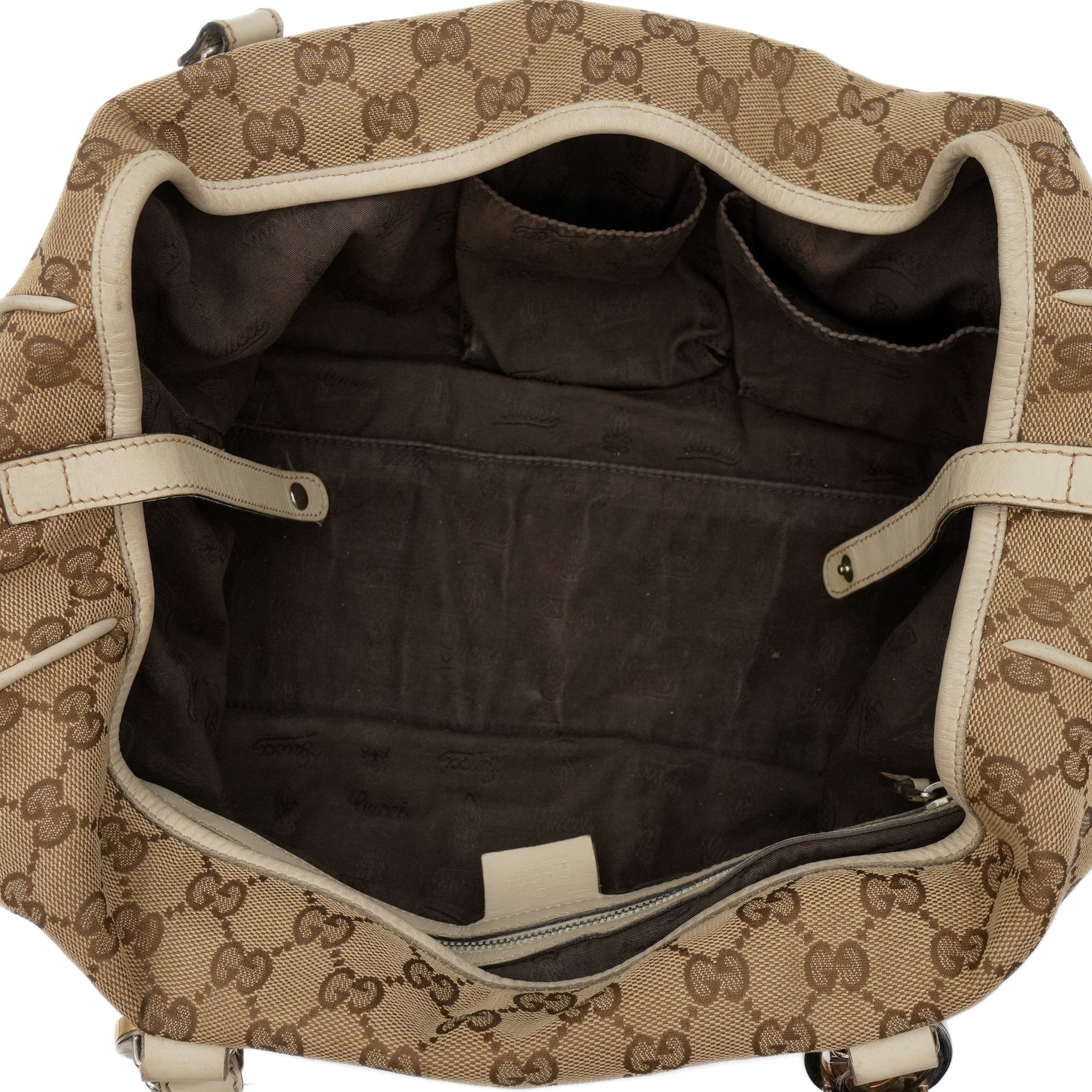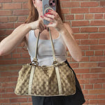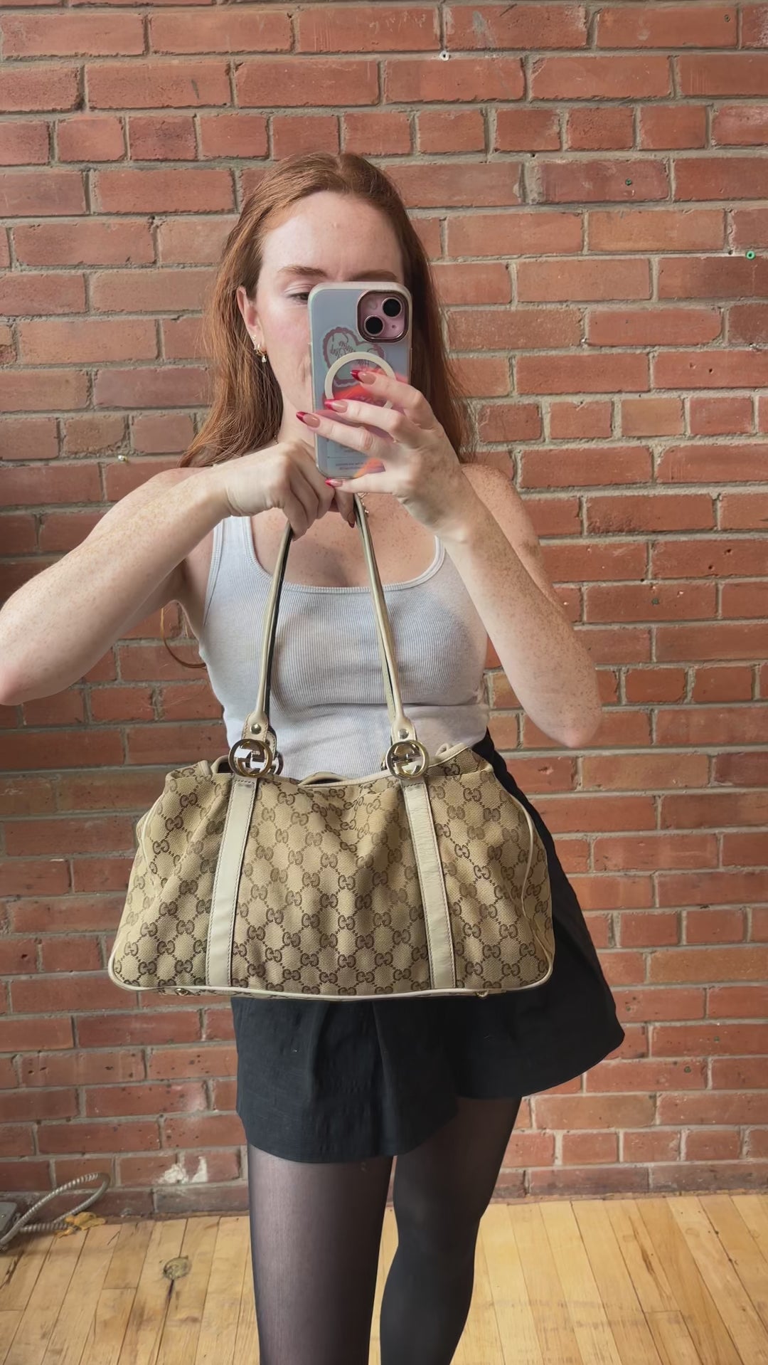 Gucci shoulder bag in beige monogram printed canvas with a cream leather trim, silver and gold 'Interlocking G' hardware at the straps, and a snap closure. The bag is lined with brown canvas and has interior slip and zip pockets.