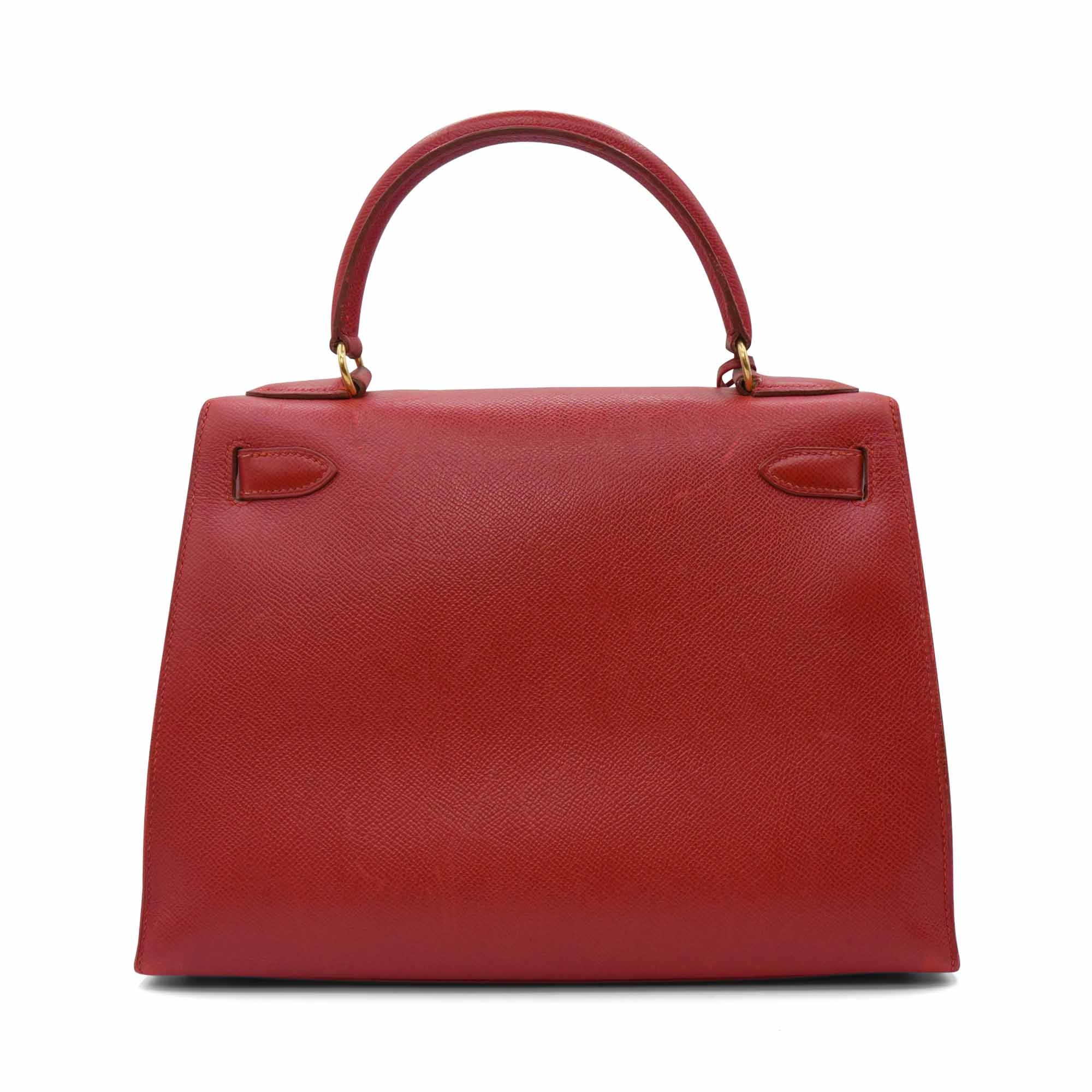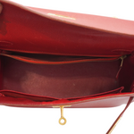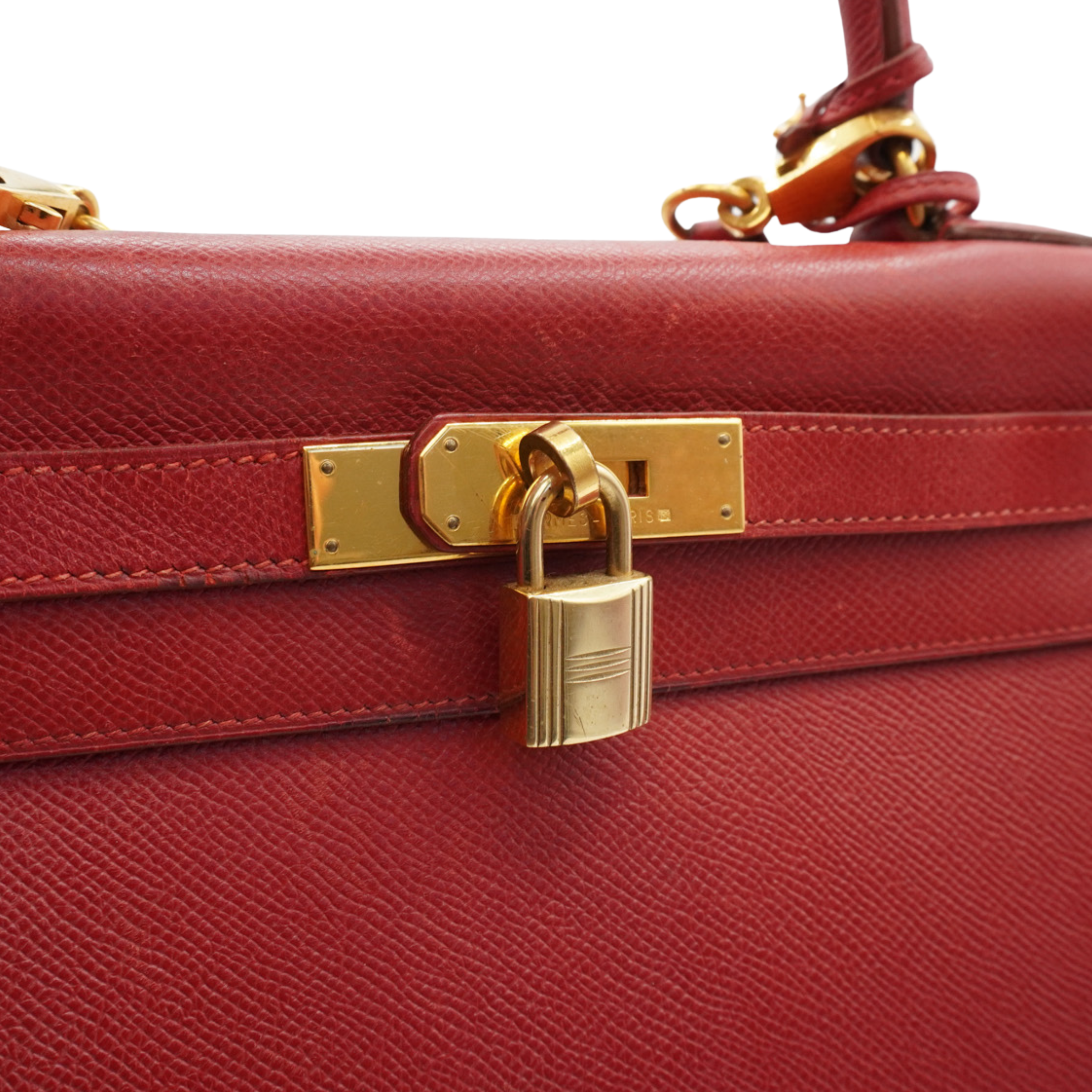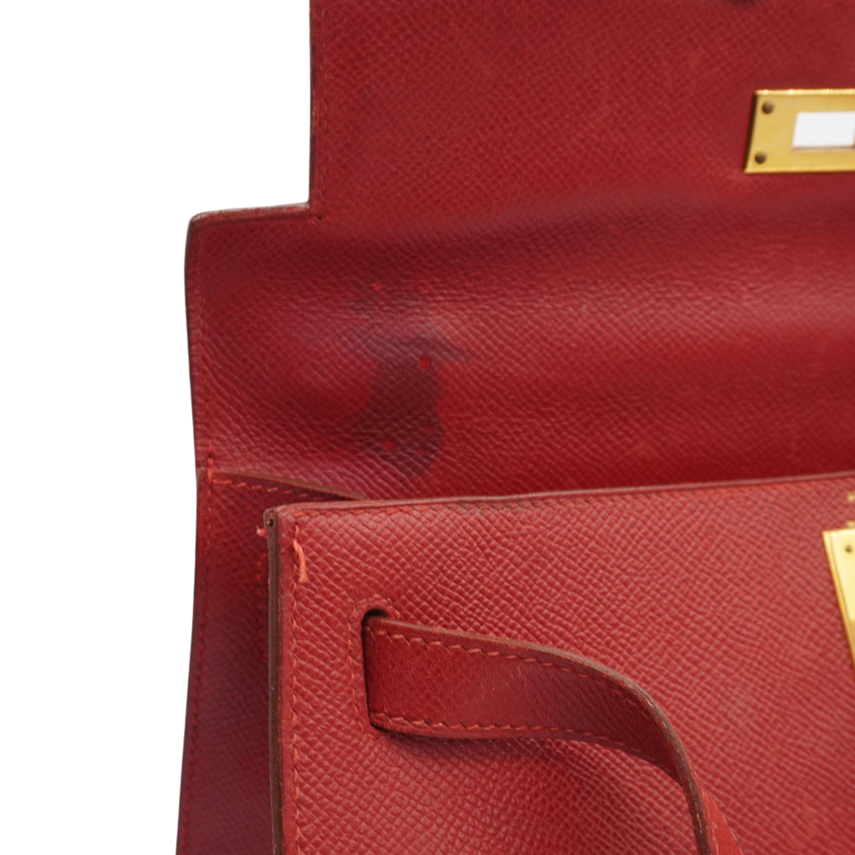 Hermes vintage 'Kelly Sellier 28' handbag in red epsom leather with a structured top handle, removable shoulder strap, and gold plated hardware. The bag has a flap closure with sangle straps that fasten with signature 'Kelly' turnlock, opening to reveal a leather lined interior with both a zip and slip pockets.