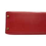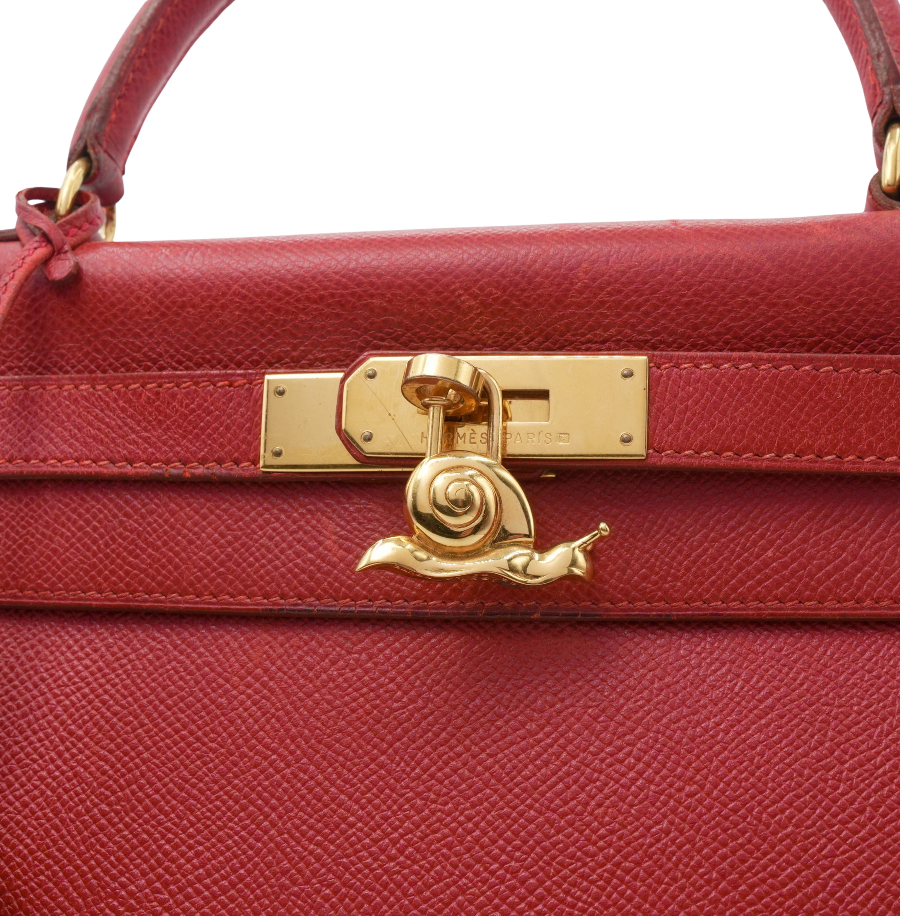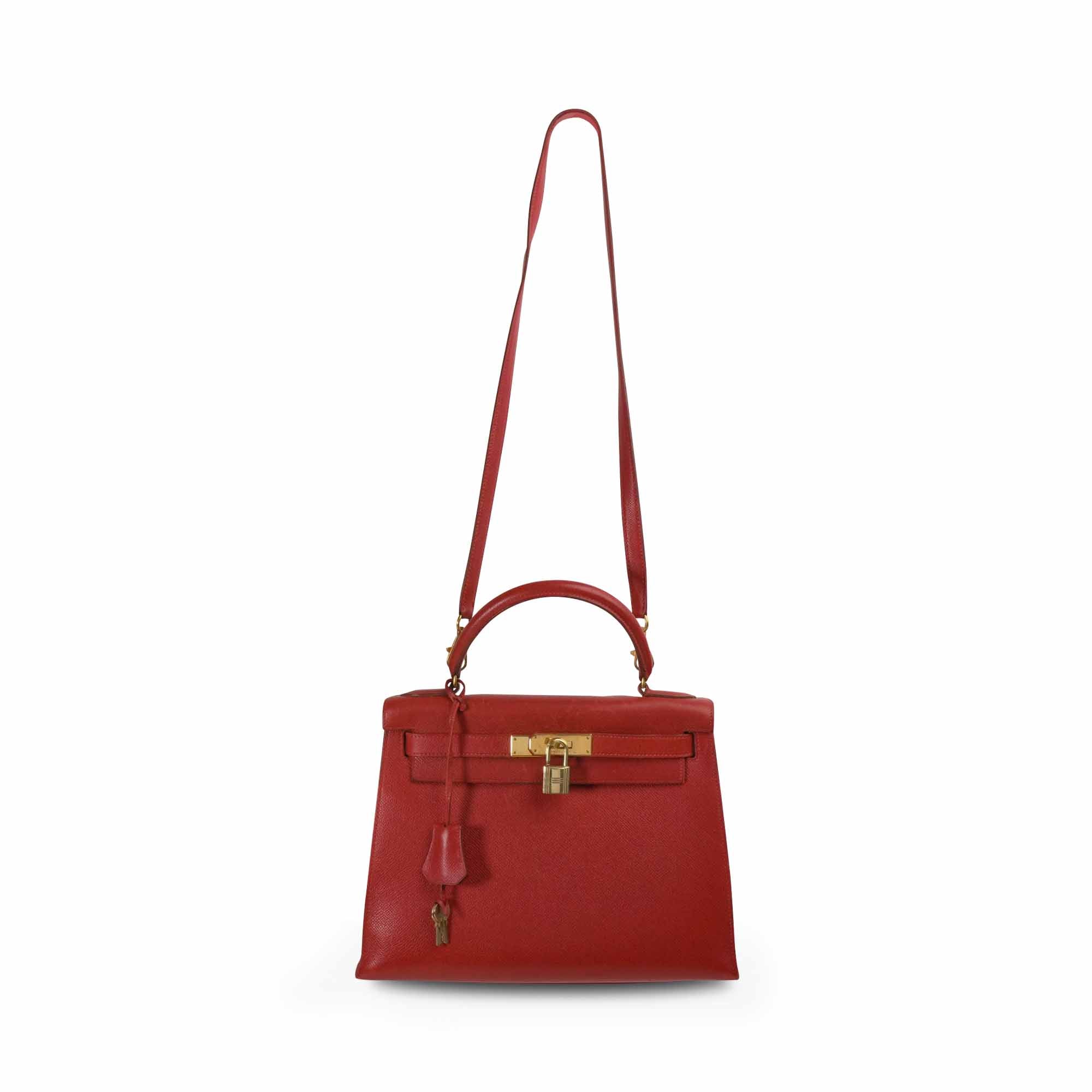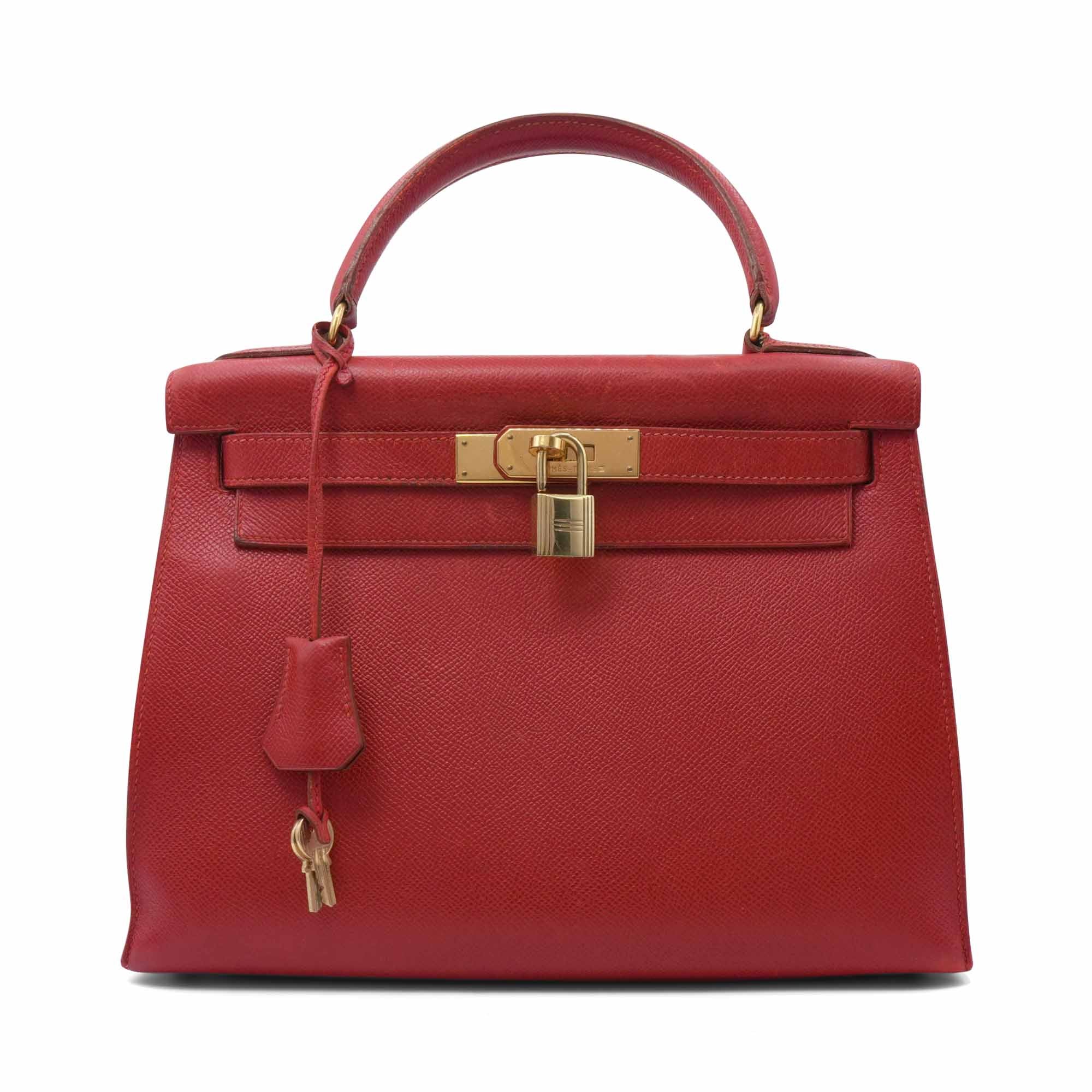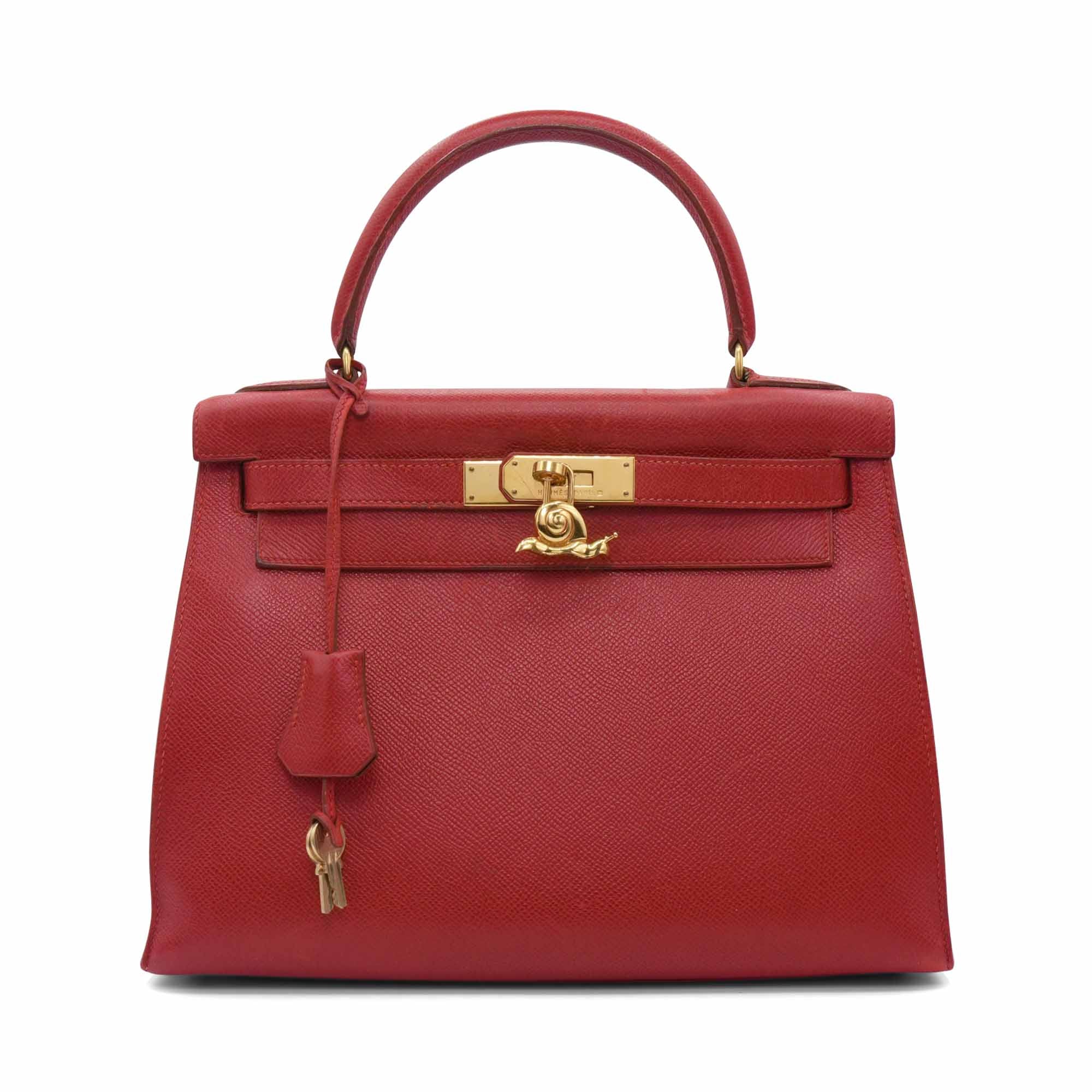 Hermes vintage 'Kelly Sellier 28' handbag in red epsom leather with a structured top handle, removable shoulder strap, and gold plated hardware. The bag has a flap closure with sangle straps that fasten with signature 'Kelly' turnlock, opening to reveal a leather lined interior with both a zip and slip pockets.
