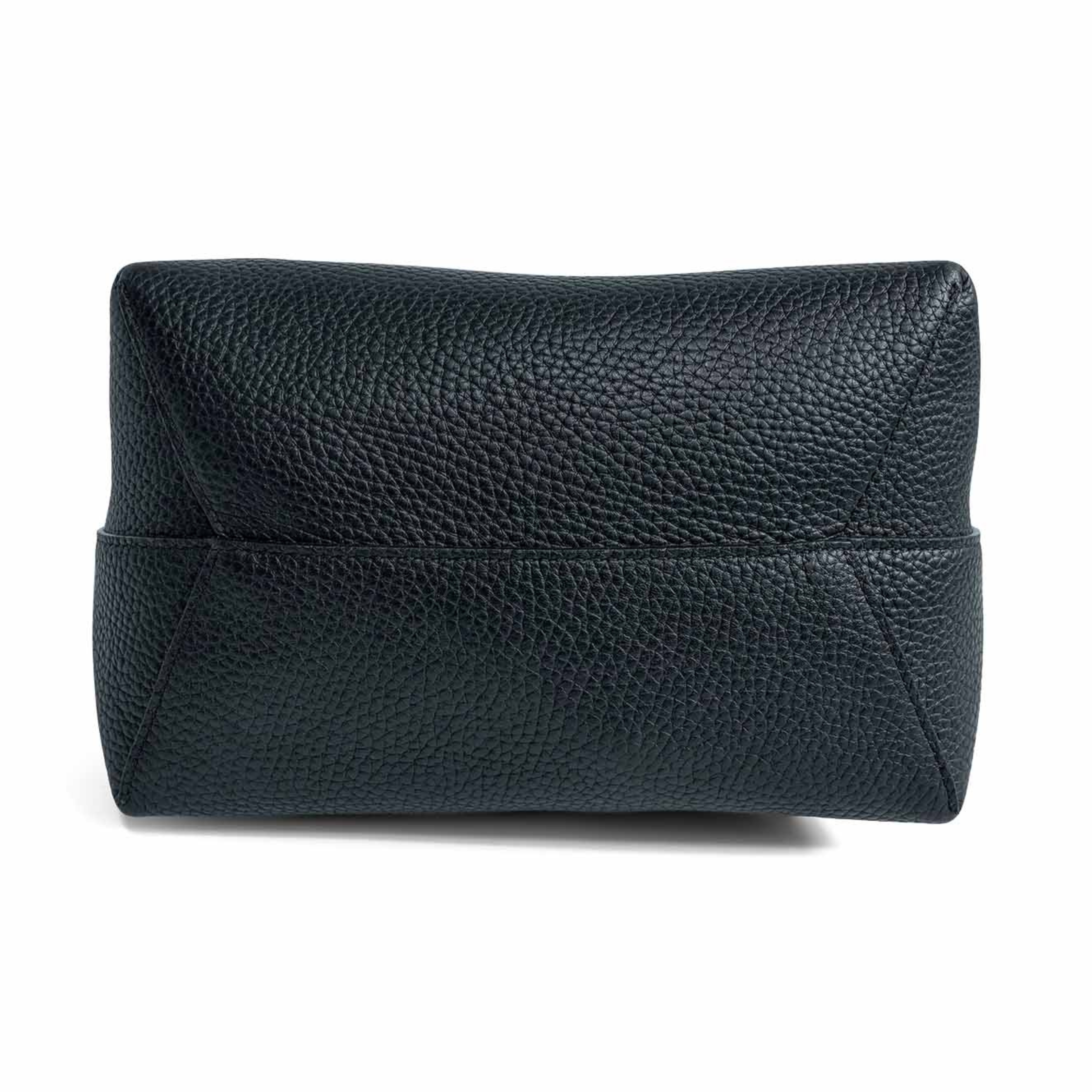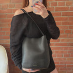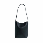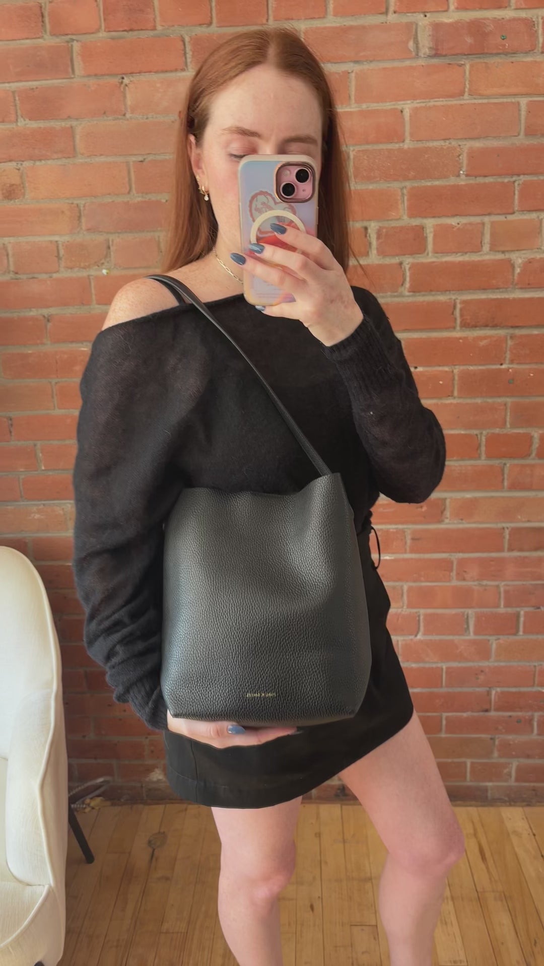 Mansur Gavriel 'Small Everyday' shoulder tote bag in black tumbled leather with gold foil logo stamp and magnetic closure. Features a black suede lining with small interior slip pocket.