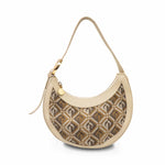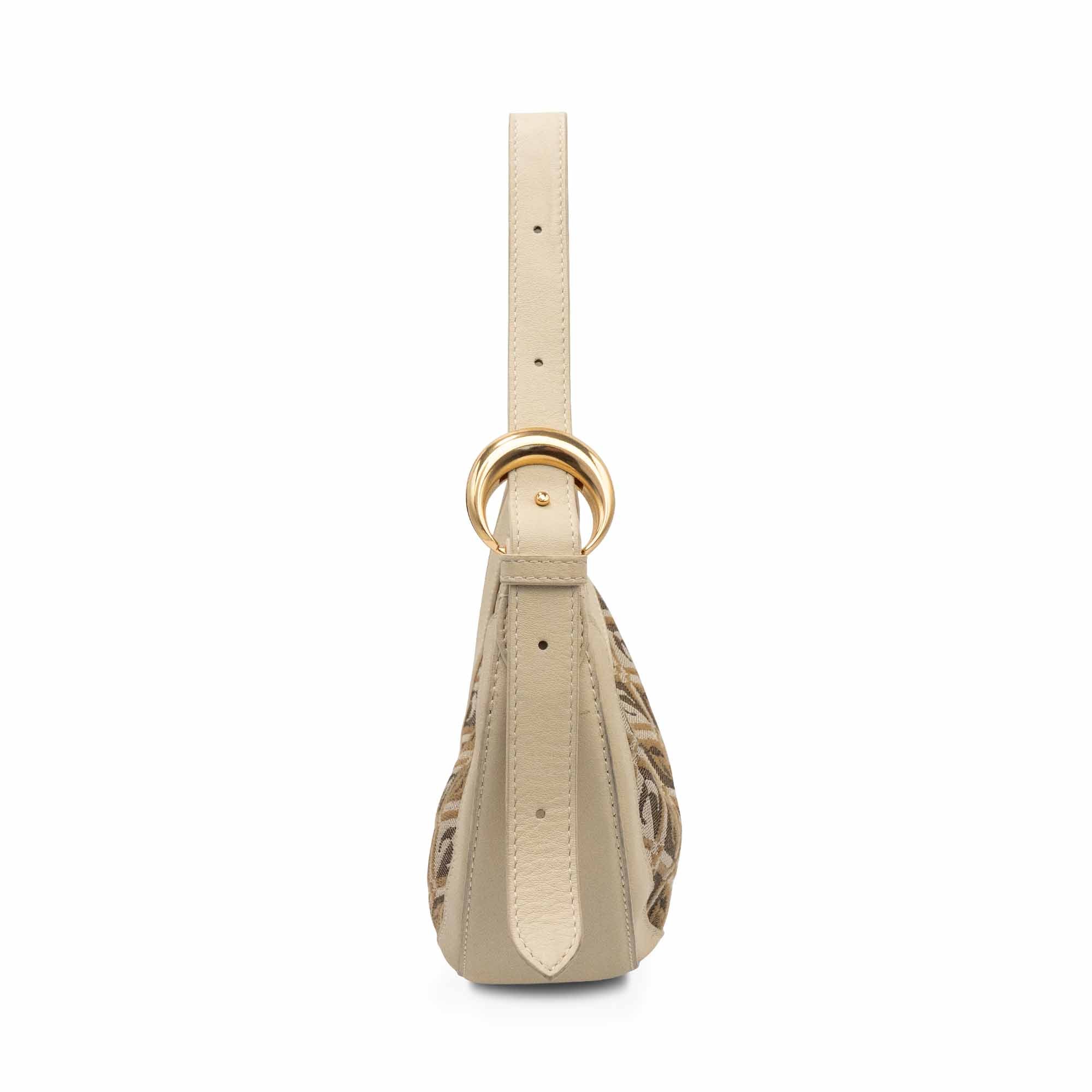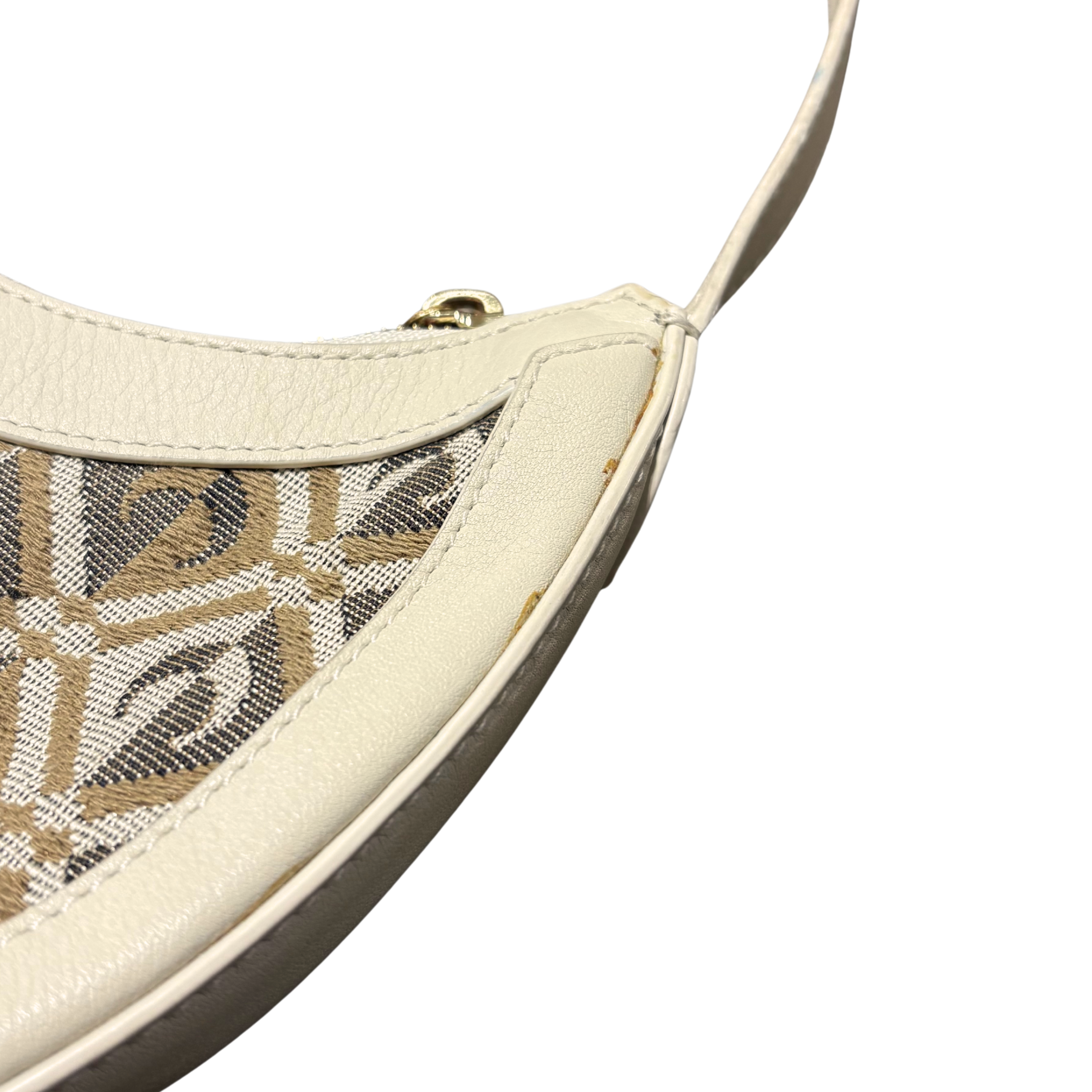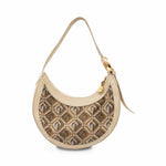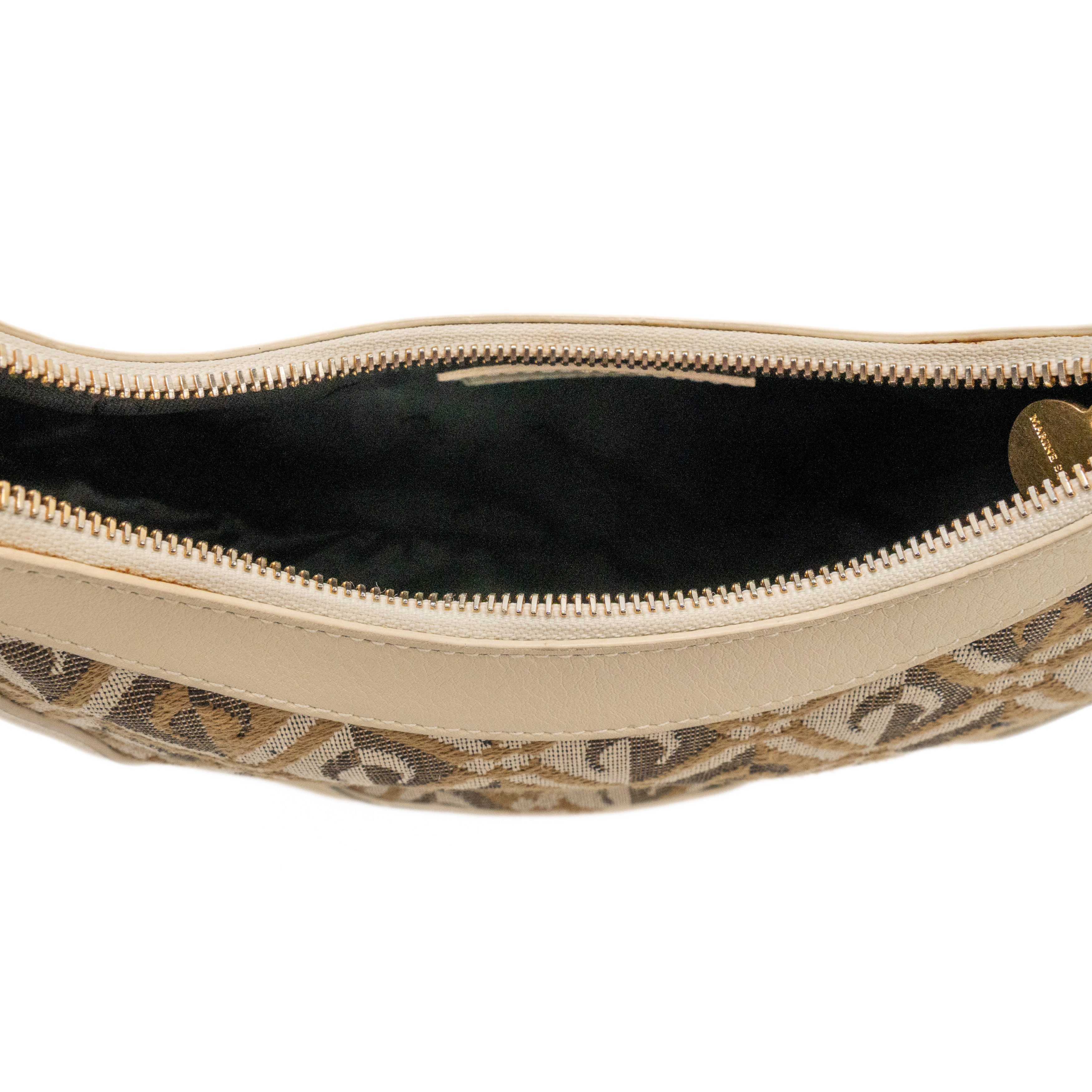 Marine Serre 'Eclips' Mini Shoulder Bag in cream leather with a beige and brown jacquard moon diamant pattern panel in the centre, an adjustable shoulder strap with gold buckle hardware, and a top zip opening revealing a brown satin interior lining. Made in Spain