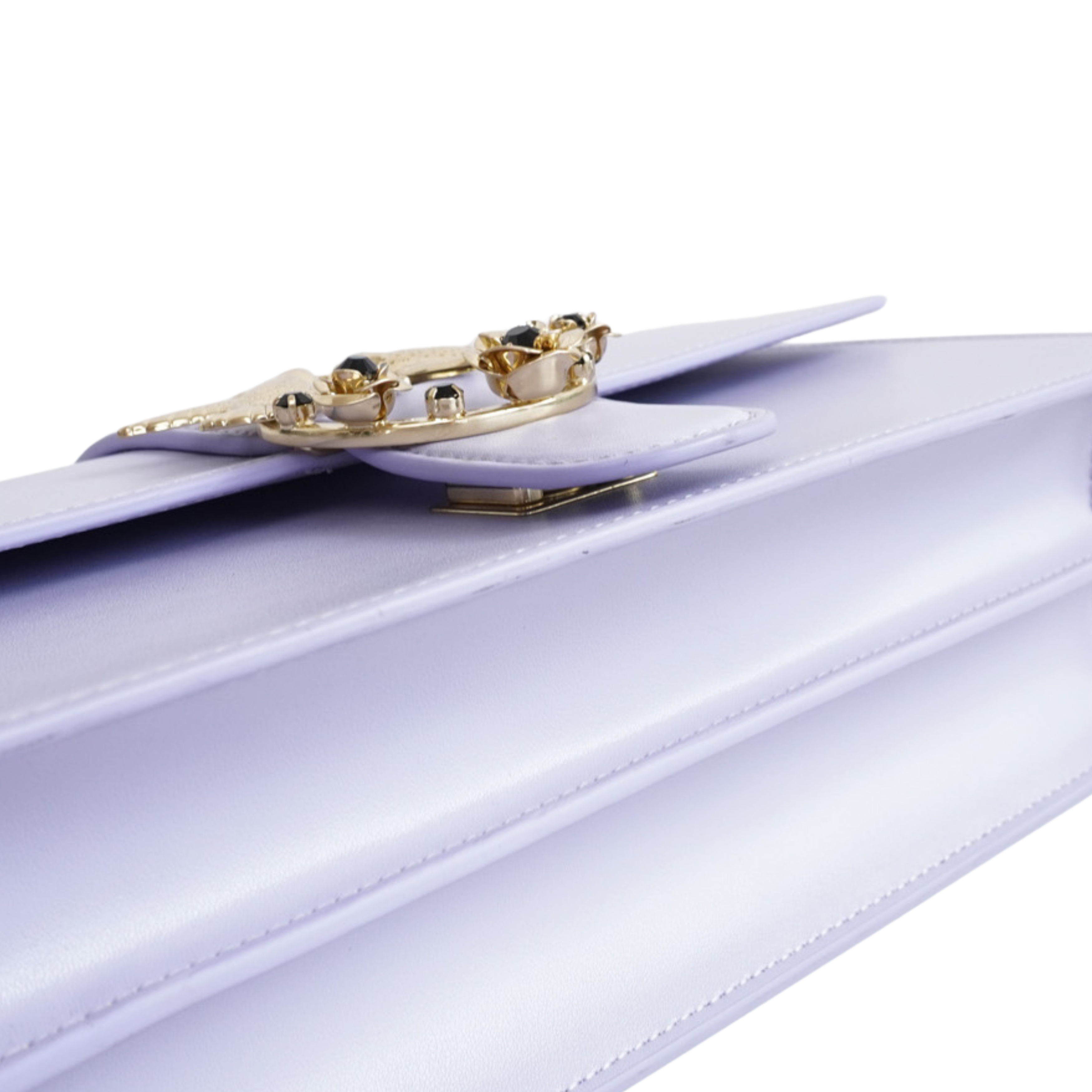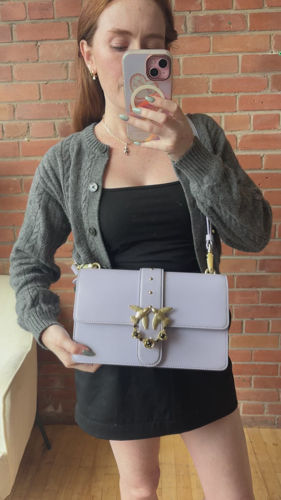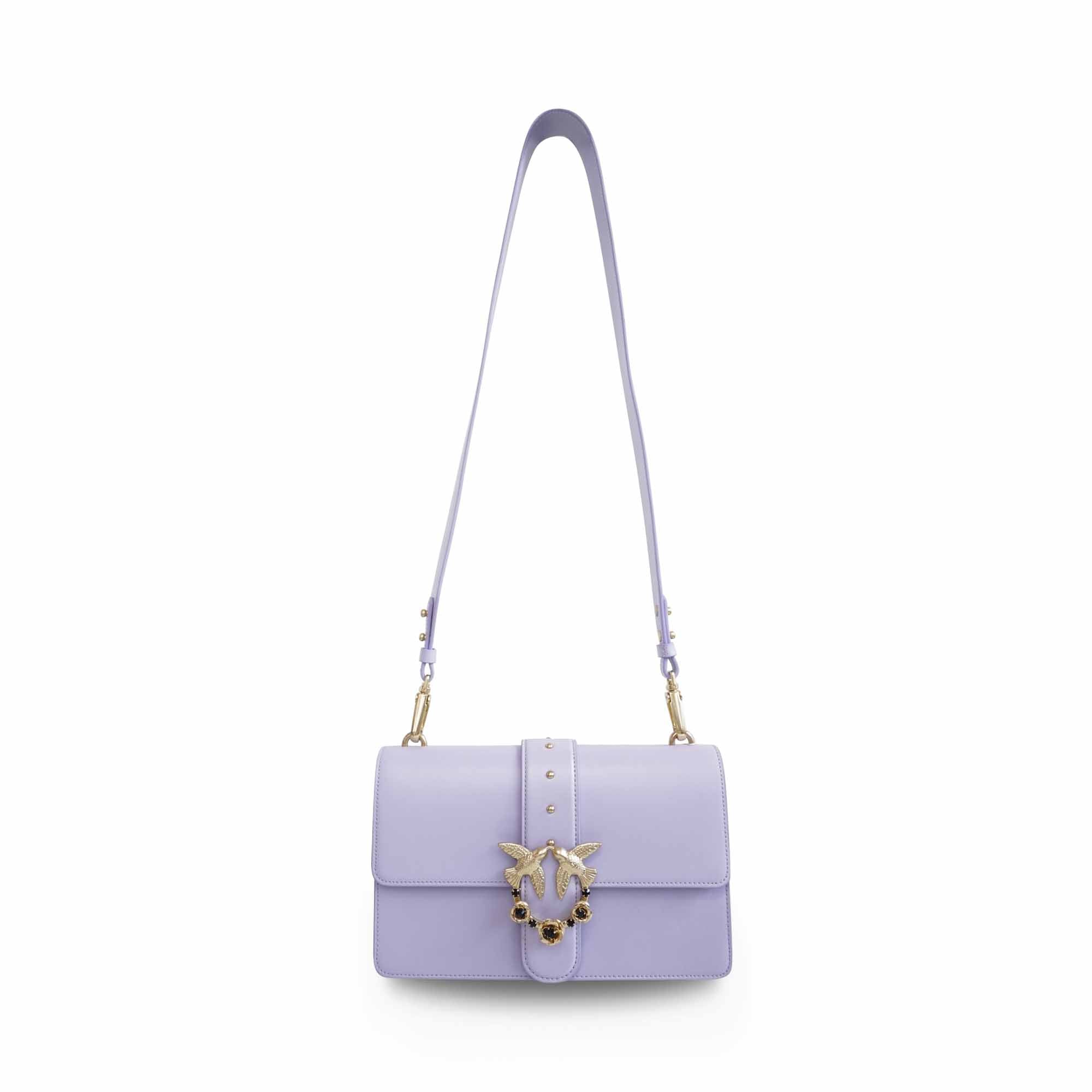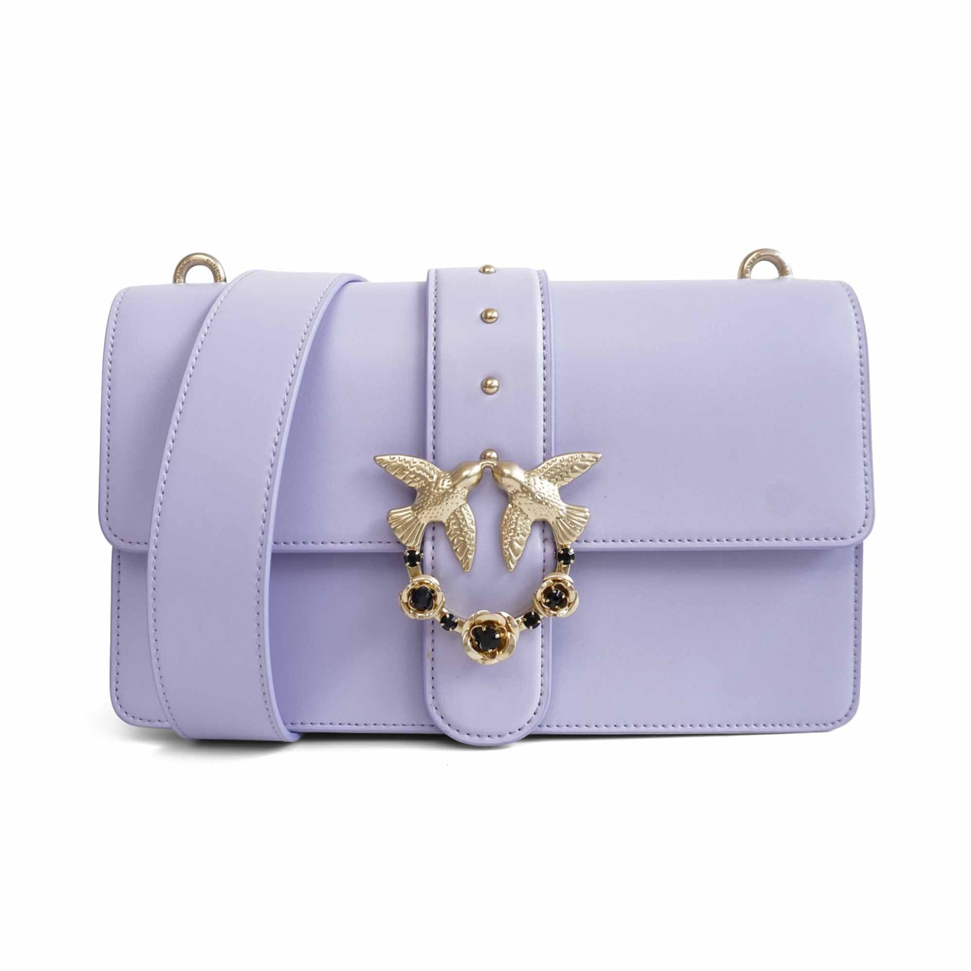 Pinko 'Love Abbraccio' flap bag in light purple leather with signature gold bird buckle accenting with roses and black stones. Features a beige microsuede lining with two open pockets and a middle zip pocket.