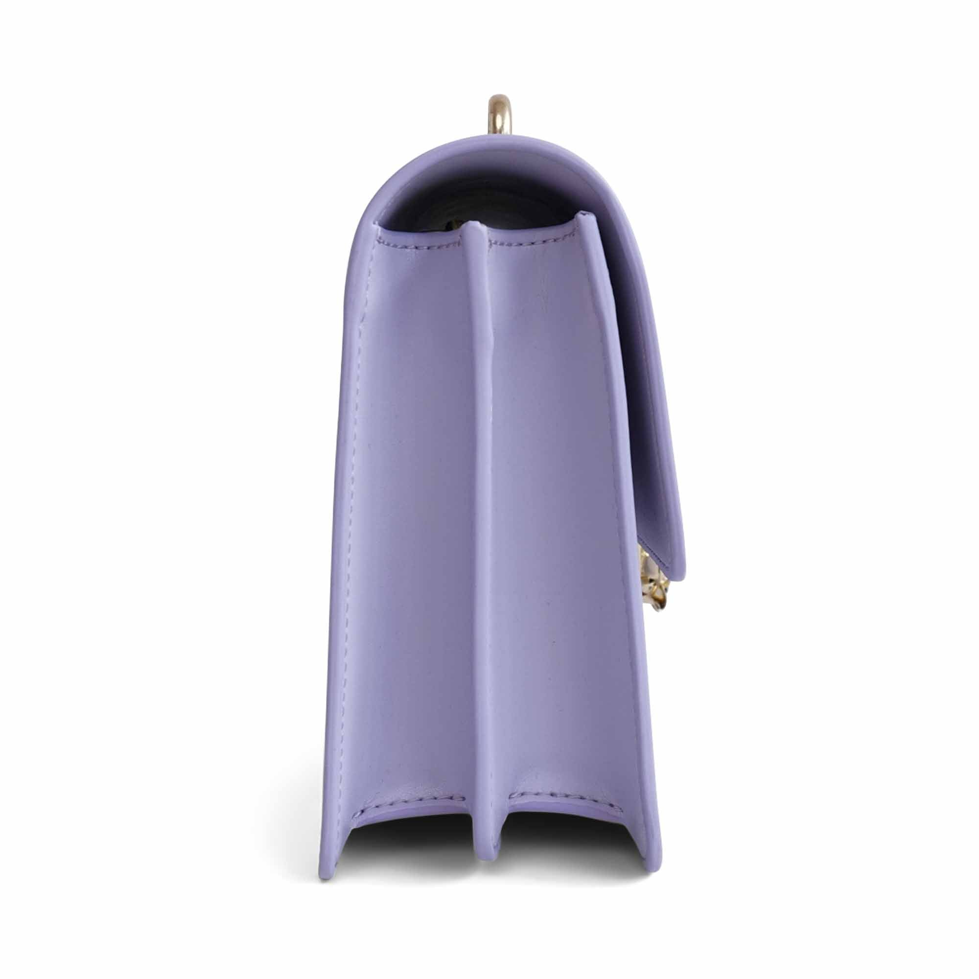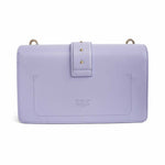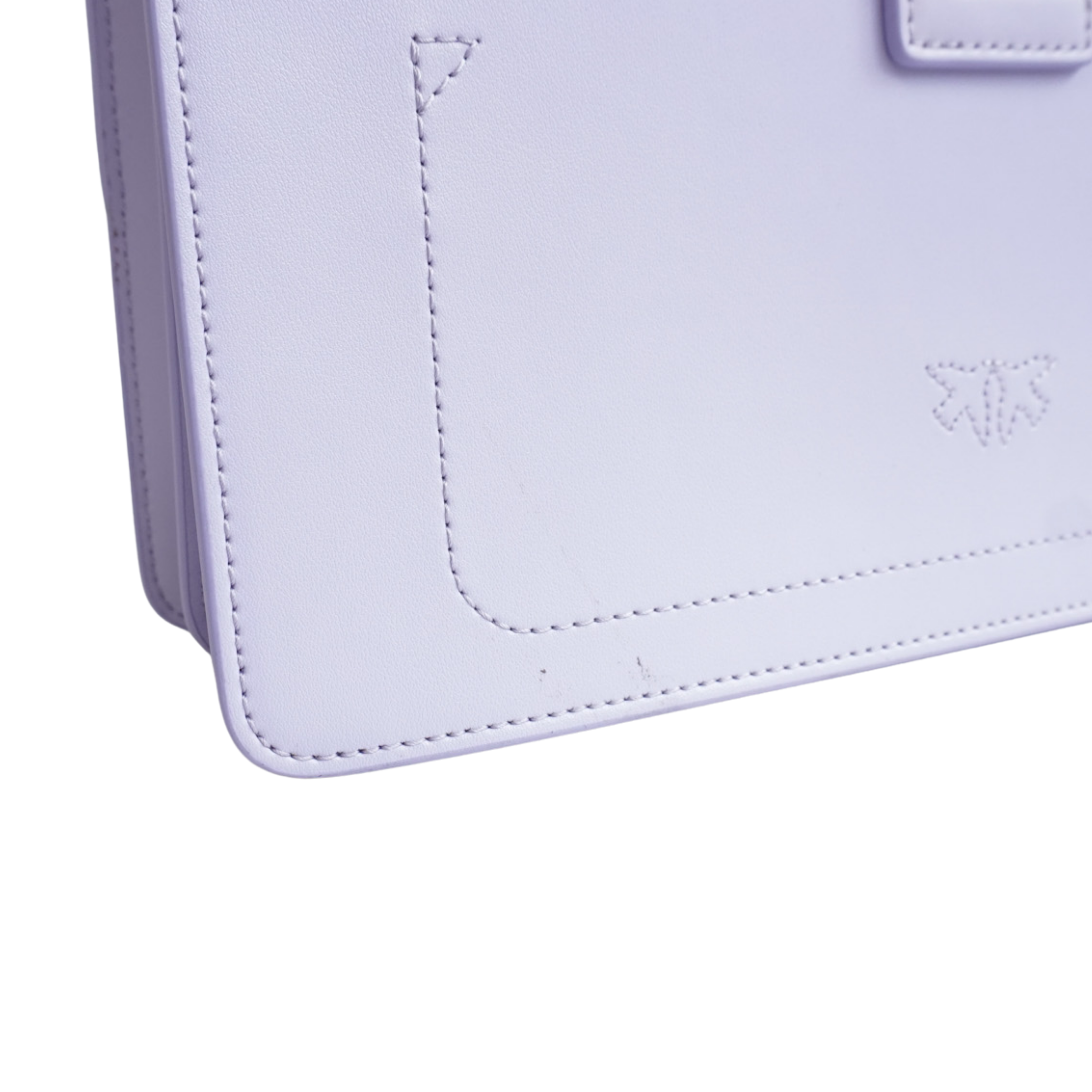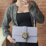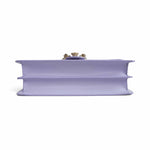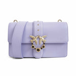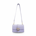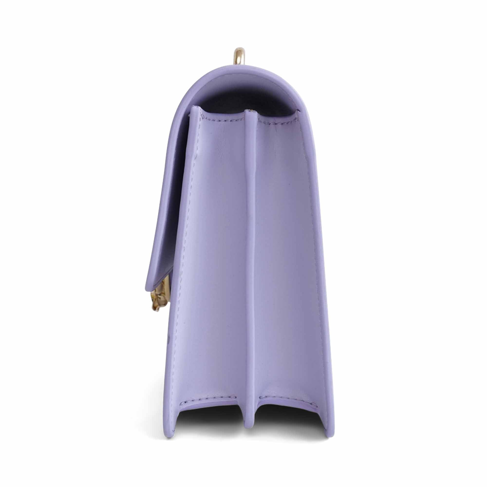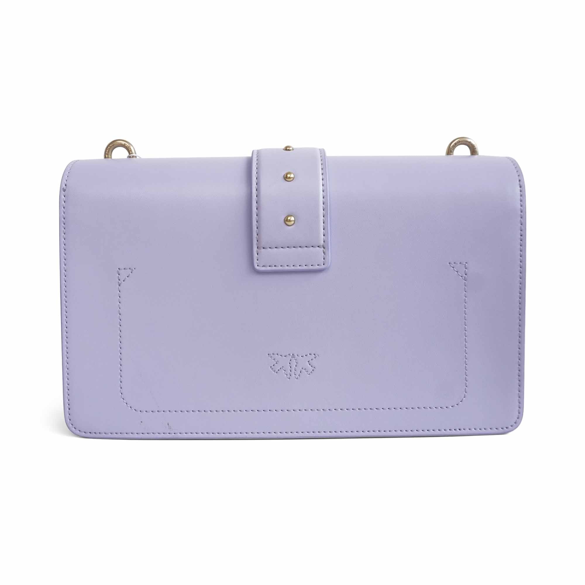 Pinko 'Love Abbraccio' flap bag in light purple leather with signature gold bird buckle accenting with roses and black stones. Features a beige microsuede lining with two open pockets and a middle zip pocket.