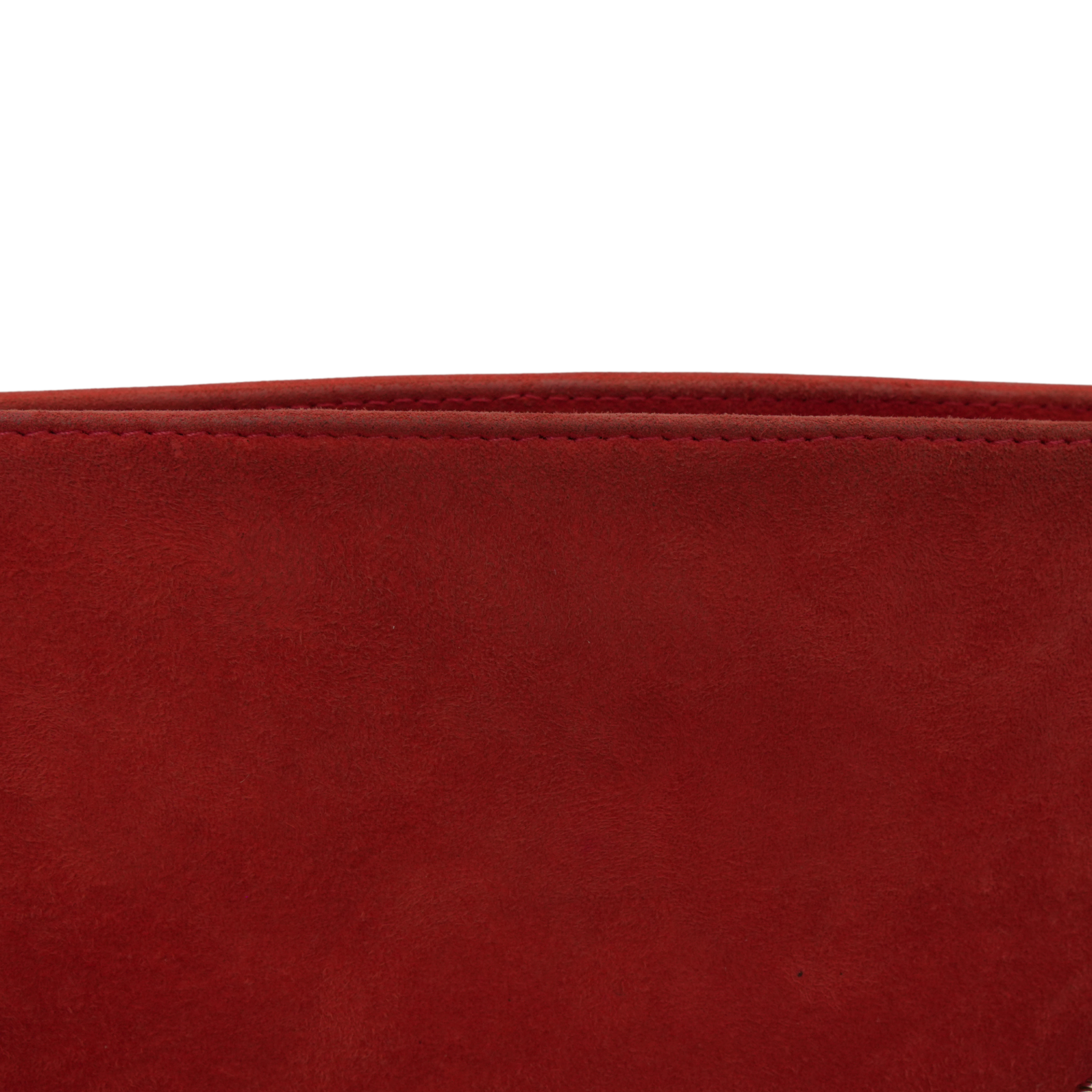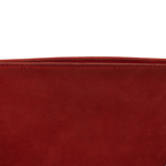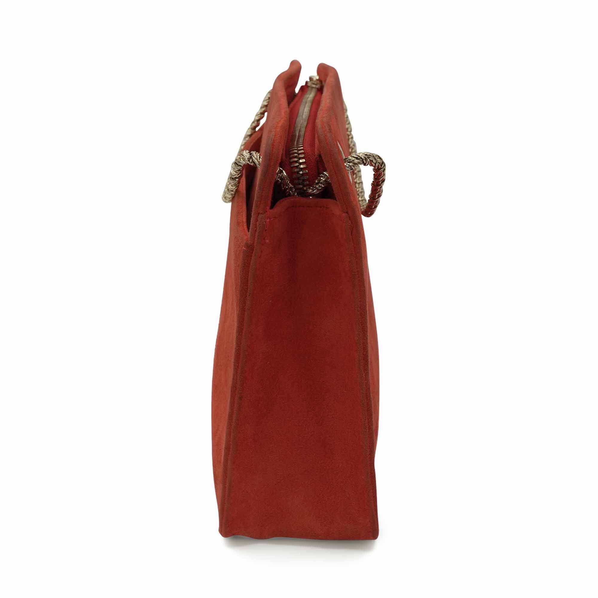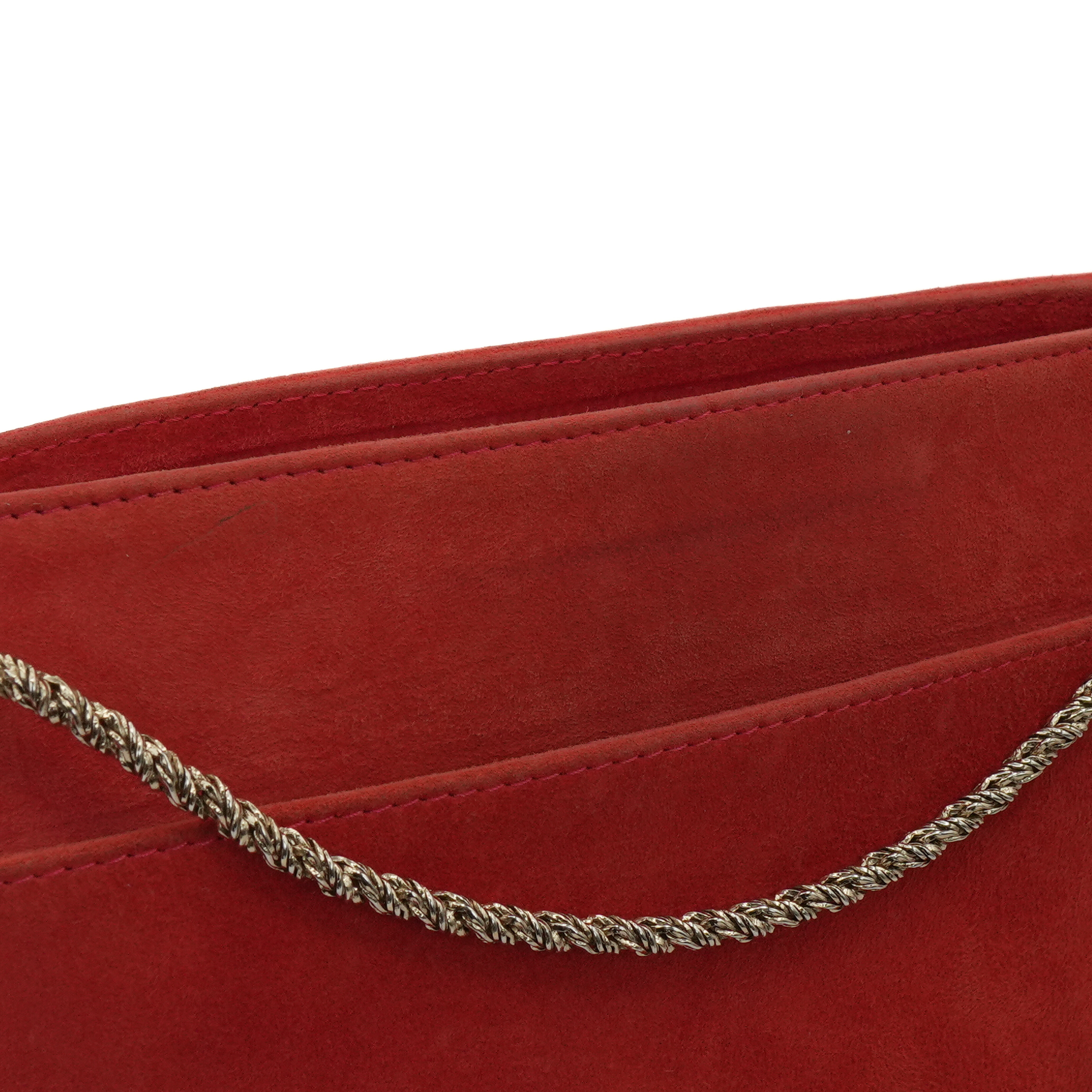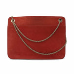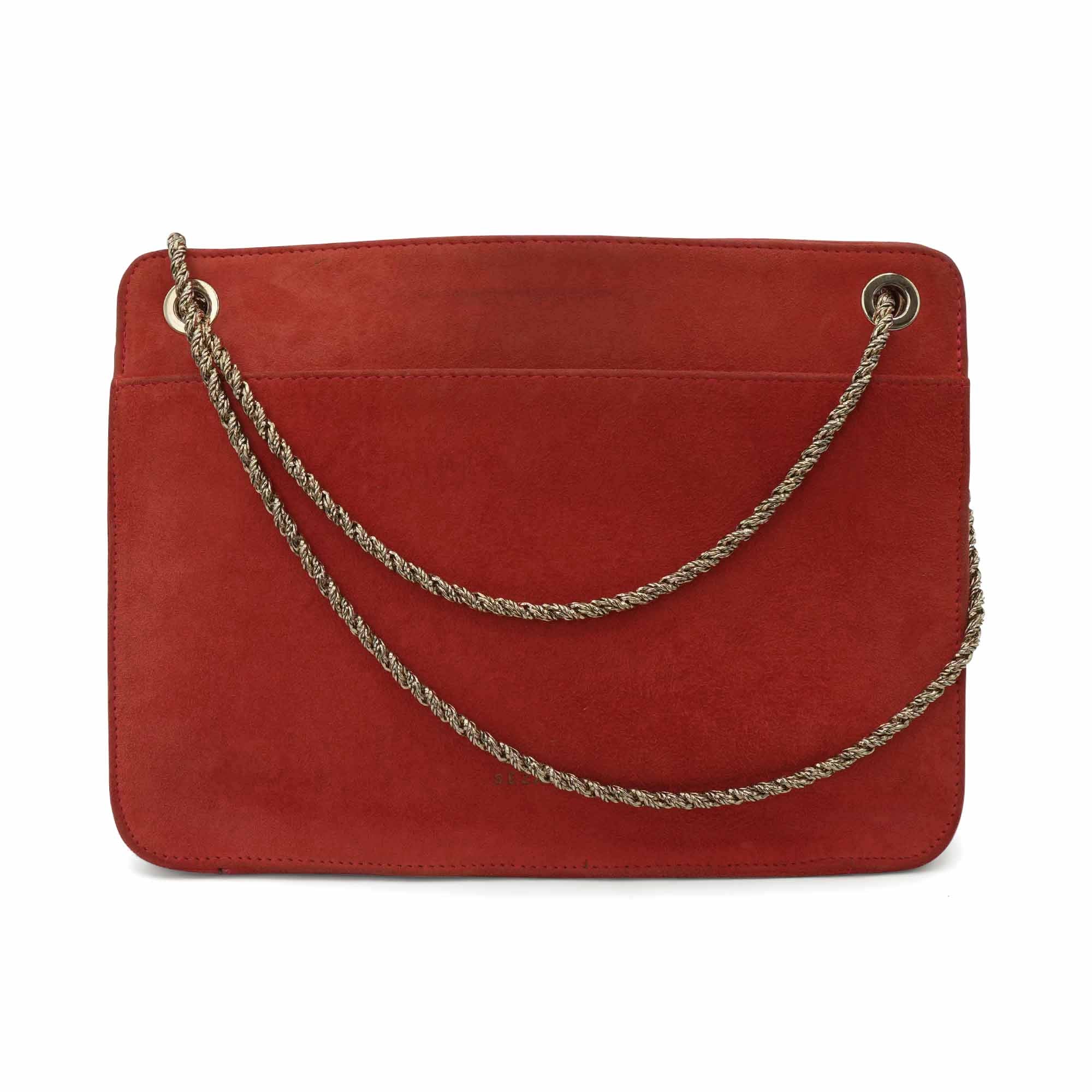 Sezane 'Abelle' crossbody bag in red/orange suede with a front slip pocket, small gold stamped logo and gold snake chain strap that can be worn crossbody or on the shoulder. Features a top zip that opens to a black canvas interior with two slip pockets.