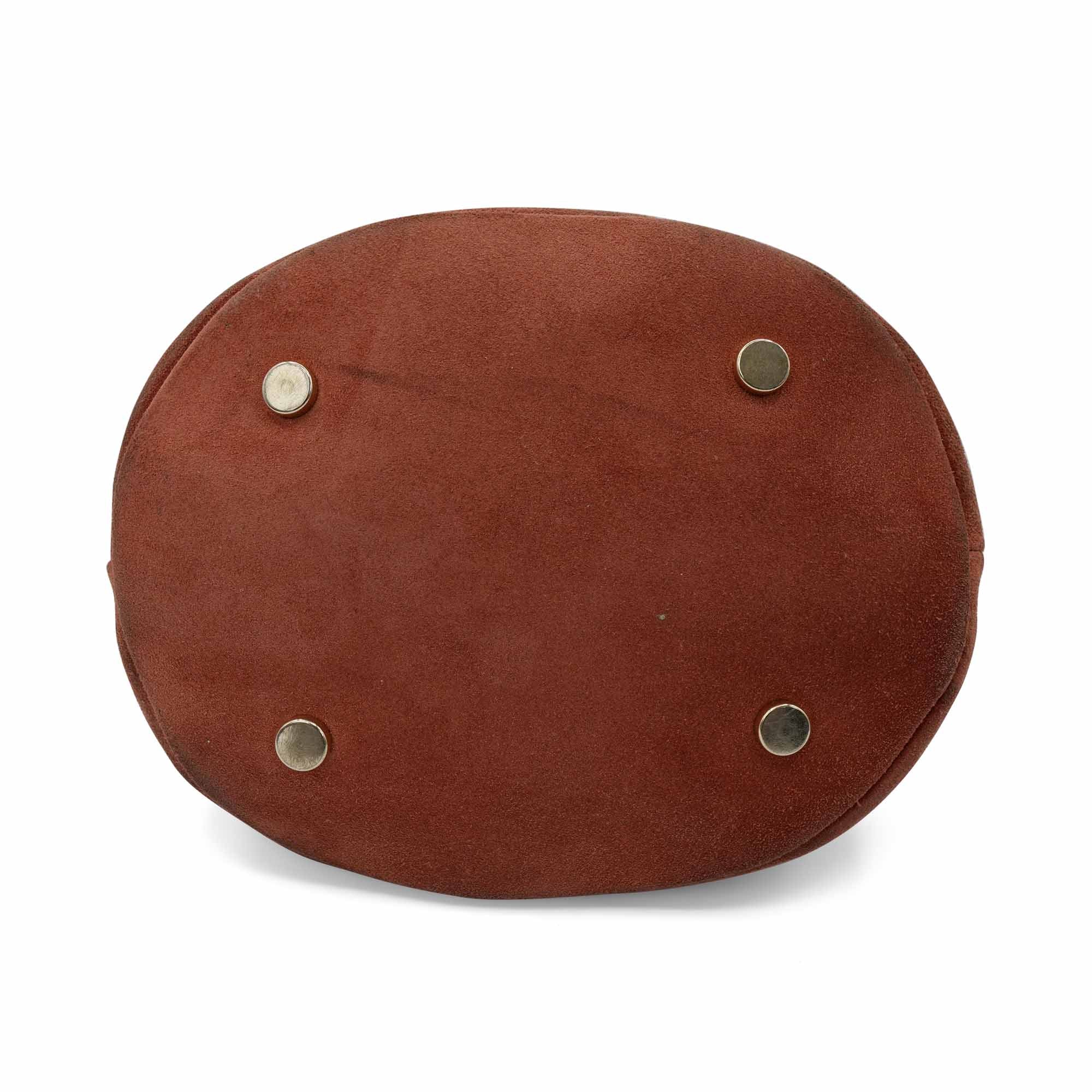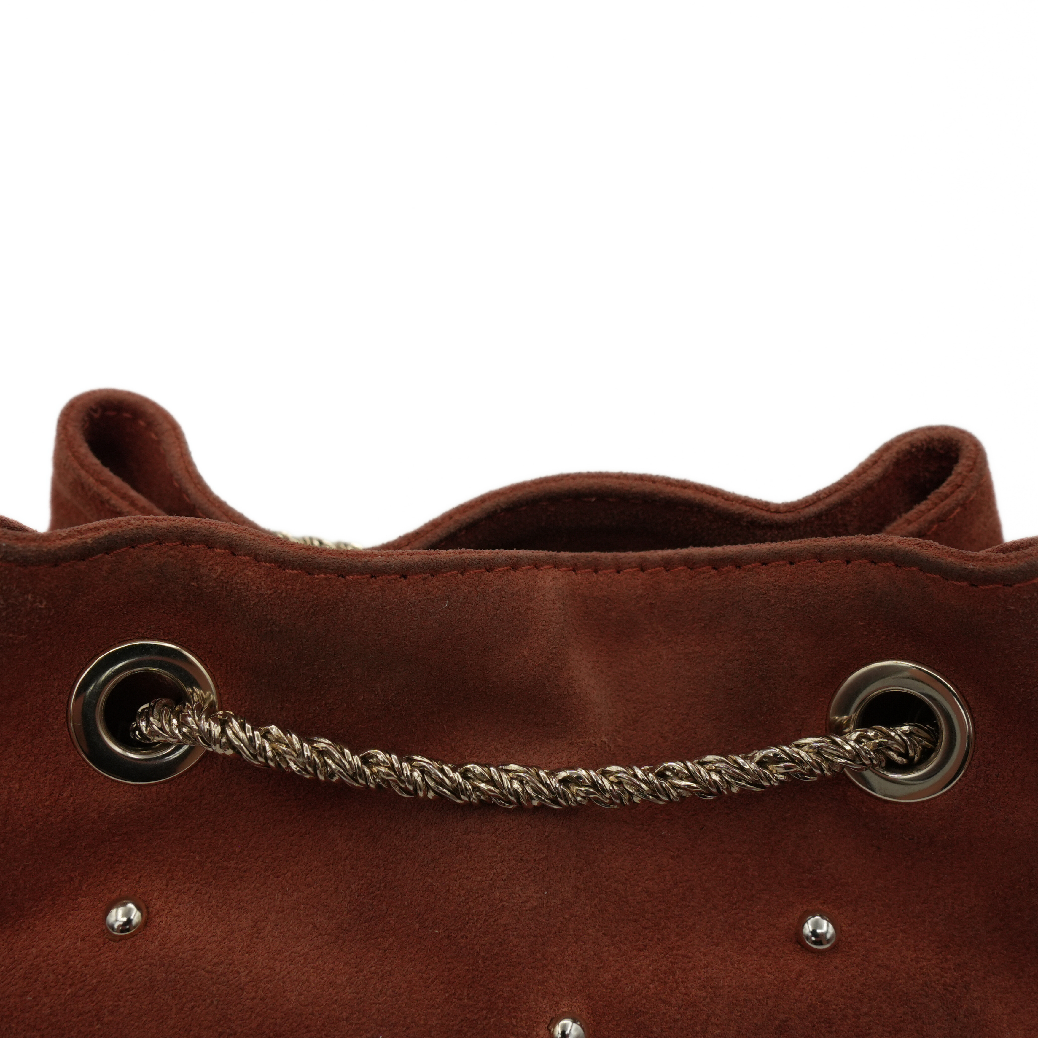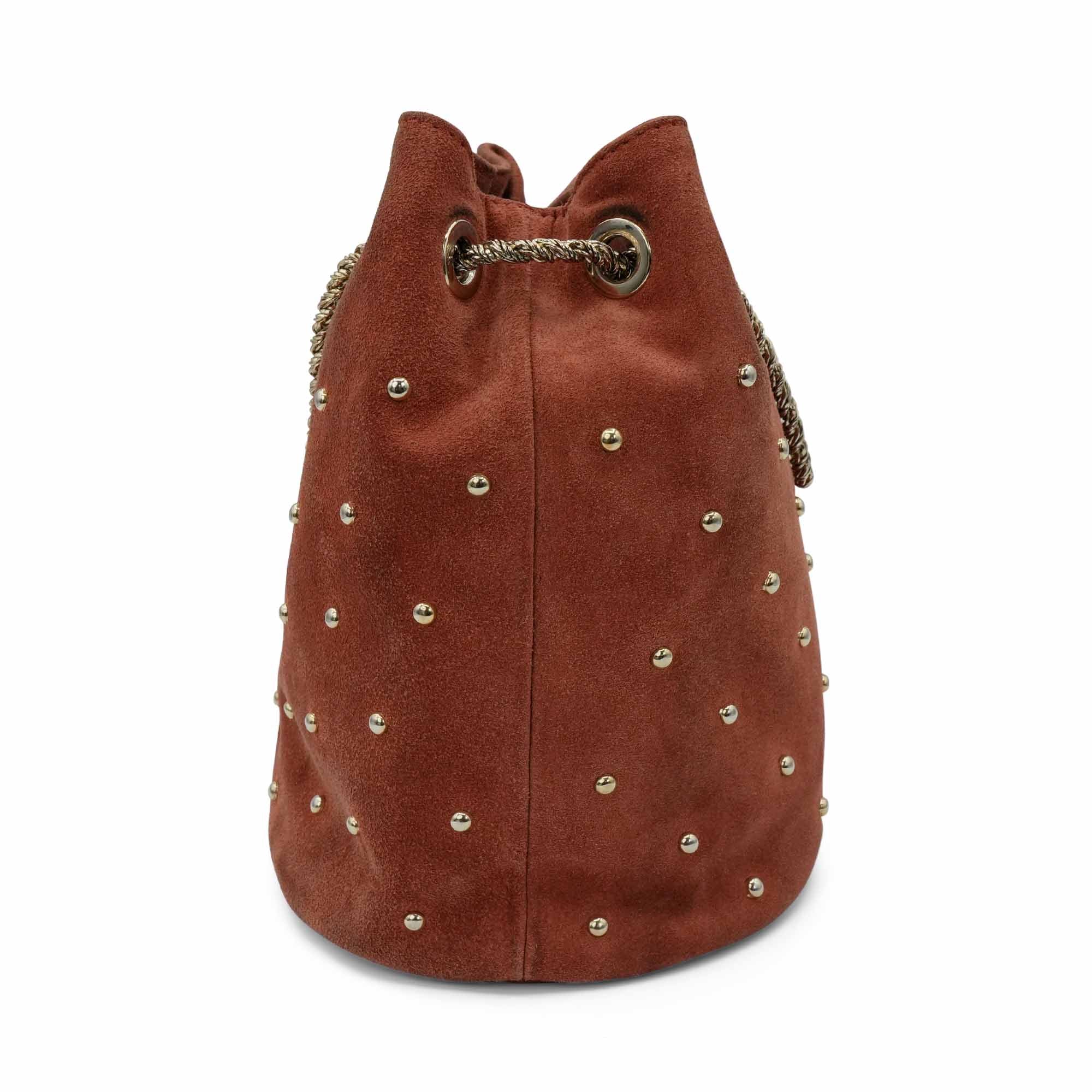 Sezane 'Studded Hope' bucket bag in auburn suede with soft gold round studs and snake chain strap that can be worn crossbody and on the shoulder. Interior features black canvas lining and zip pocket.