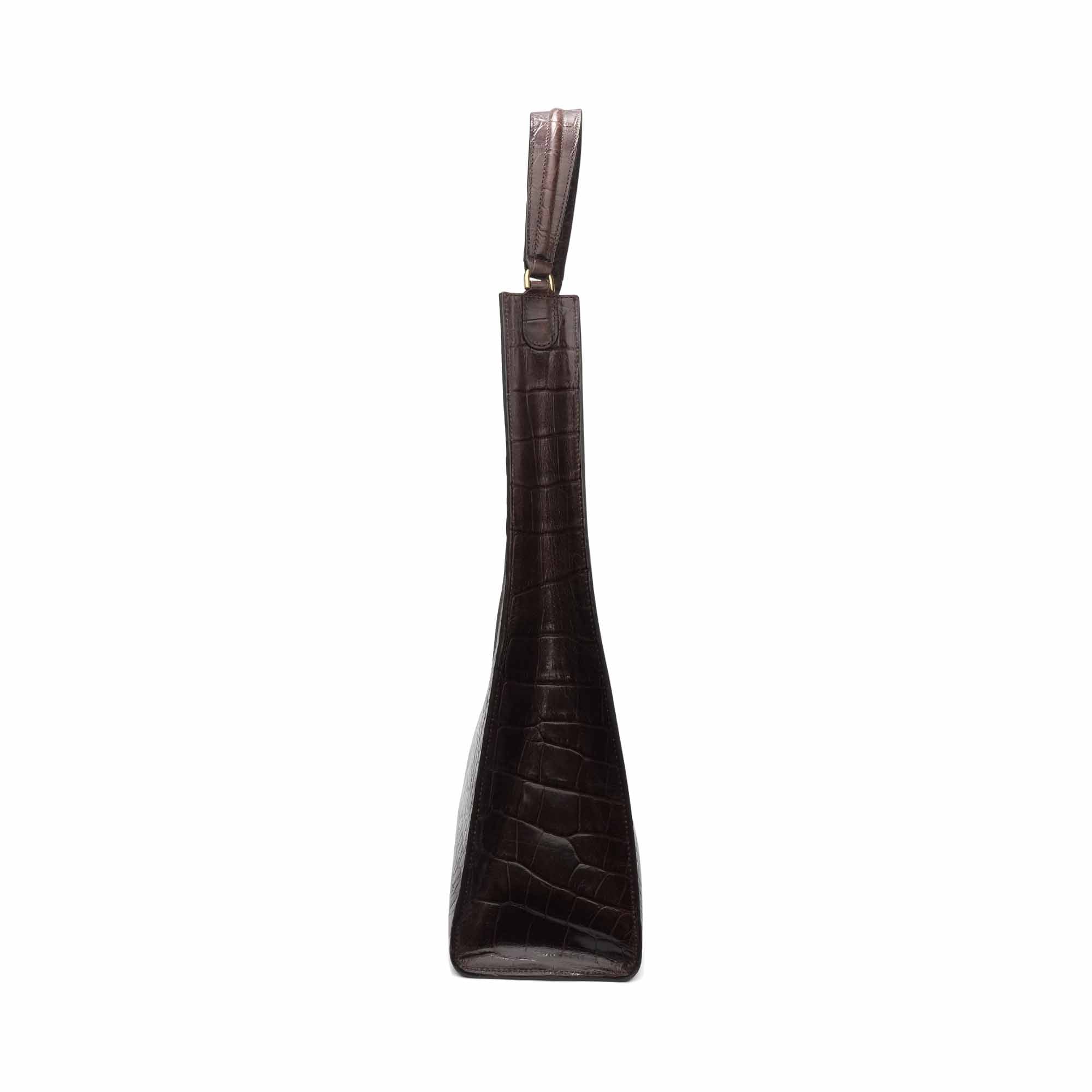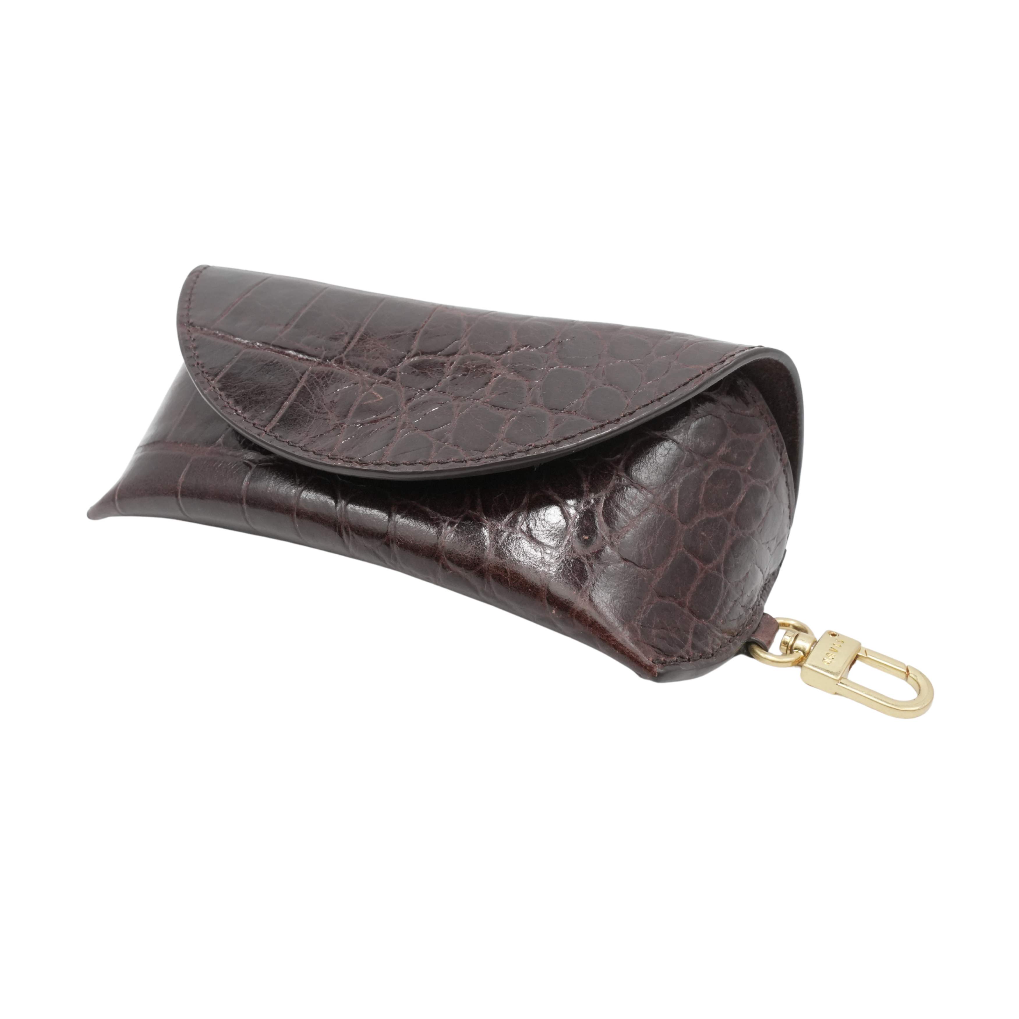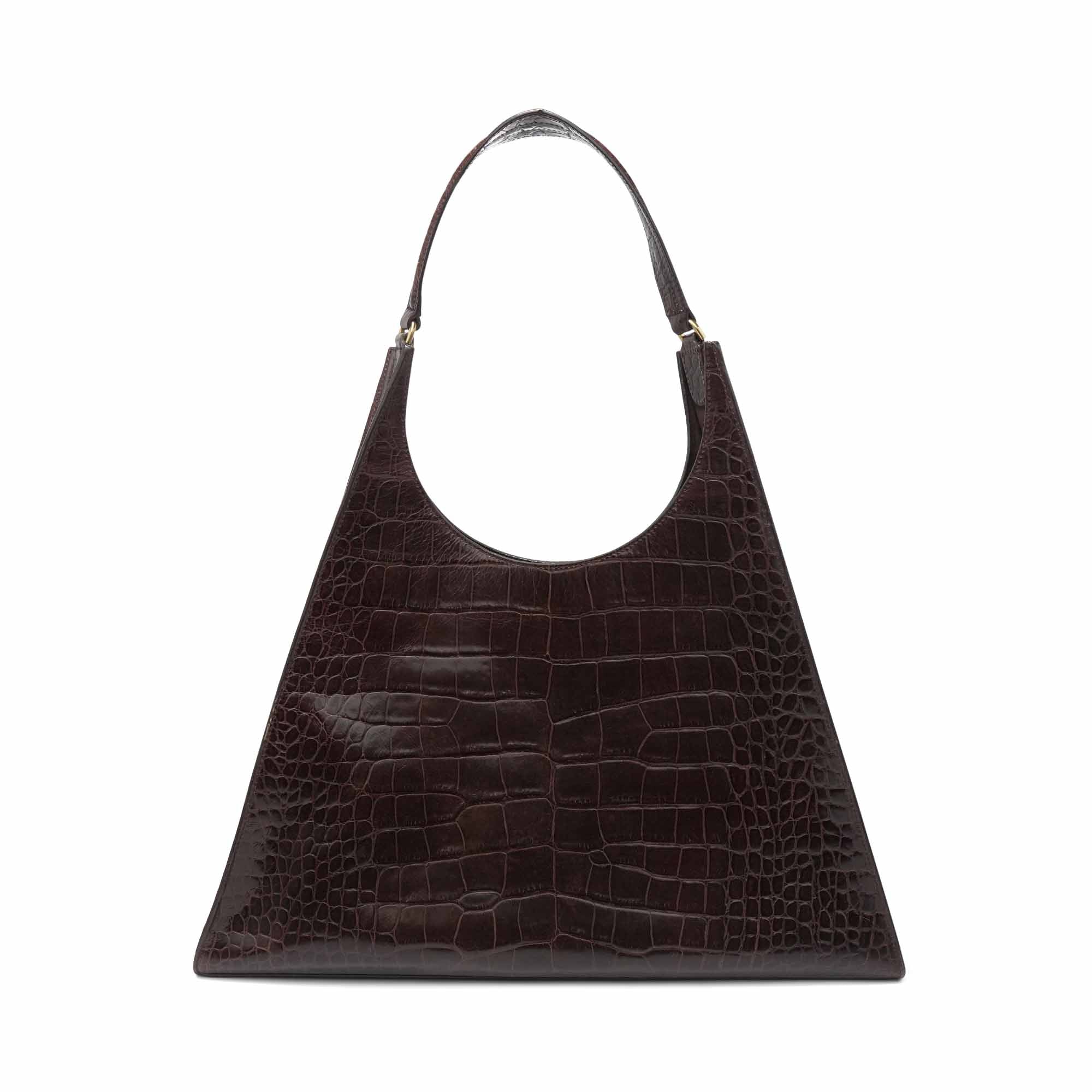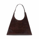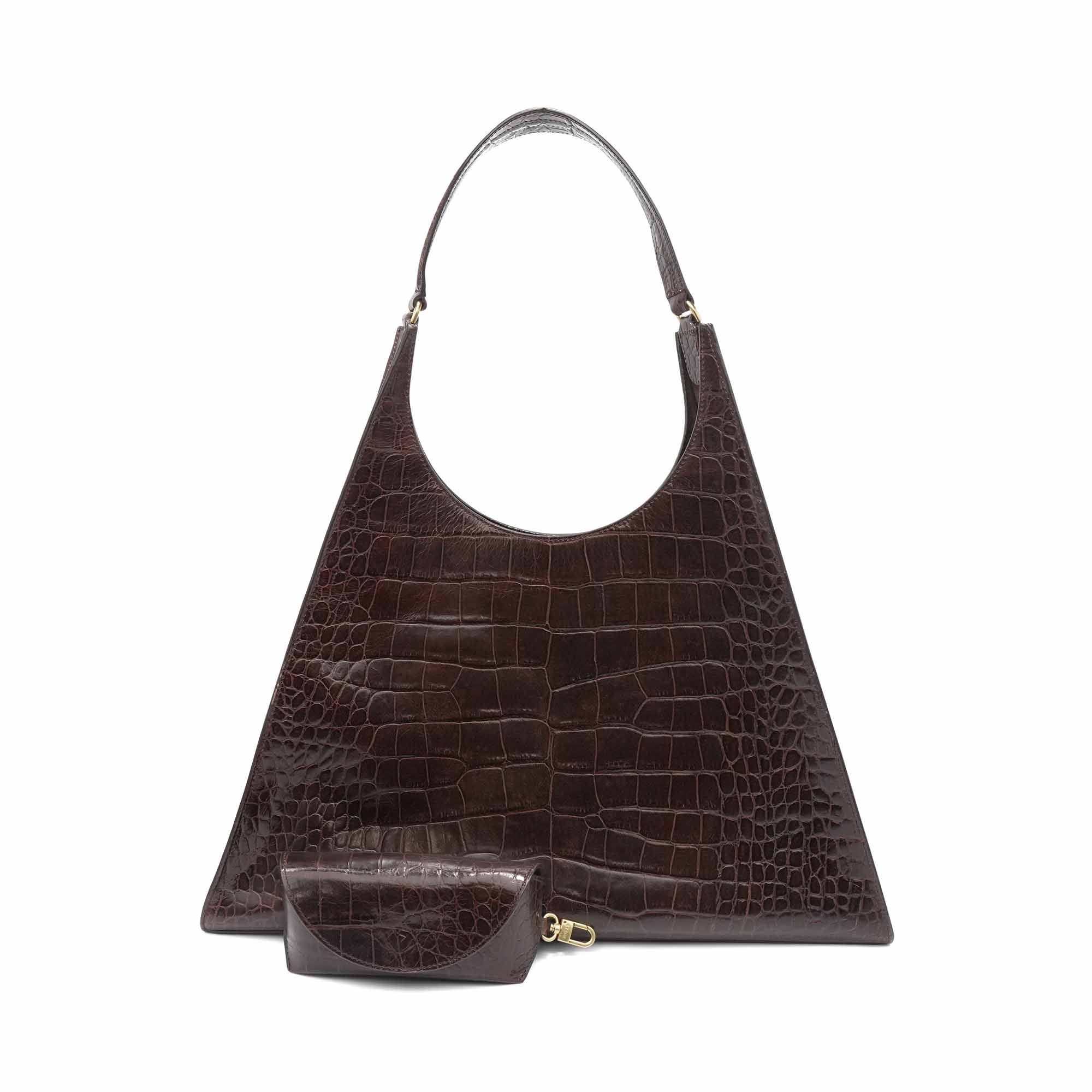 Staud 'Rey' angular shoulder bag in brown croc embossed leather. Features gold hardware, a snap closure and a matching sunglasses case.