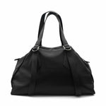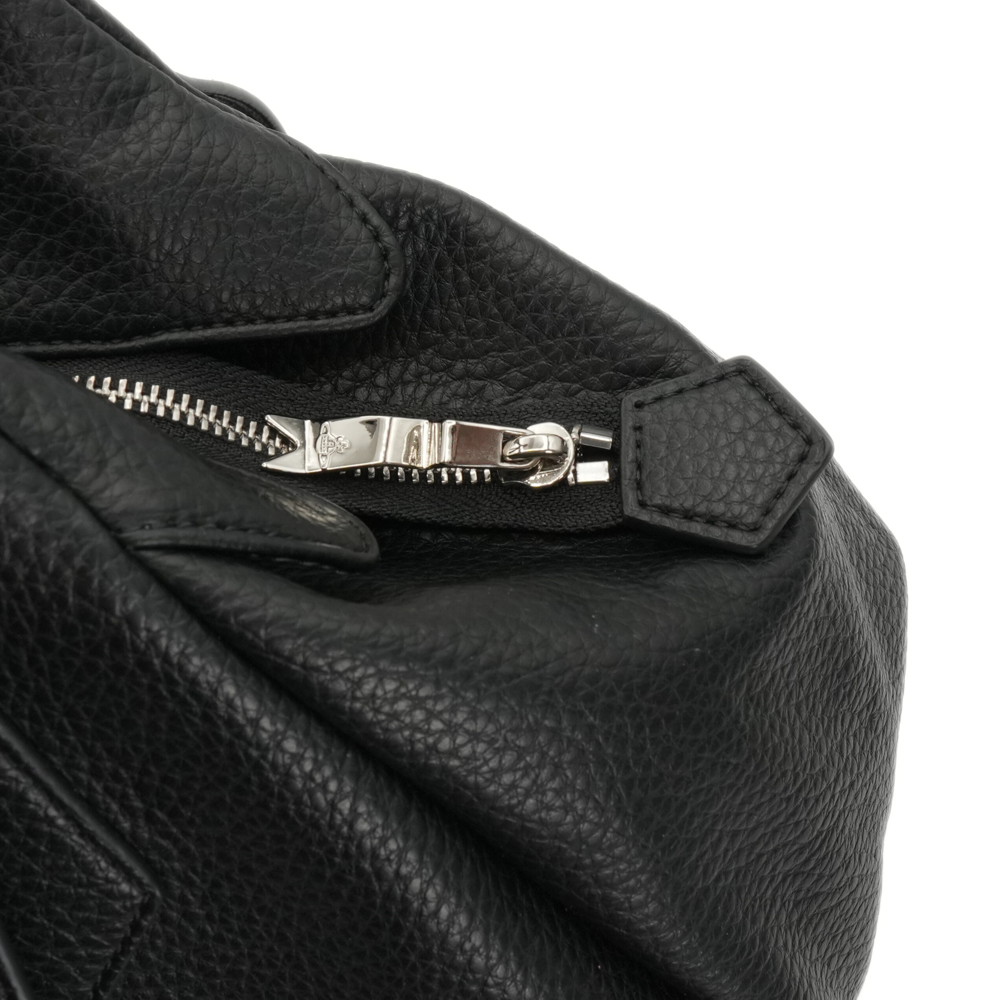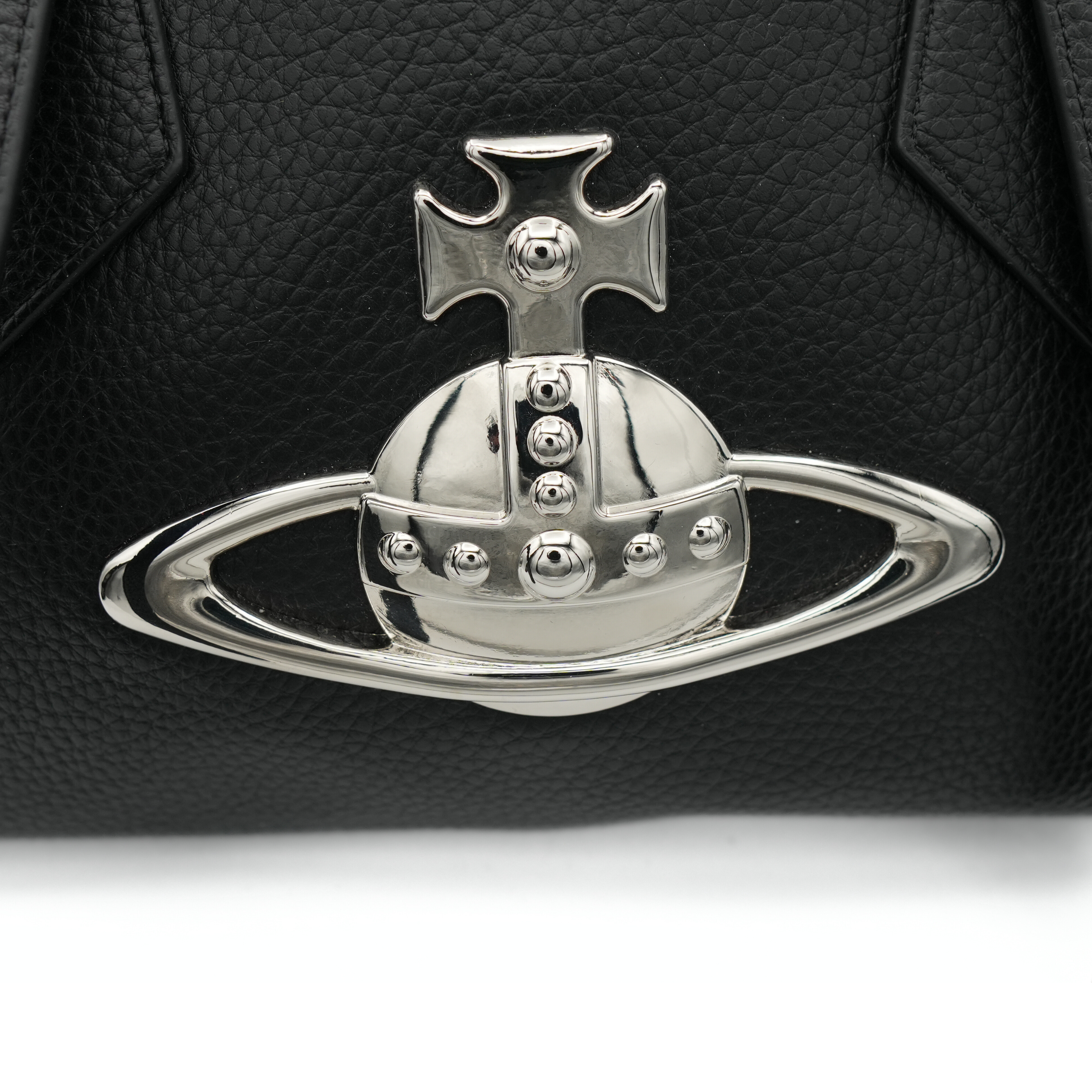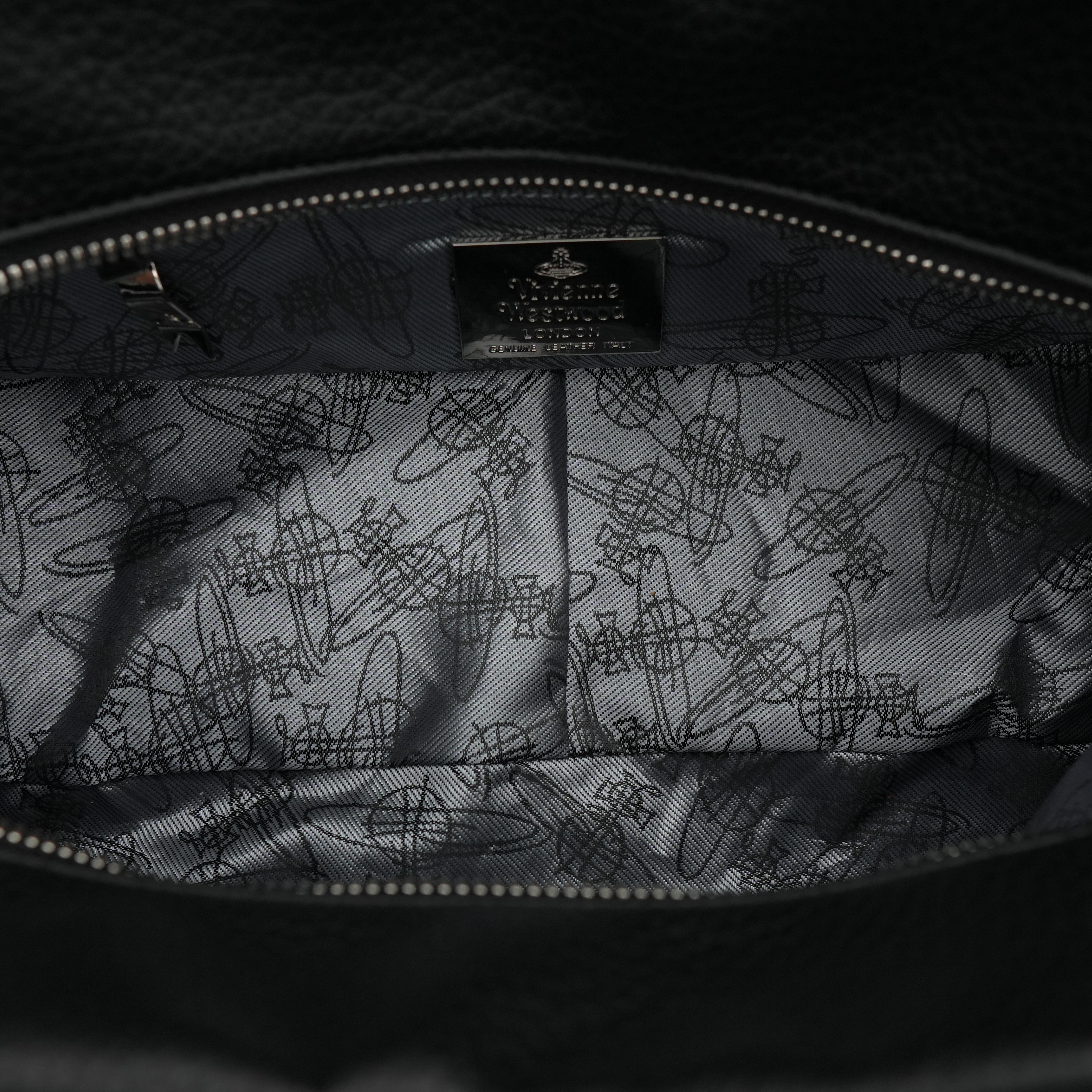 Vivienne Westwood 'Big Orb' boston shoulder bag in black leather with dual adjustable top handles and large orb logo on the front in silver hardware. Interior features a silver blue satin orb-patterned lining with zip pocket.