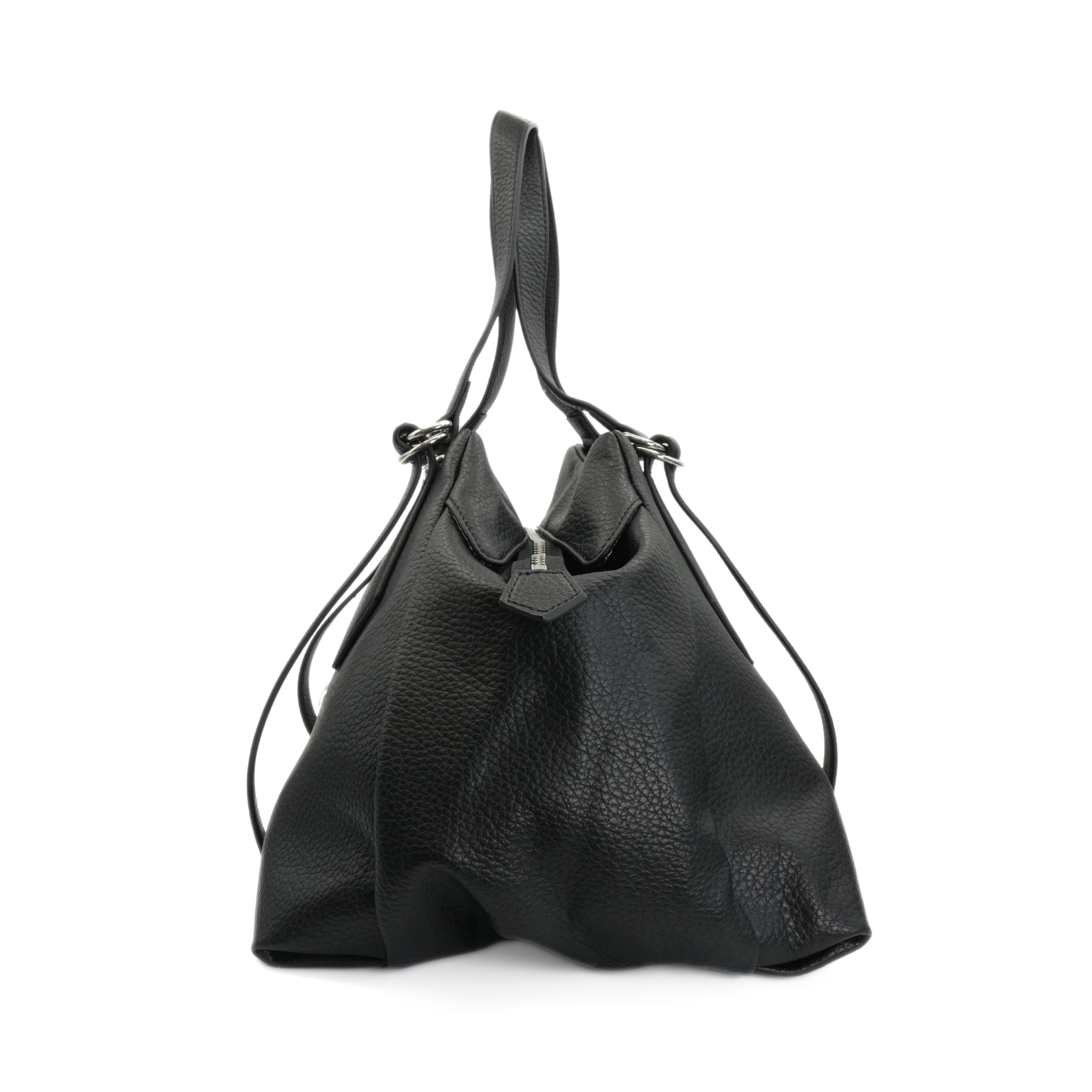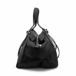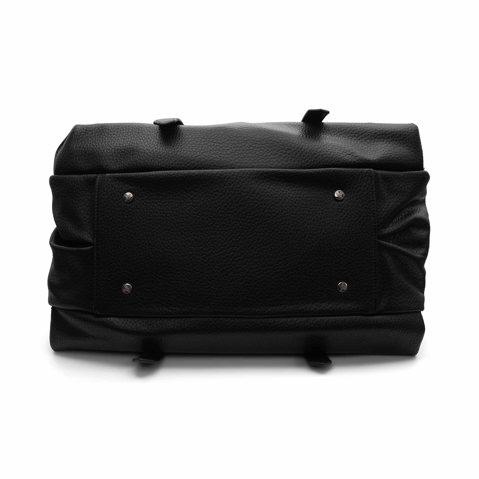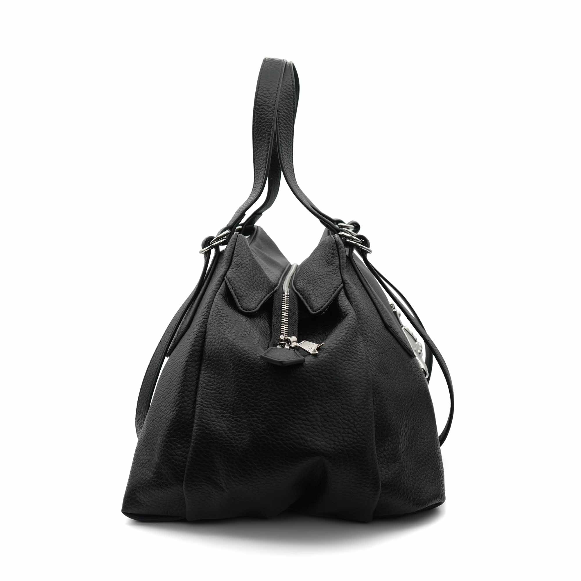 Vivienne Westwood 'Big Orb' boston shoulder bag in black leather with dual adjustable top handles and large orb logo on the front in silver hardware. Interior features a silver blue satin orb-patterned lining with zip pocket.