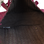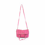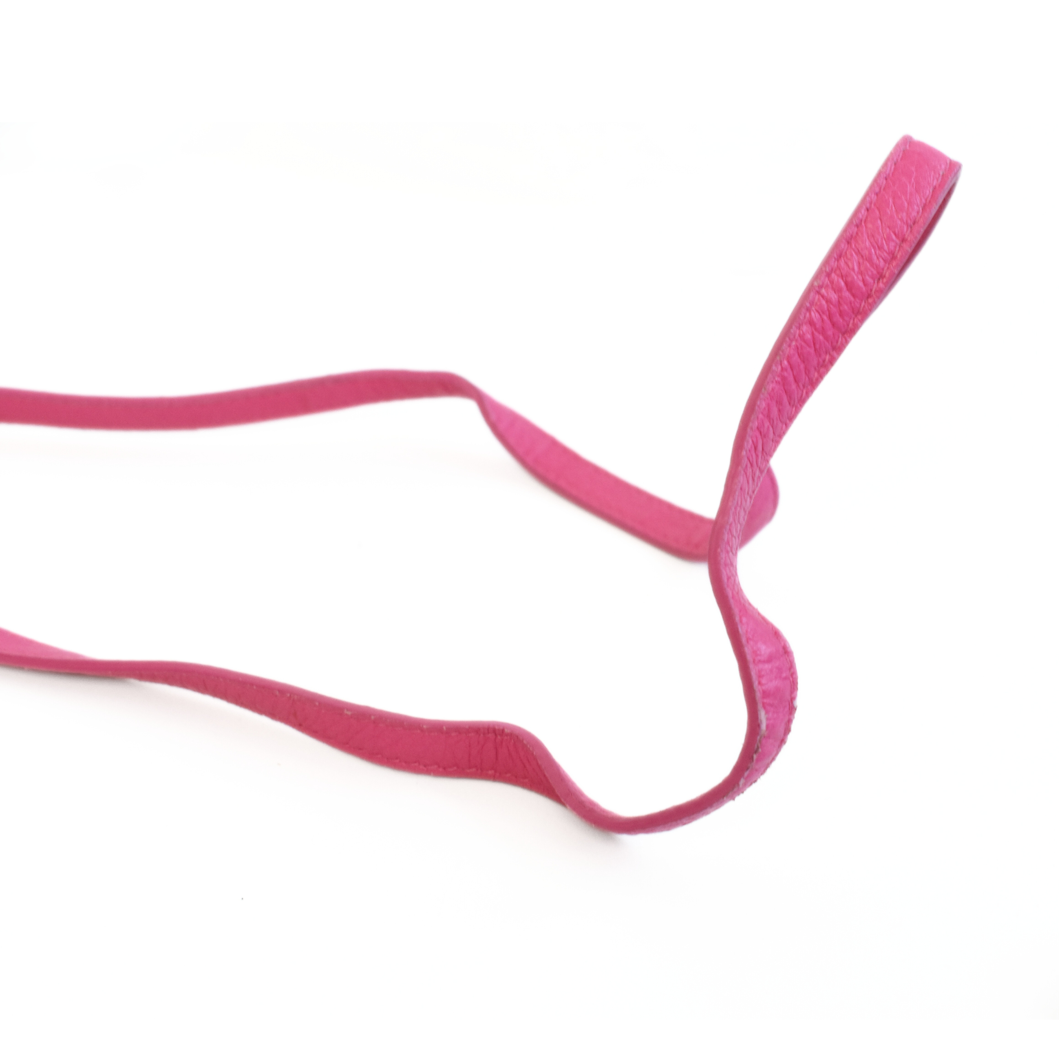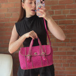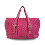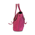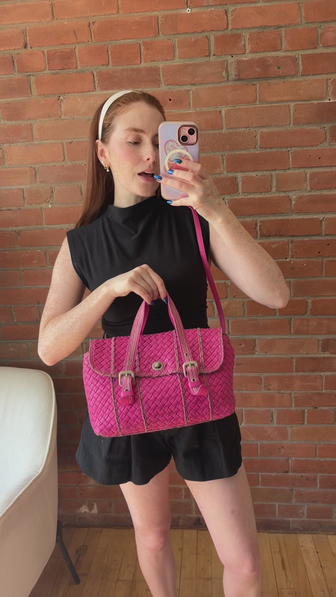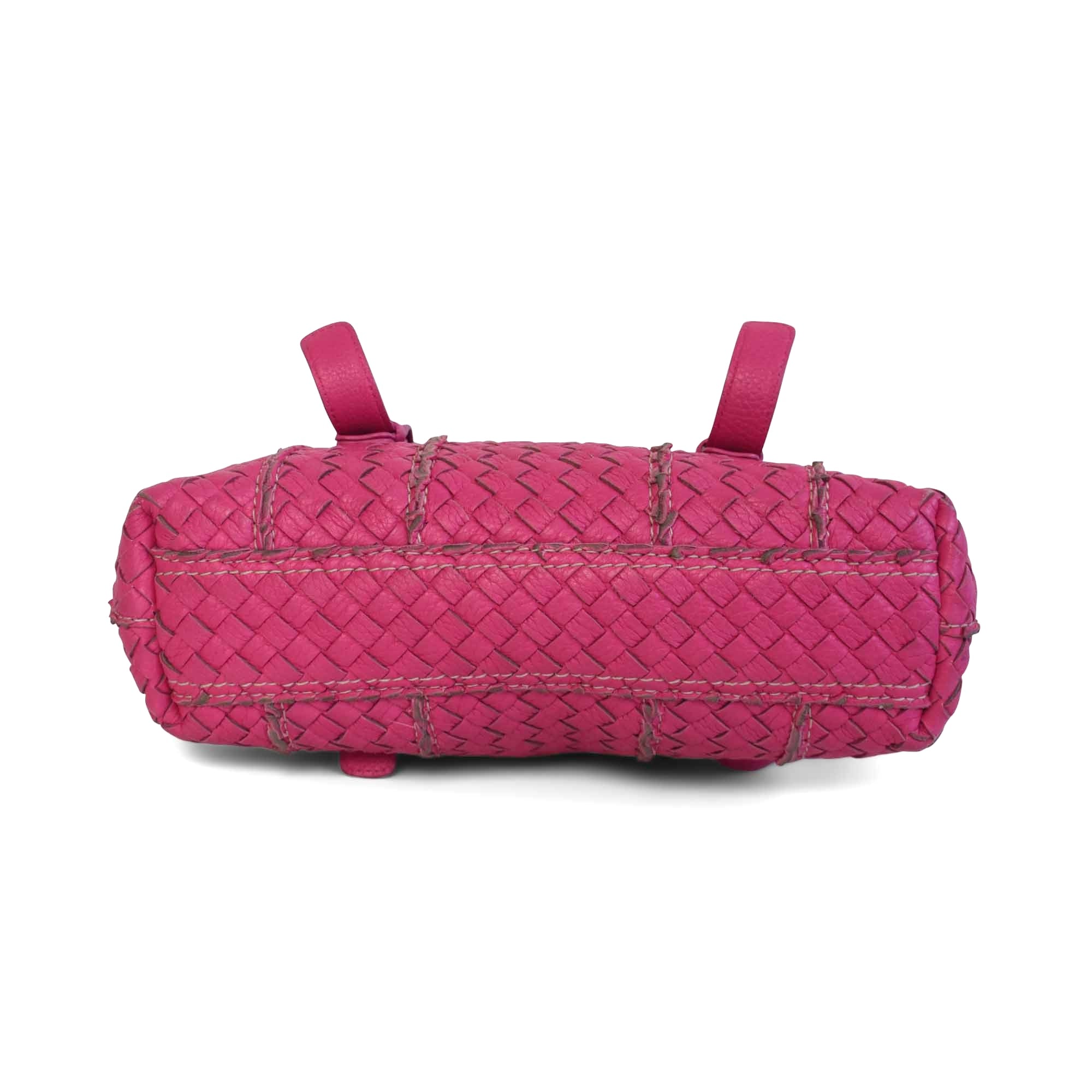 Bottega Veneta 'Vivo Cervo' satchel bag in hot pink intrecciato leather with matte beige hardware and white contrast stitching. Features a turnlock flap closure, inlined pocket, adjustable flat handle, and removable crossbody strap.