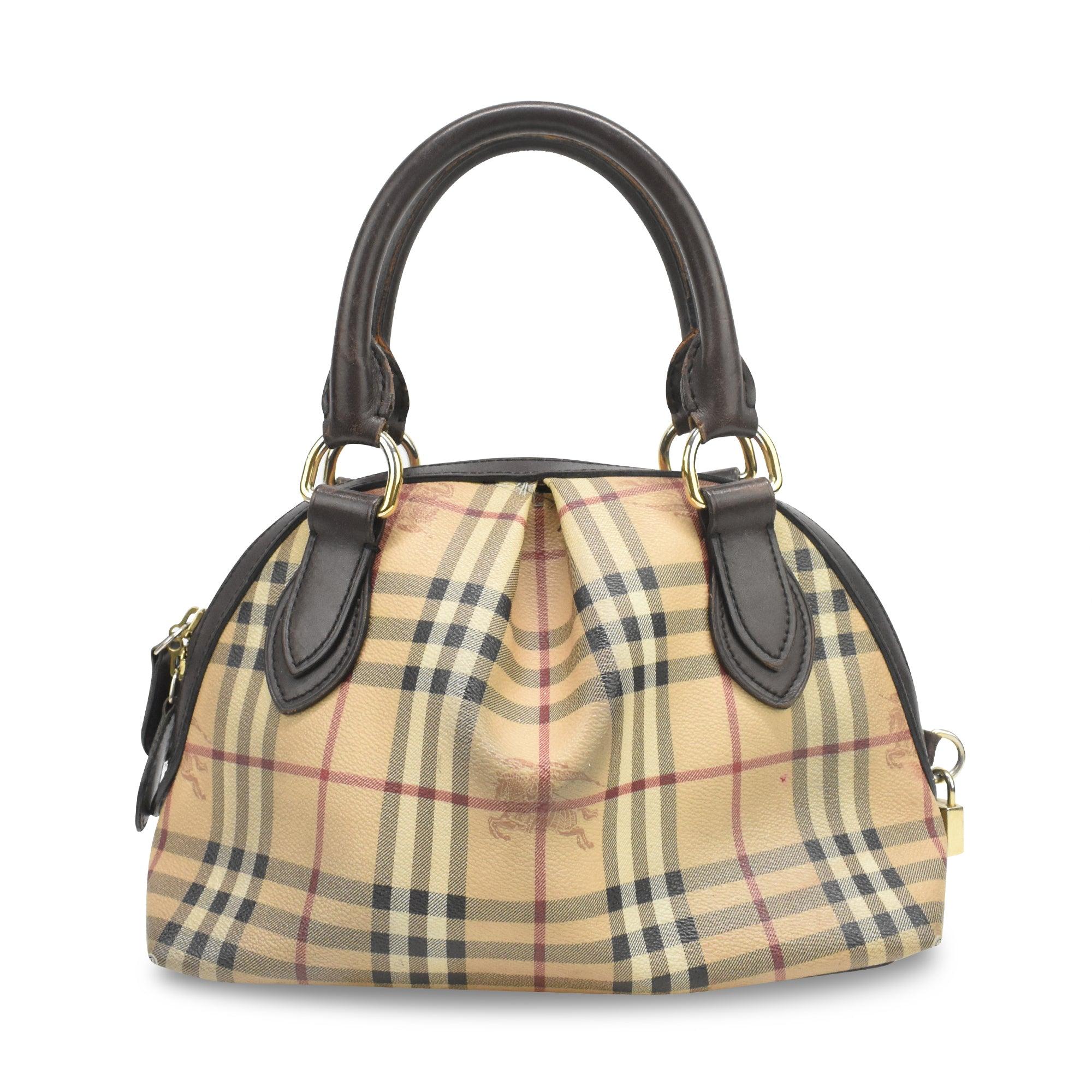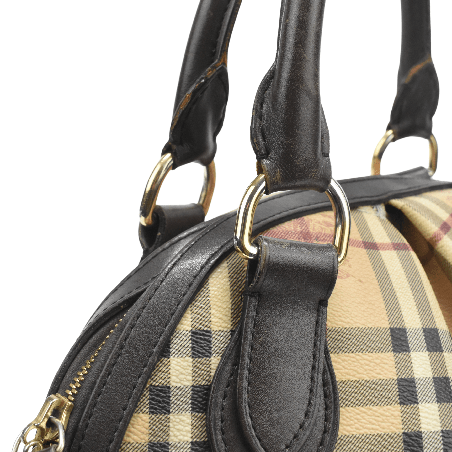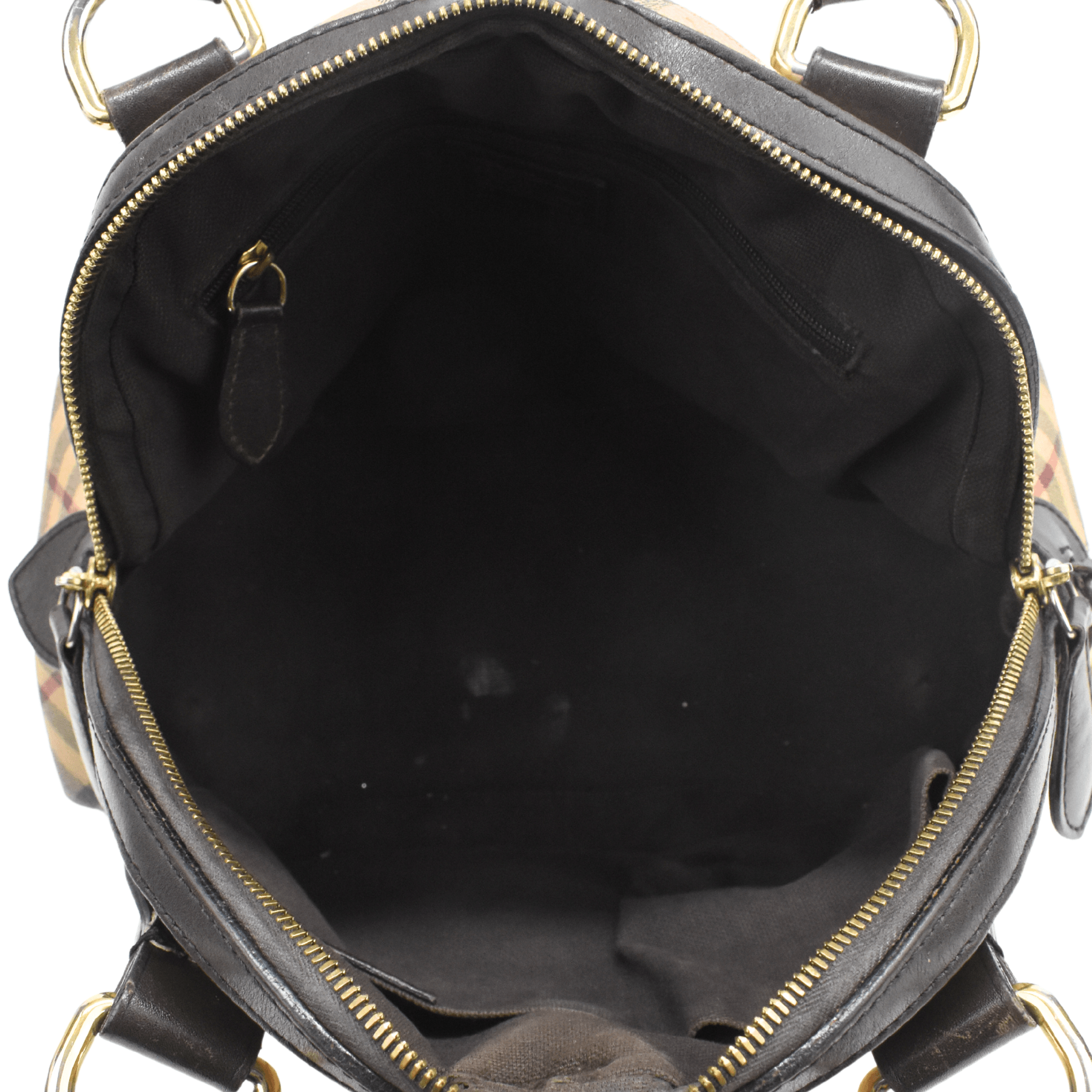 Burberry handbag in brown novacheck coated canvas with pleated detail, brown leather trim and a top double zip closure in gold hardware. Features dual top handles, a lock detail and brown canvas lining with inner zip and open pockets.