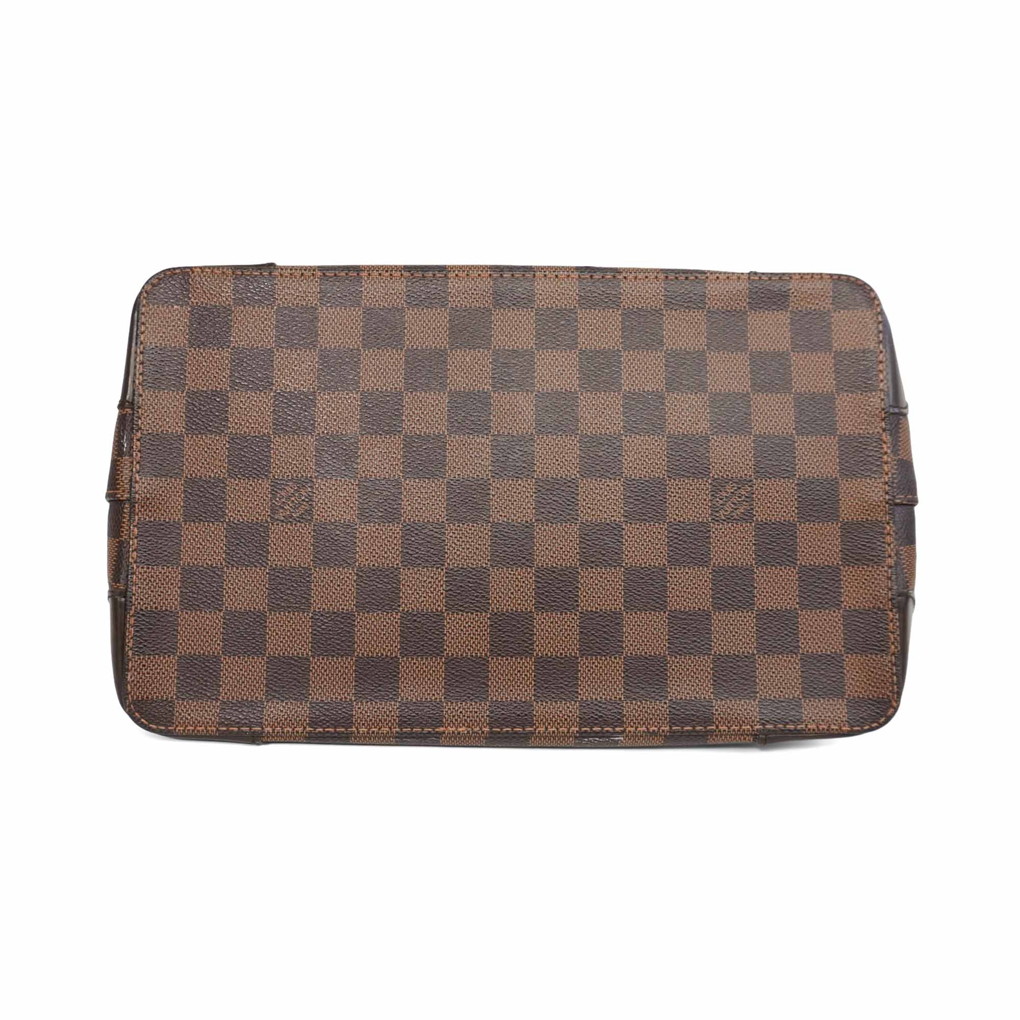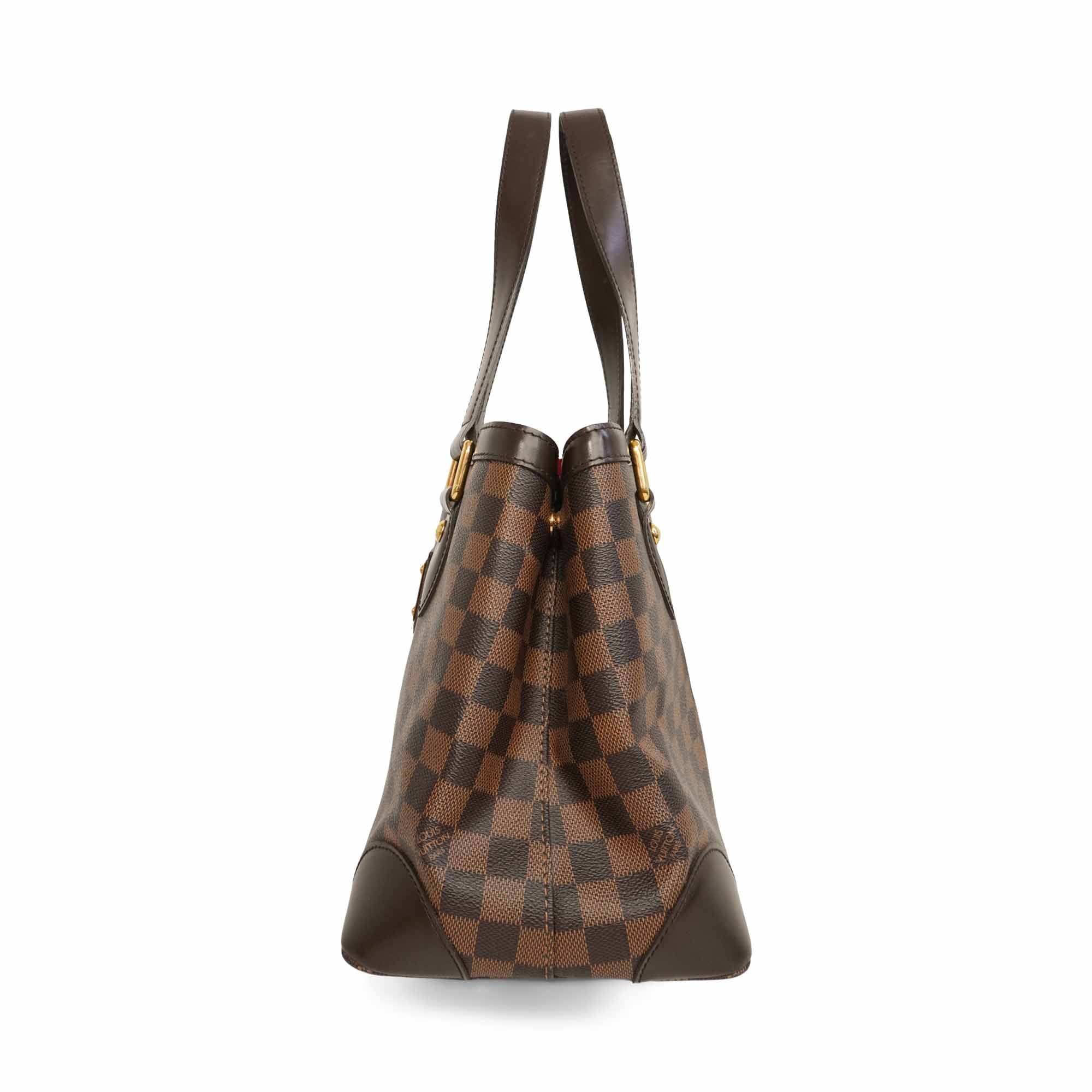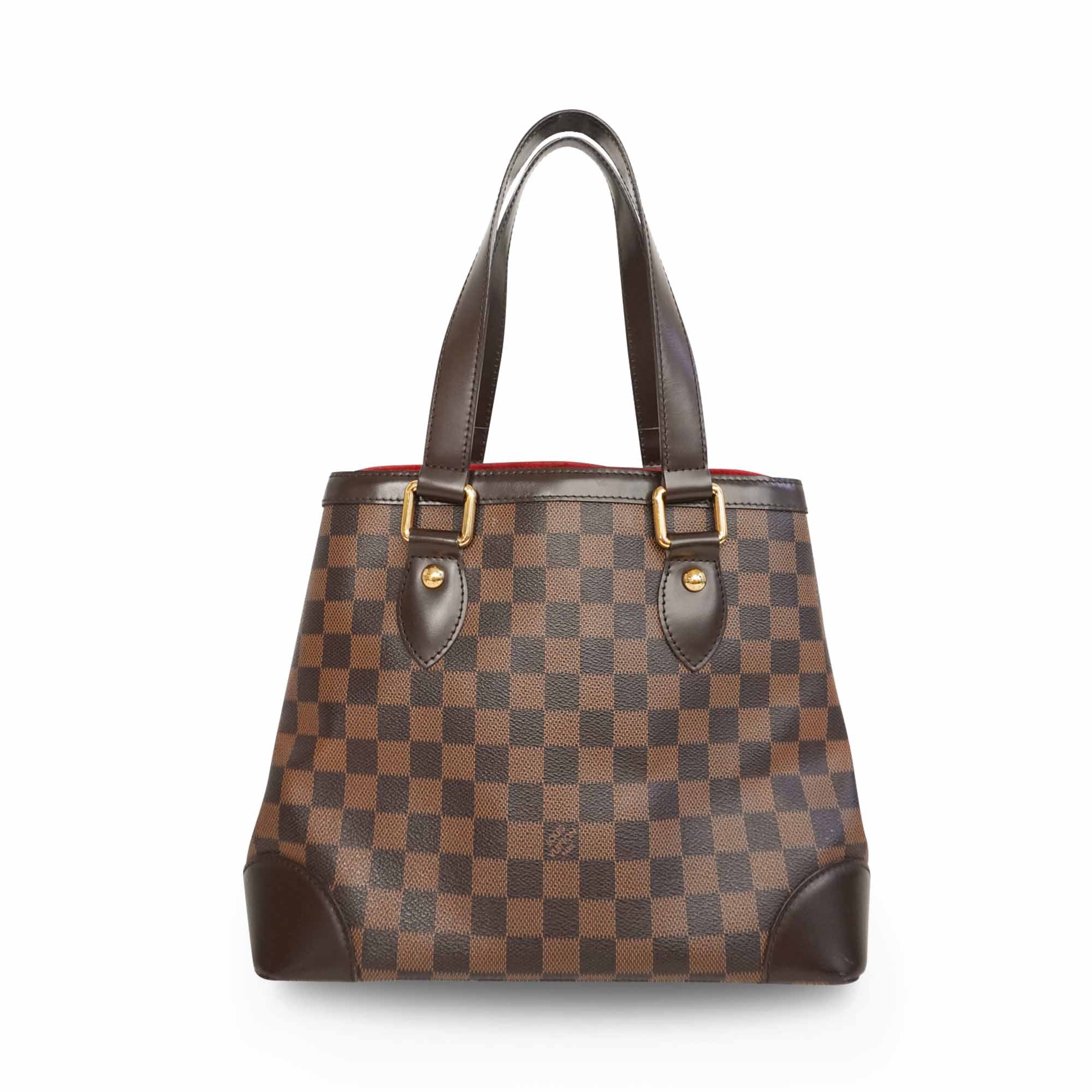 Louis Vuitton 'Hampstead PM' bucket bag in damier ebene coated canvas with dark brown leather trim. Features gold hardware including a front logo plaque, red suede lining, one inner zip pocket and two small slip pockets, and a hook-clasp closure.