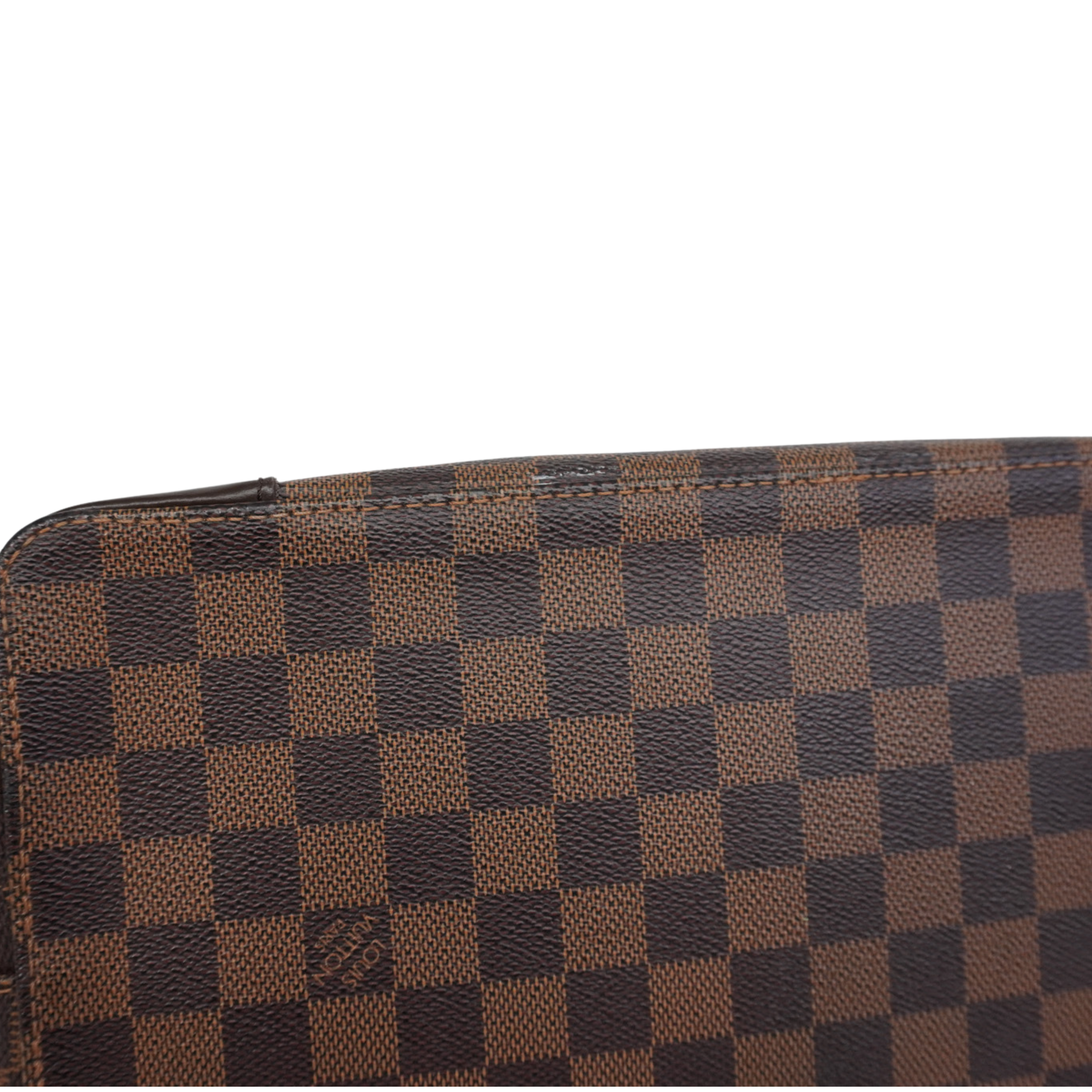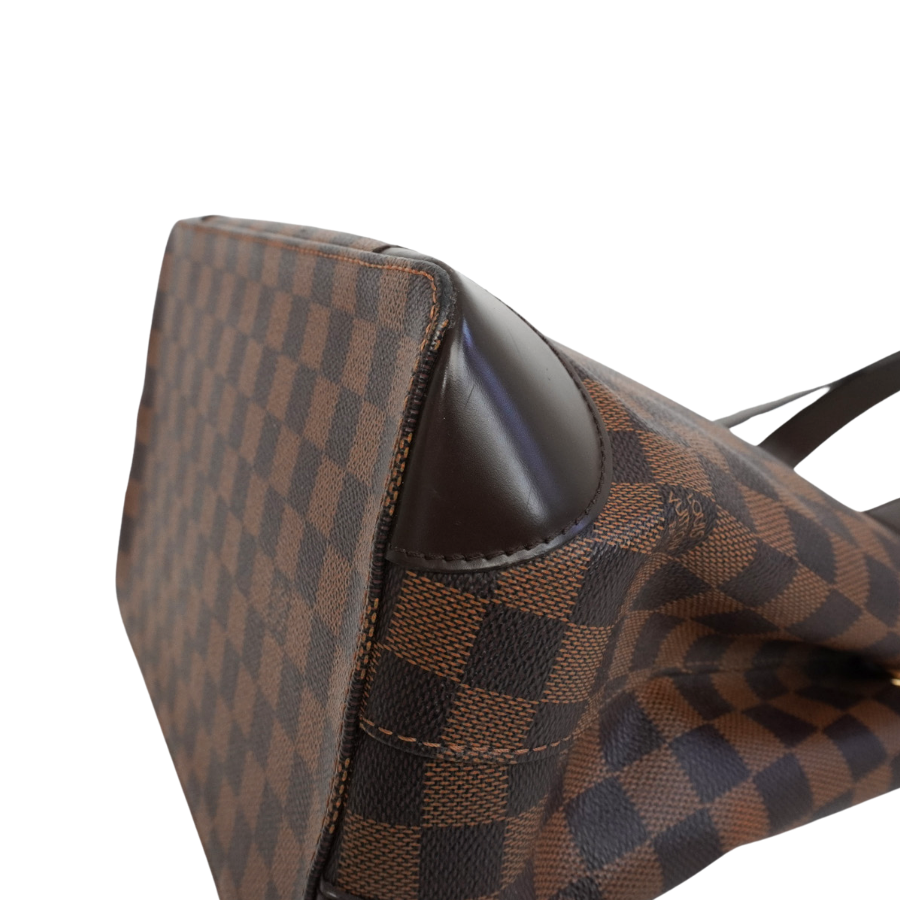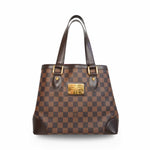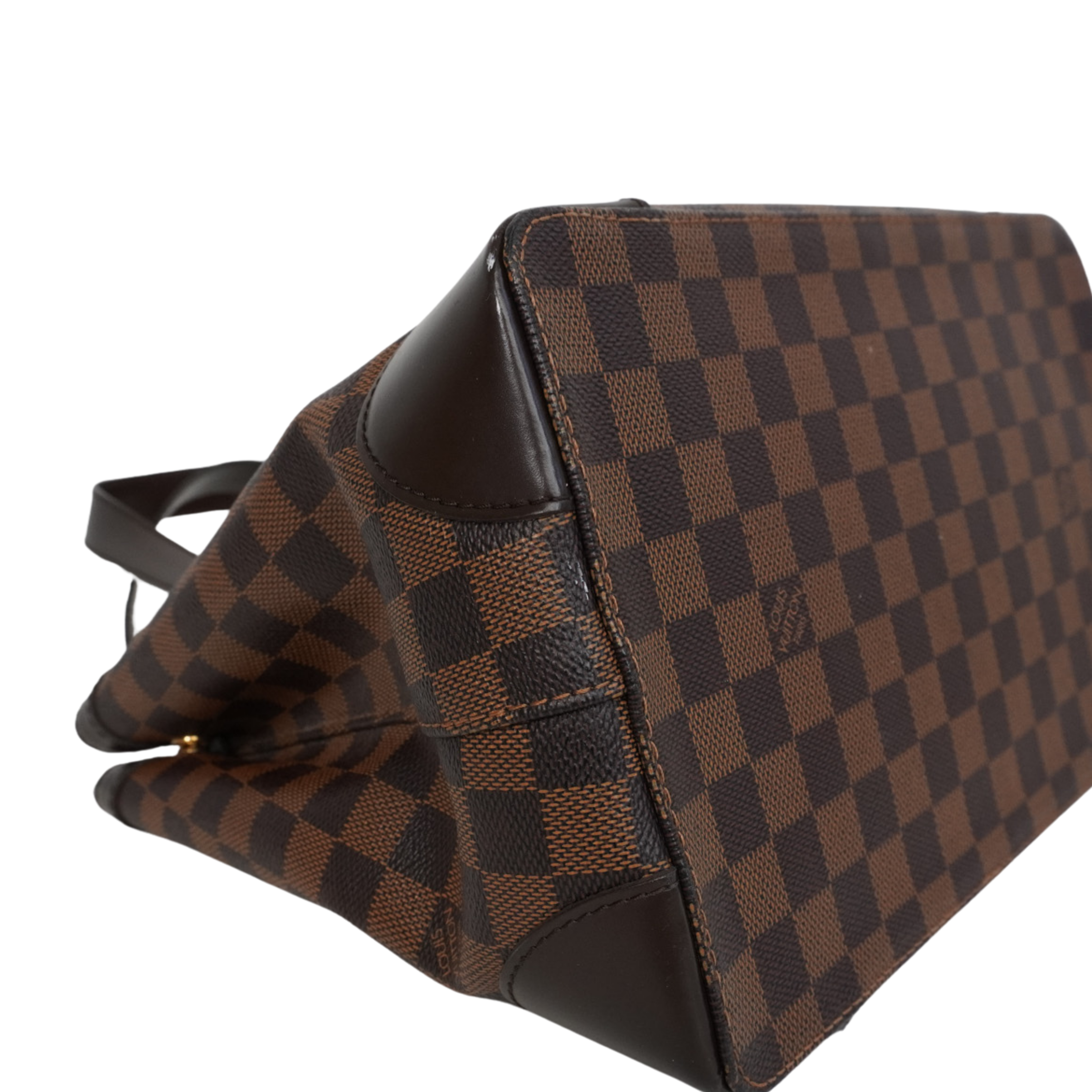 Louis Vuitton 'Hampstead PM' bucket bag in damier ebene coated canvas with dark brown leather trim. Features gold hardware including a front logo plaque, red suede lining, one inner zip pocket and two small slip pockets, and a hook-clasp closure.