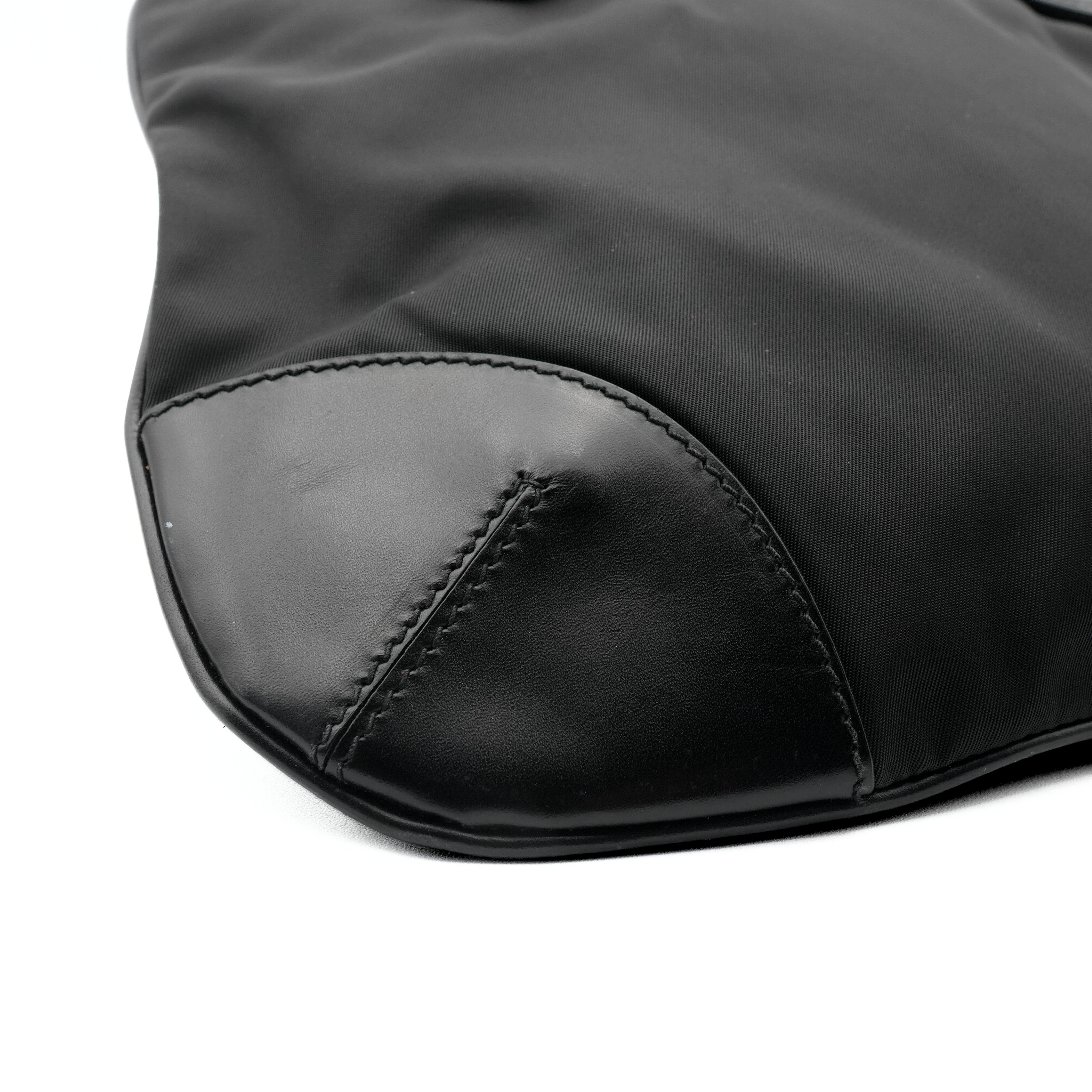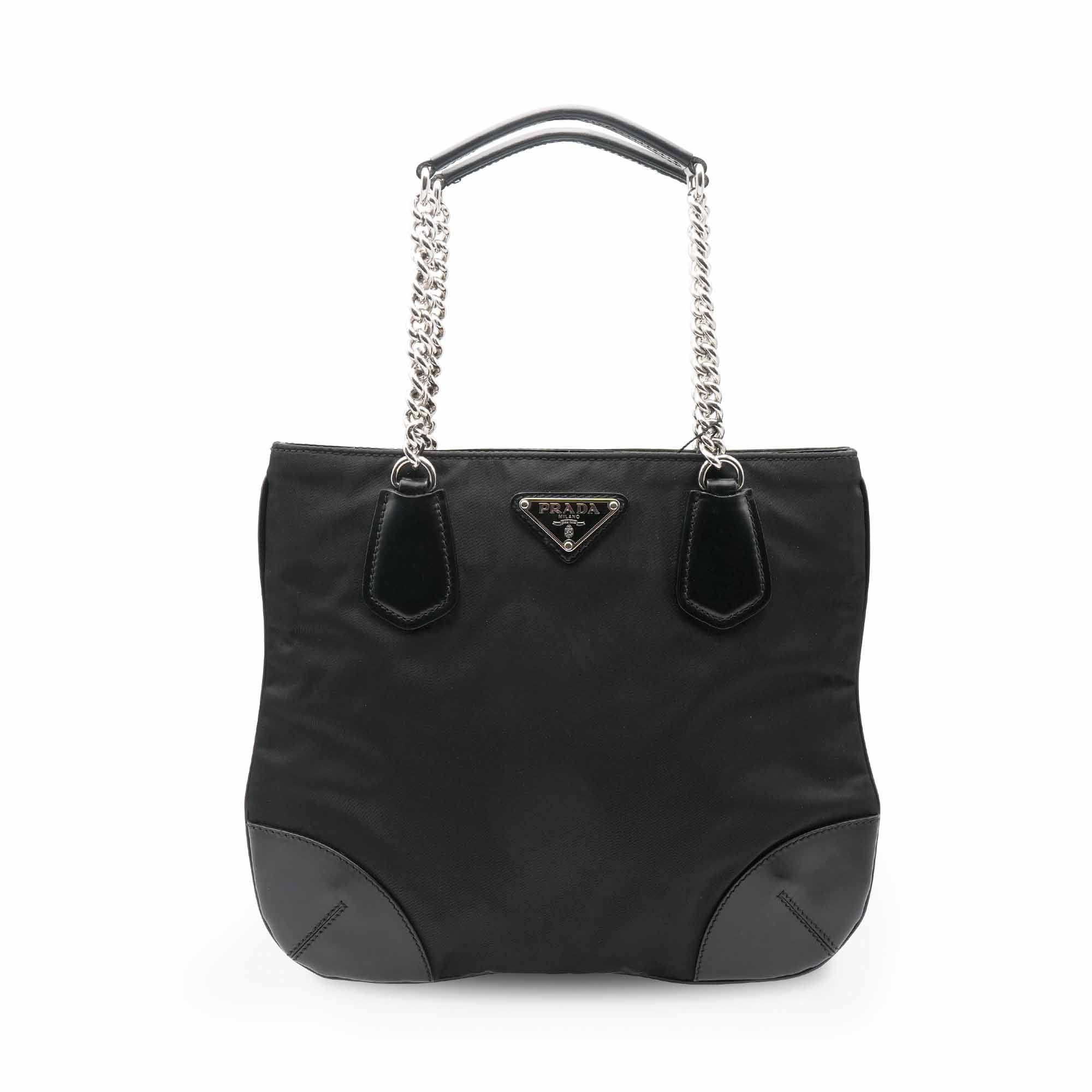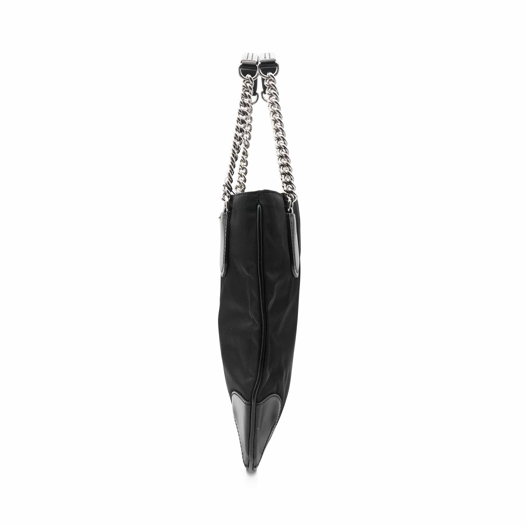 Prada flat handbag in black nylon with leather detailing and a silver triangle logo plaque. Features chain and leather handles, an interior magnetic closure, and logo jacquard lining with inner zip pocket.