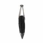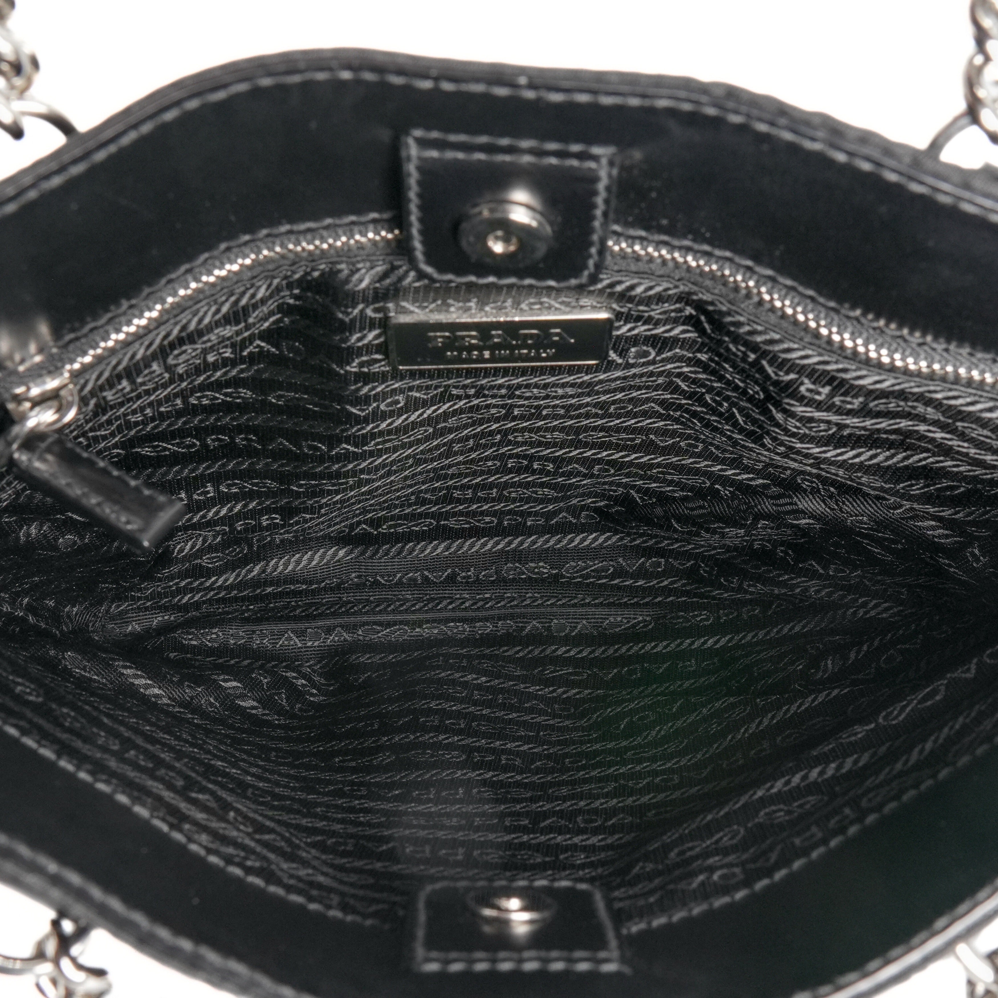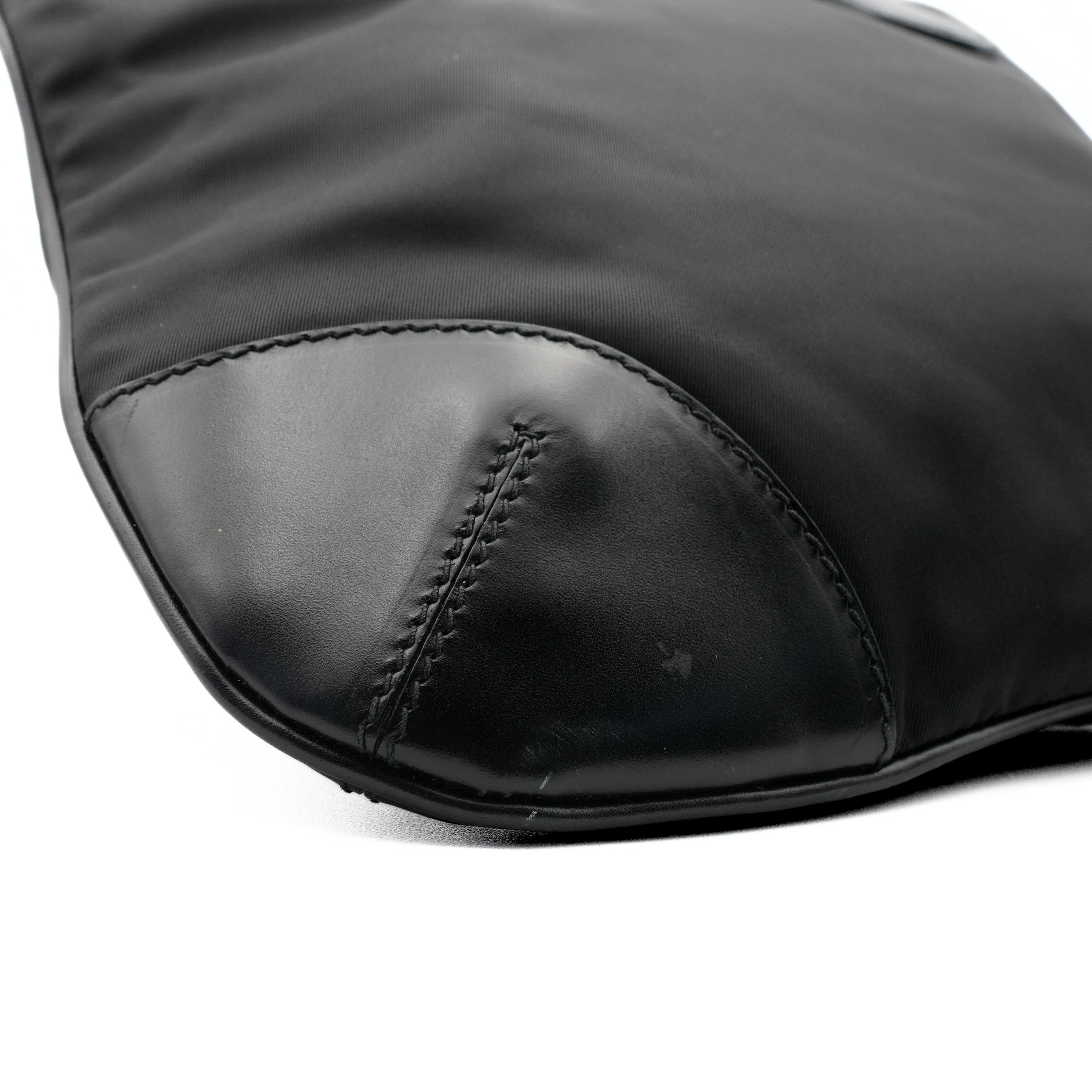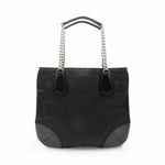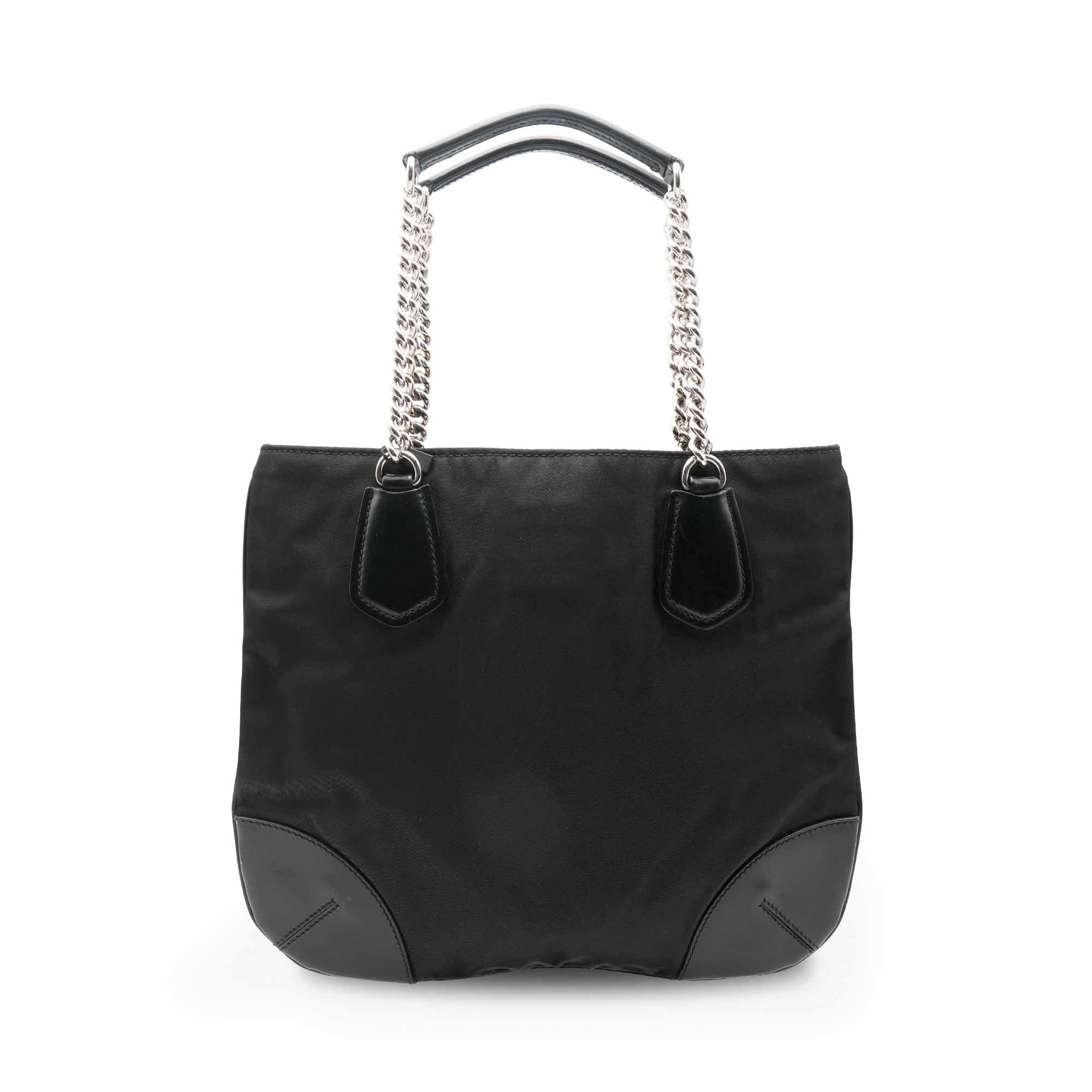 Prada flat handbag in black nylon with leather detailing and a silver triangle logo plaque. Features chain and leather handles, an interior magnetic closure, and logo jacquard lining with inner zip pocket.