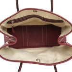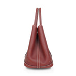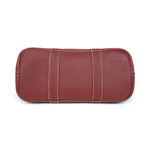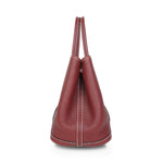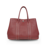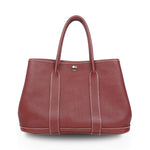 Hermes 'Garden Party 30' handbag in rouge H negonda leather with white stitching, dual rolled top handles, 'clou de selle' snap closures in silver hardware, and a cream canvas inner lining with a zip pocket.