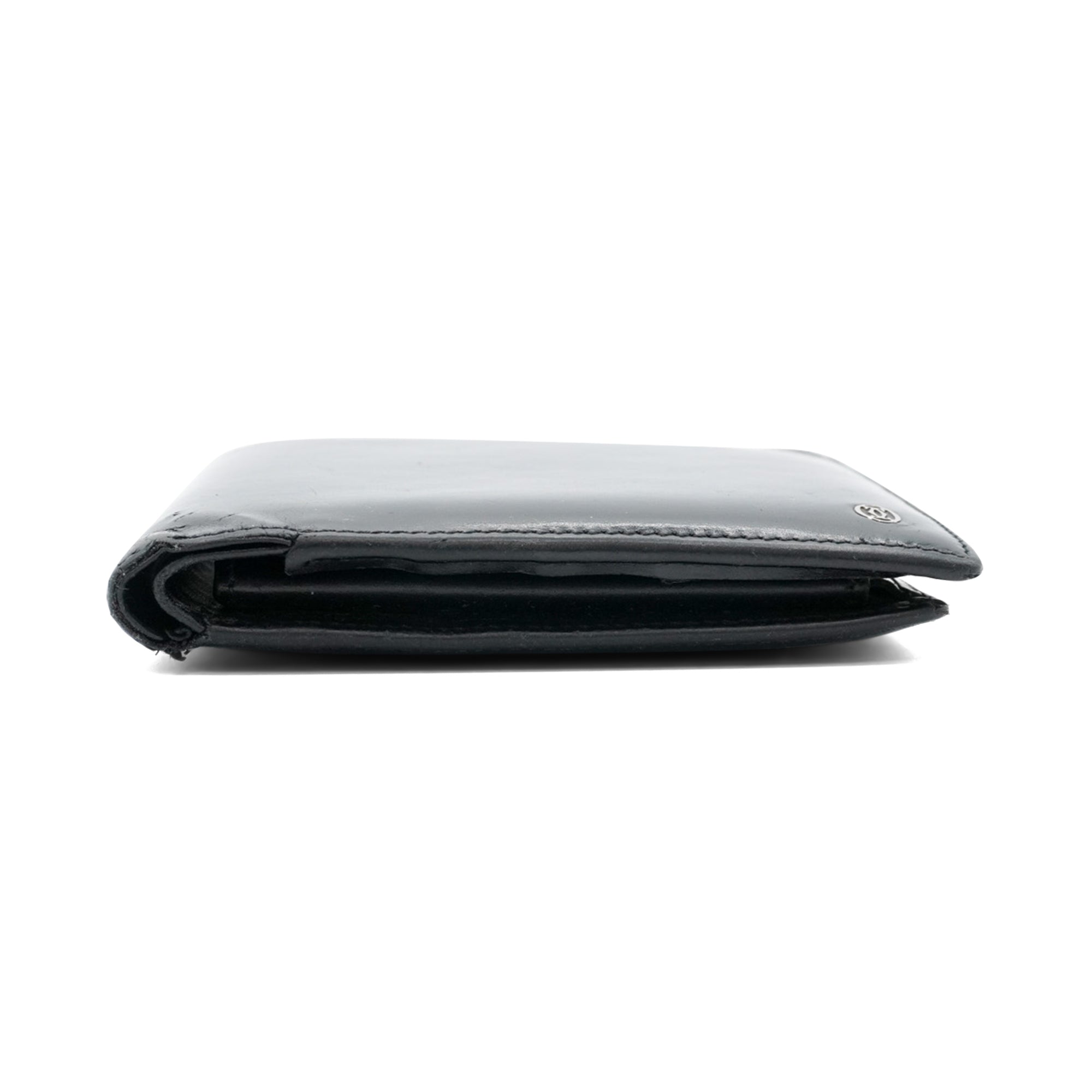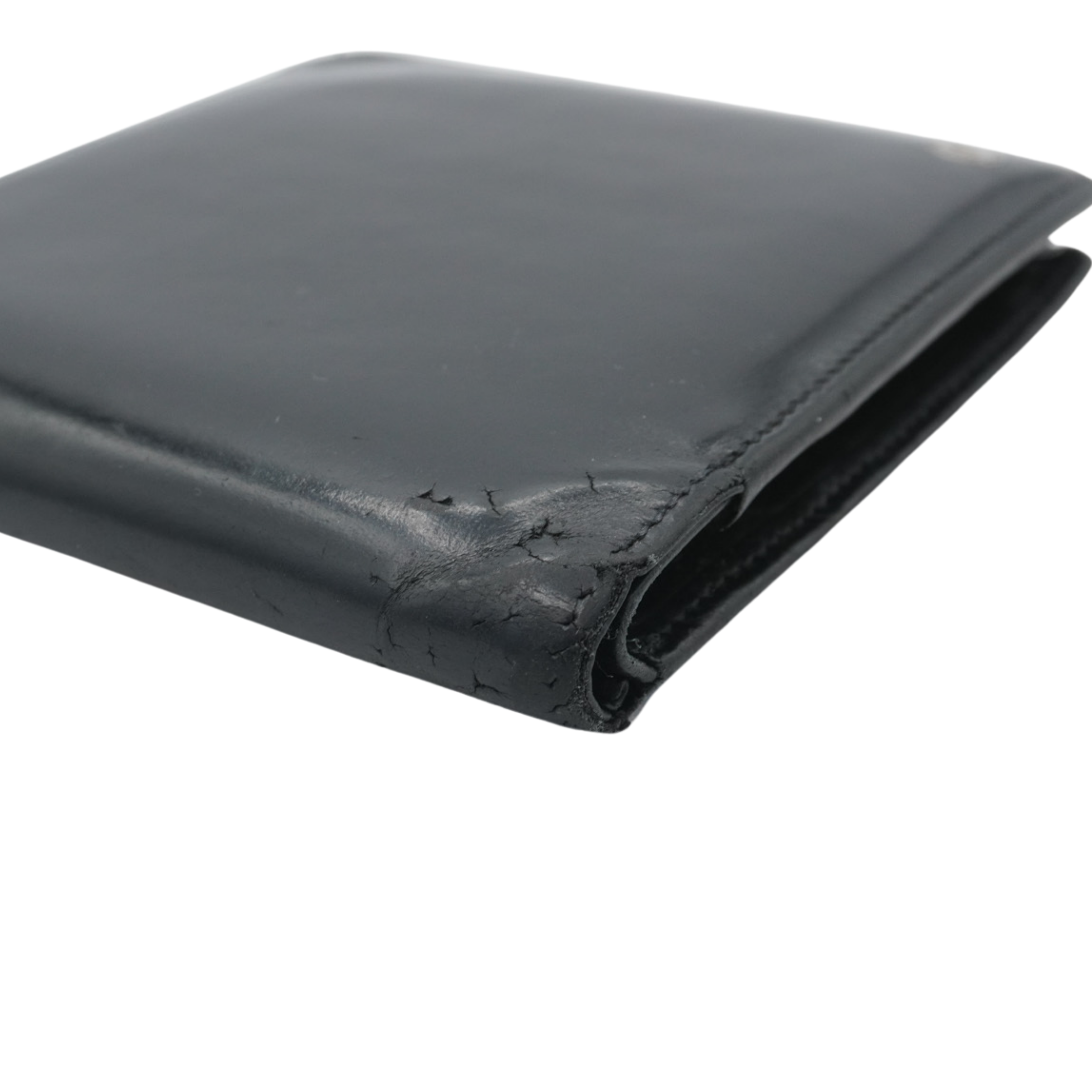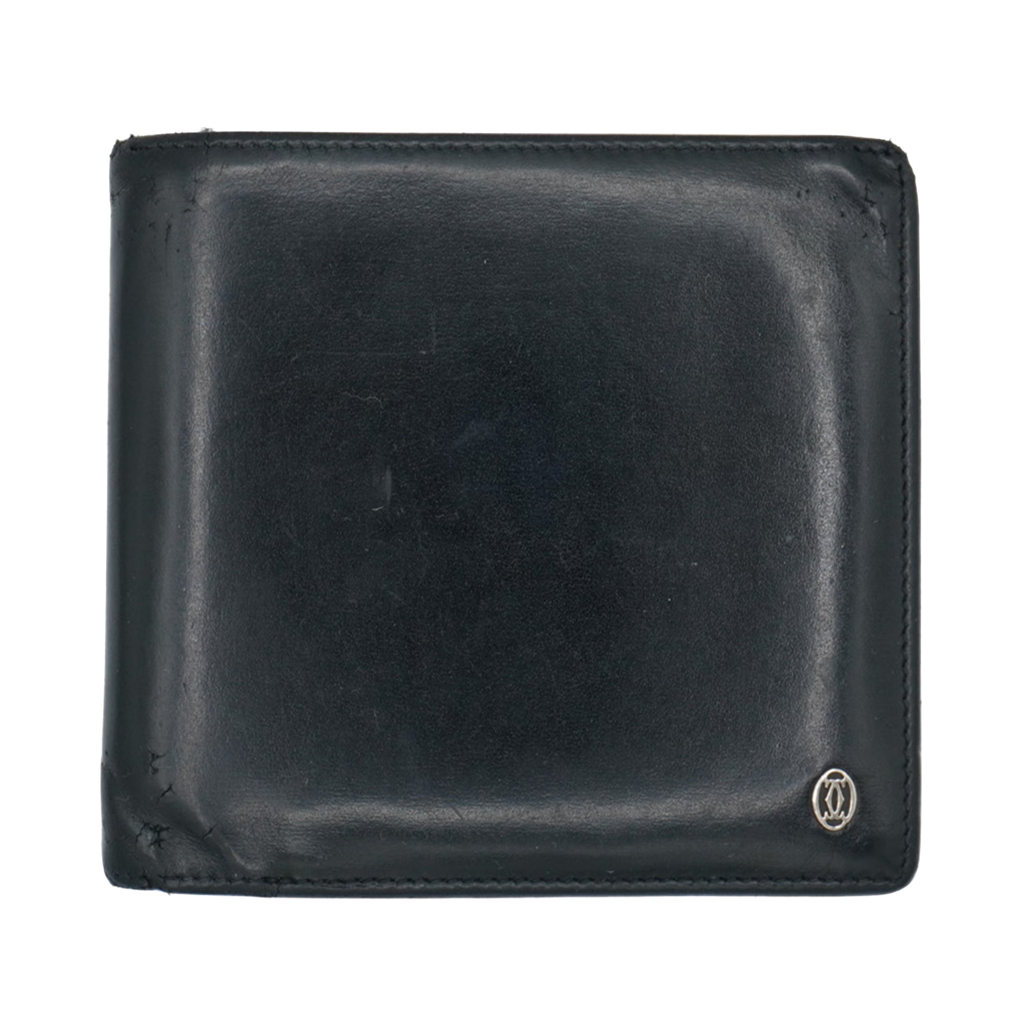 Cartier bi-fold wallet in smooth black leather with a small silver logo emblem on the front and a leather lined interior with several card slots and both a cash and coin pocket.