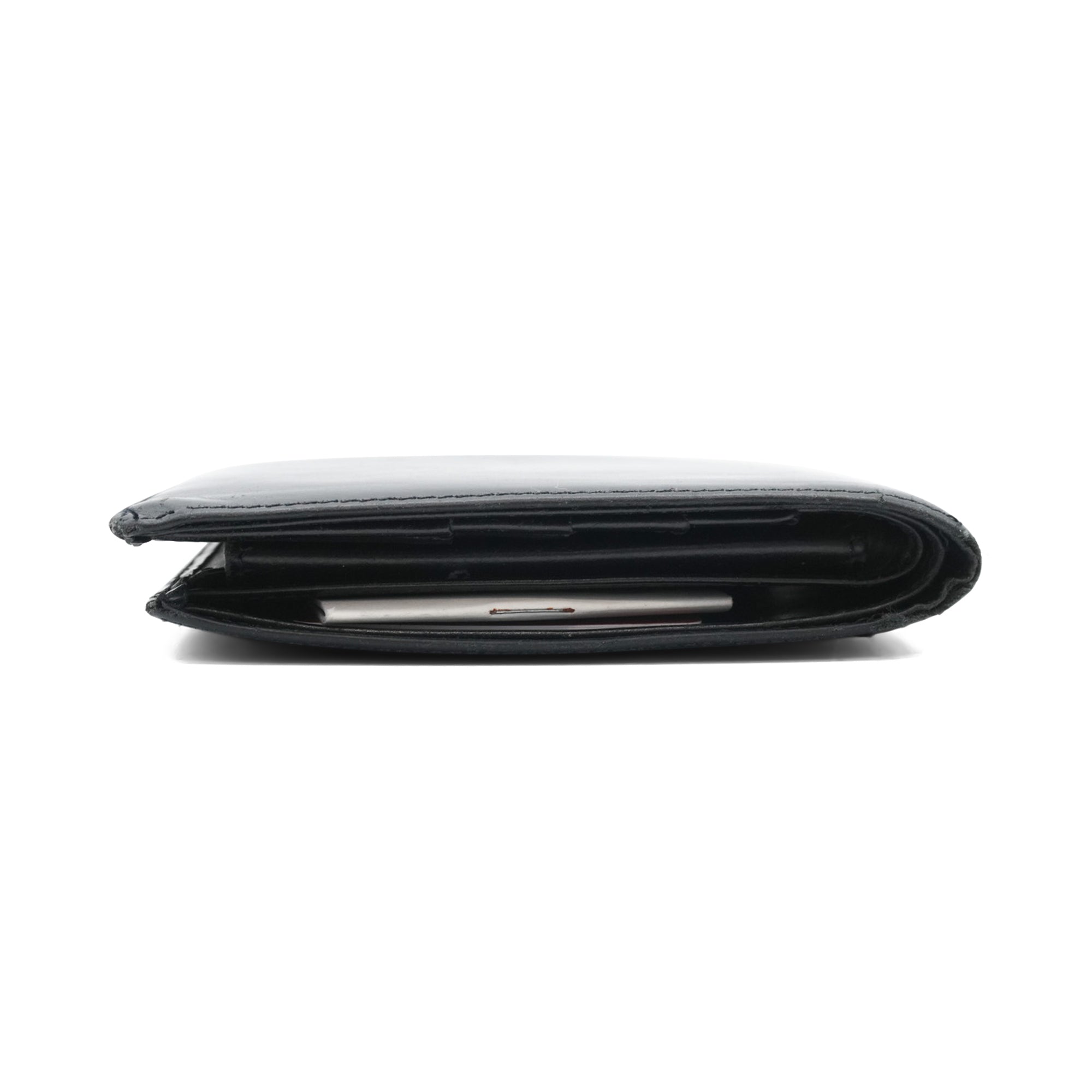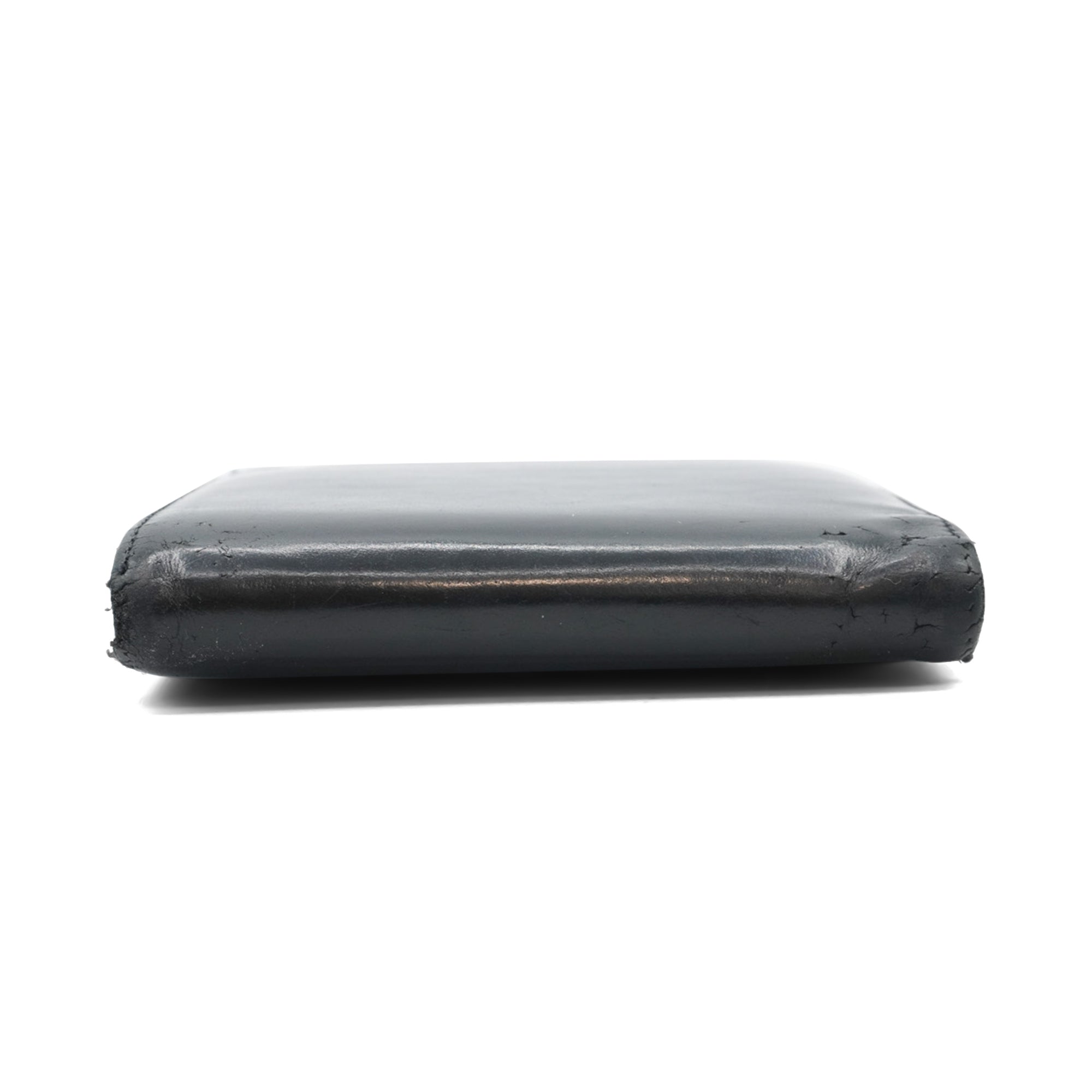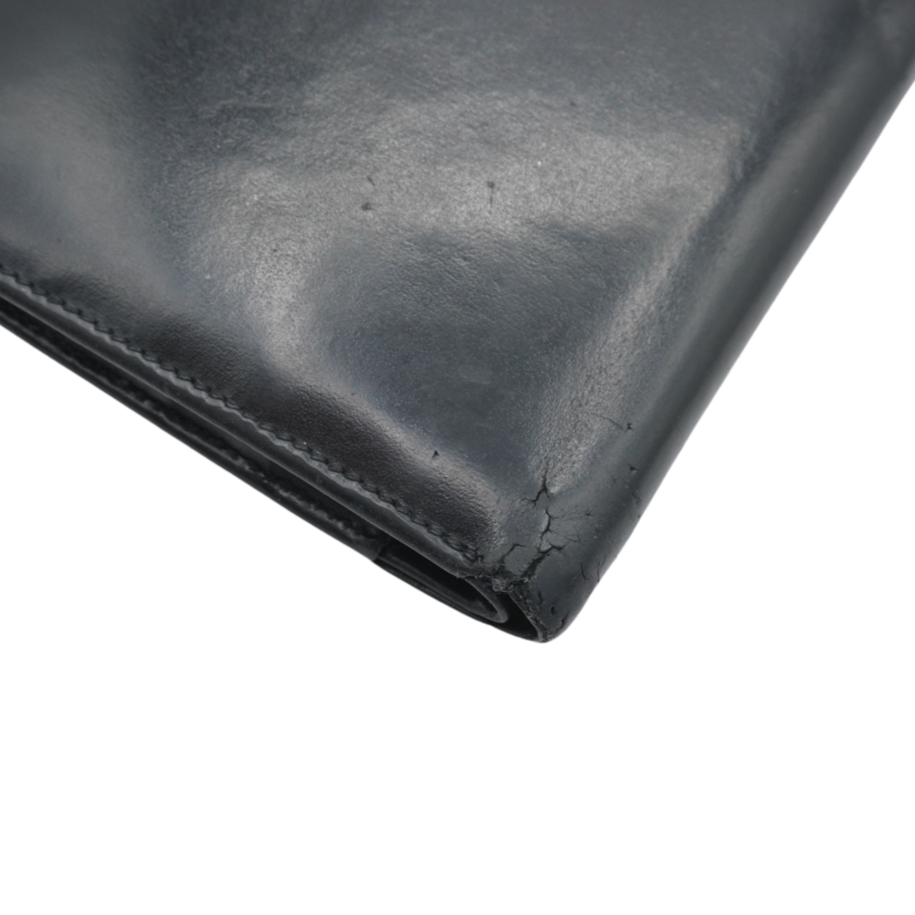 Cartier bi-fold wallet in smooth black leather with a small silver logo emblem on the front and a leather lined interior with several card slots and both a cash and coin pocket.