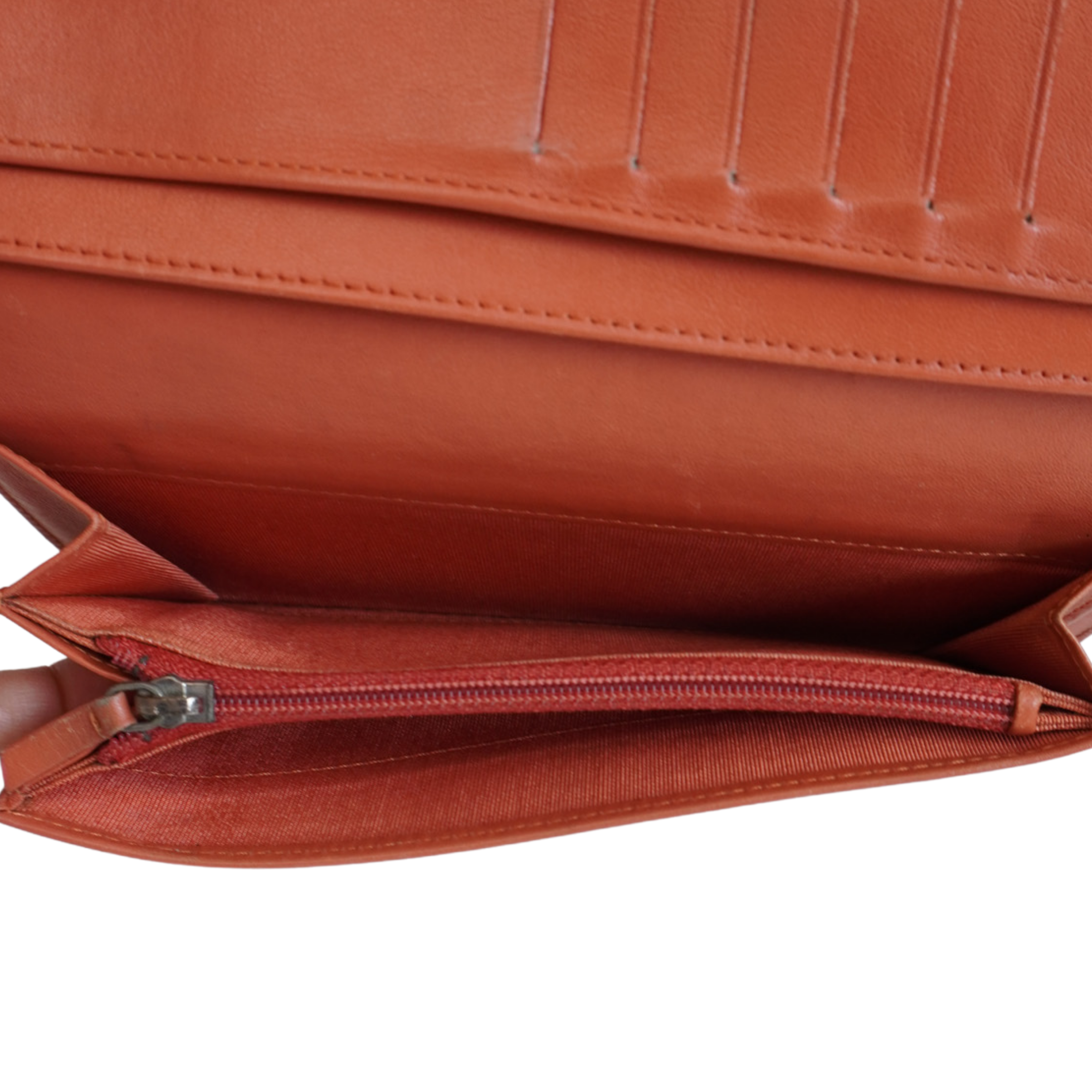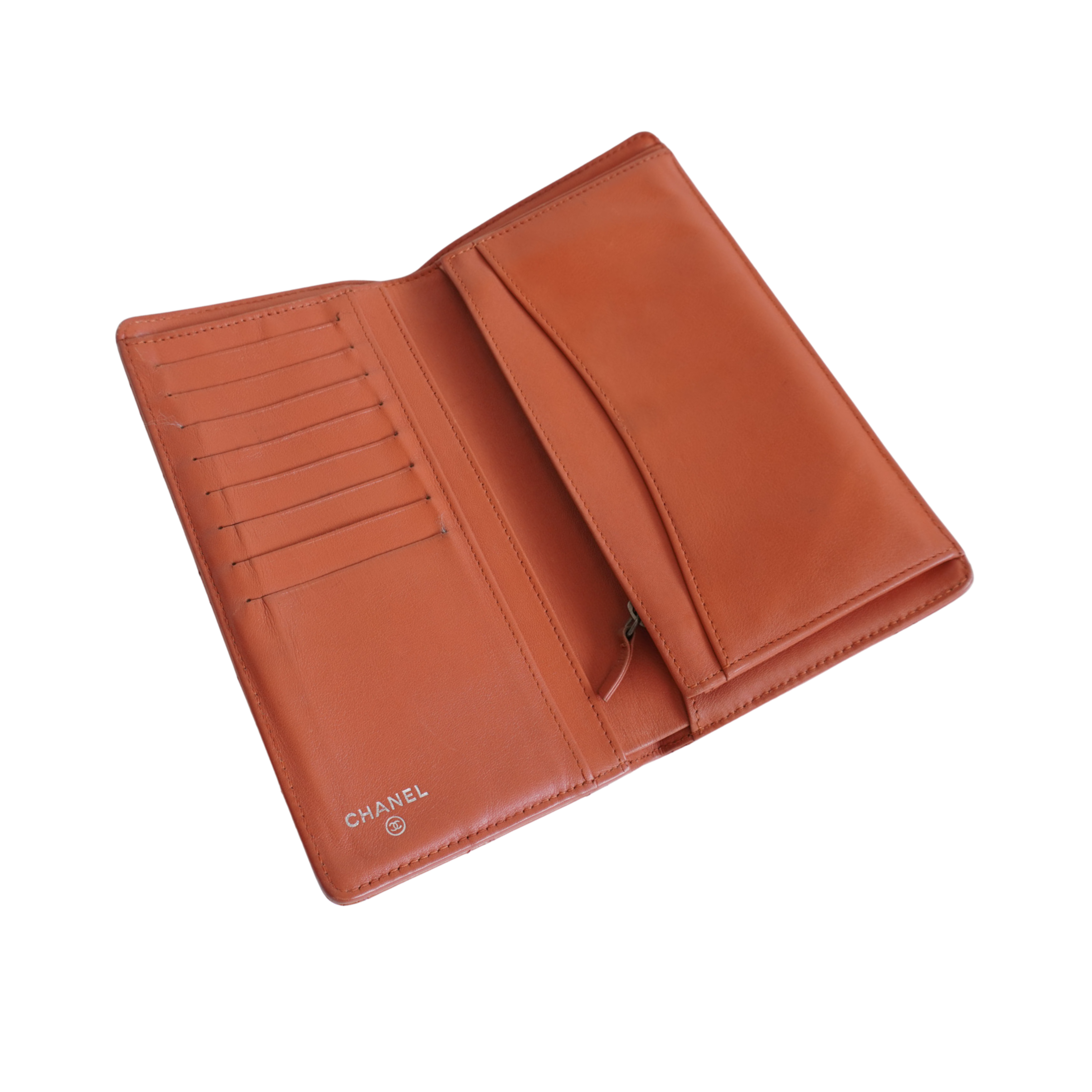 Chanel bifold flap wallet in terracotta orange quilted leather with a silver 'CC' emblem on the front, a slip pocket on the back, and a tonal smooth leather lined interior.