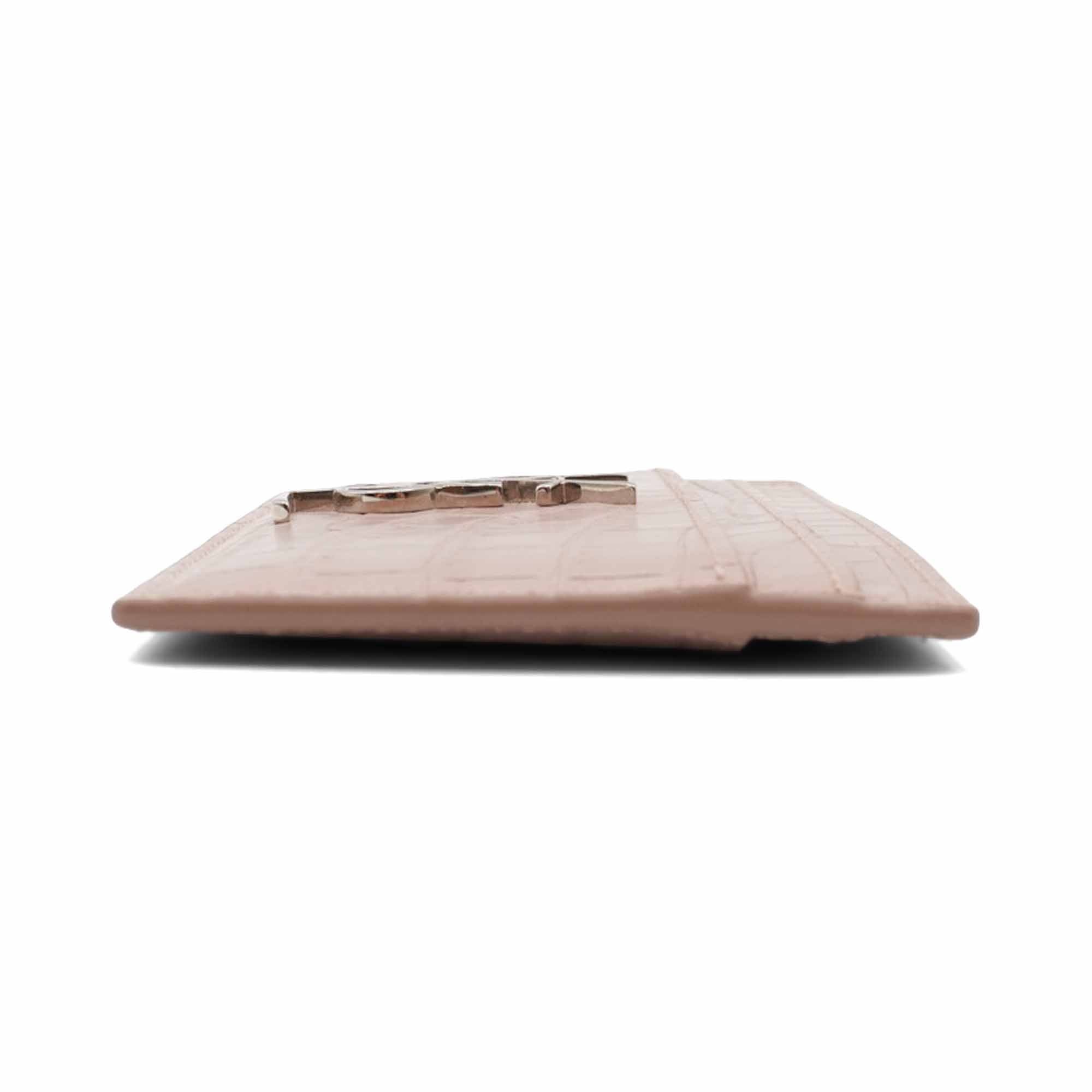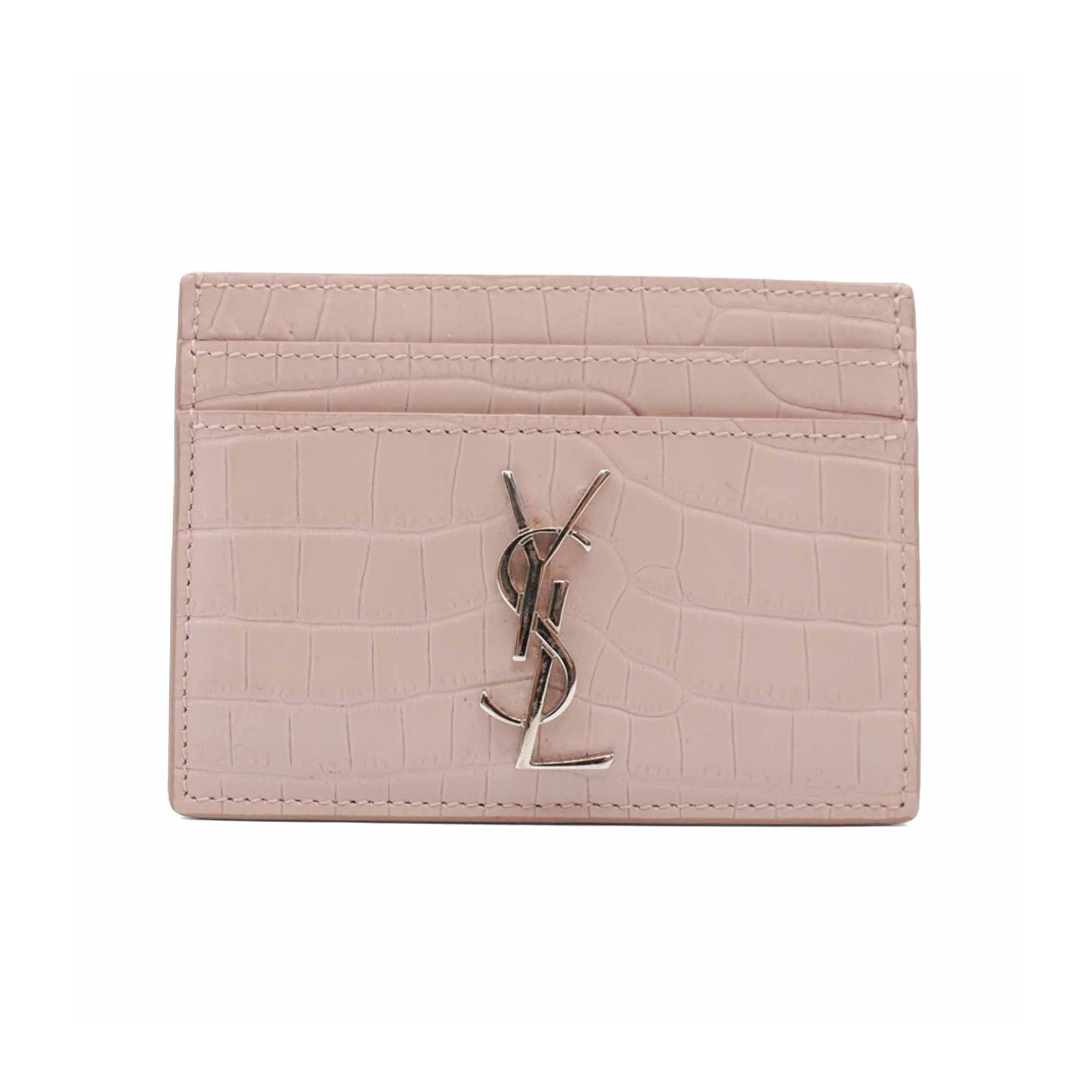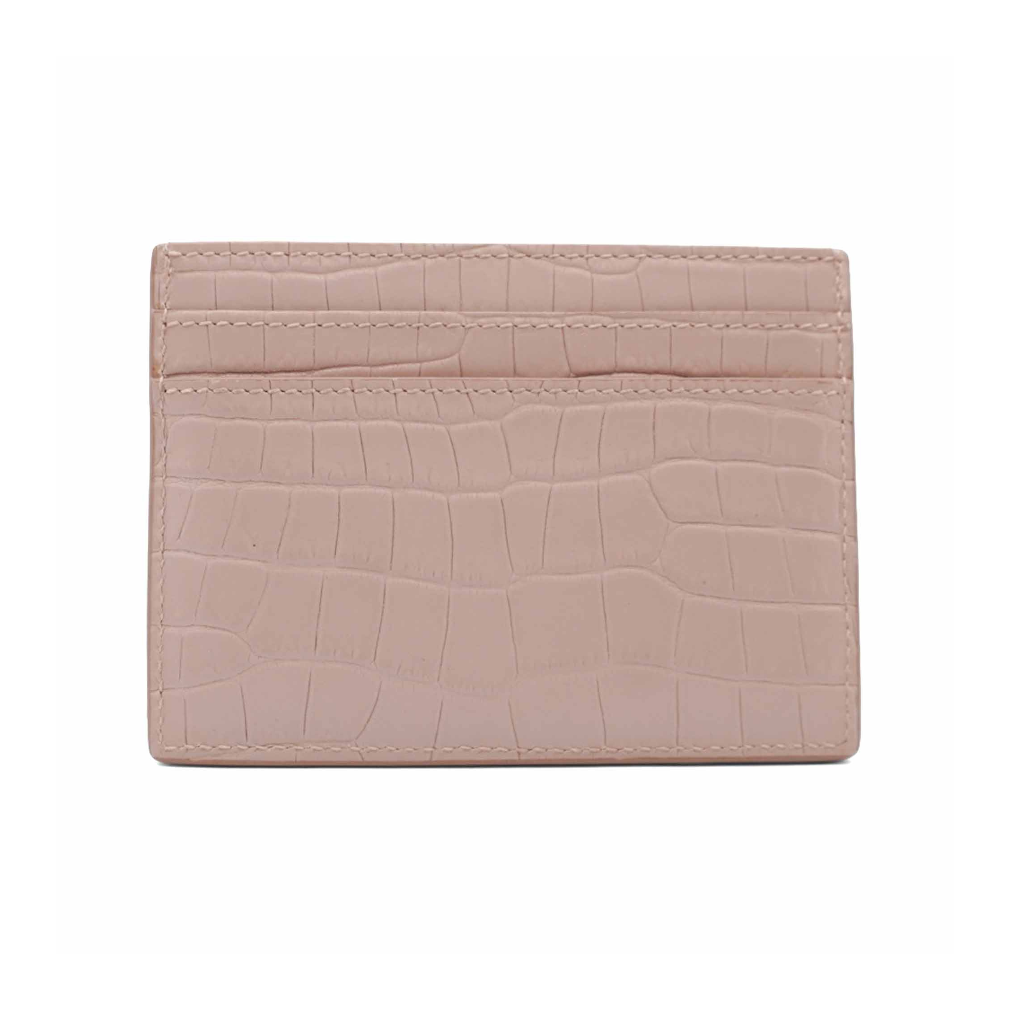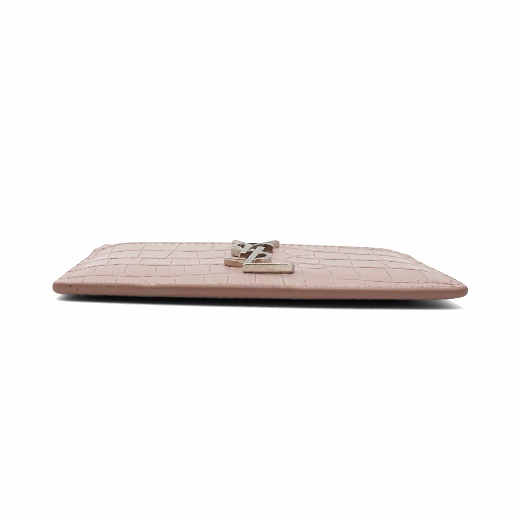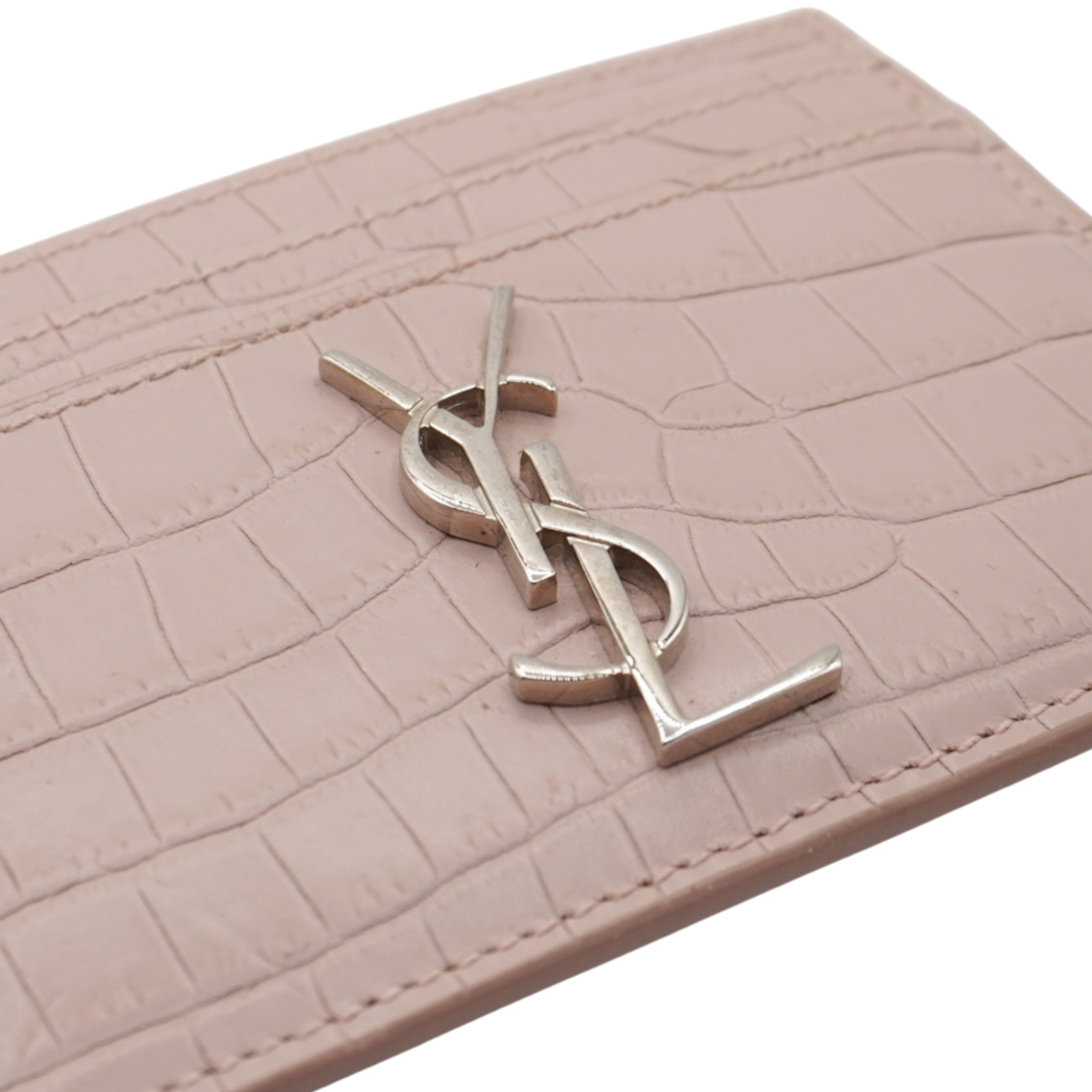 Saint Laurent cardholder in pale pink croc embossed leather with 5 card slots and a logo emblem in silver hardware.