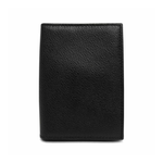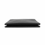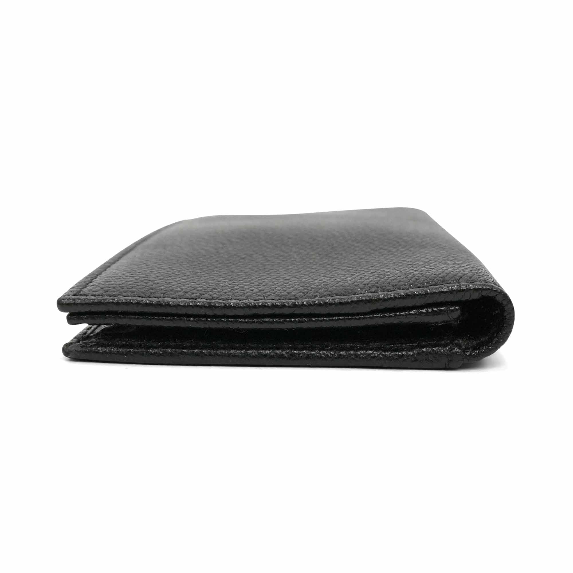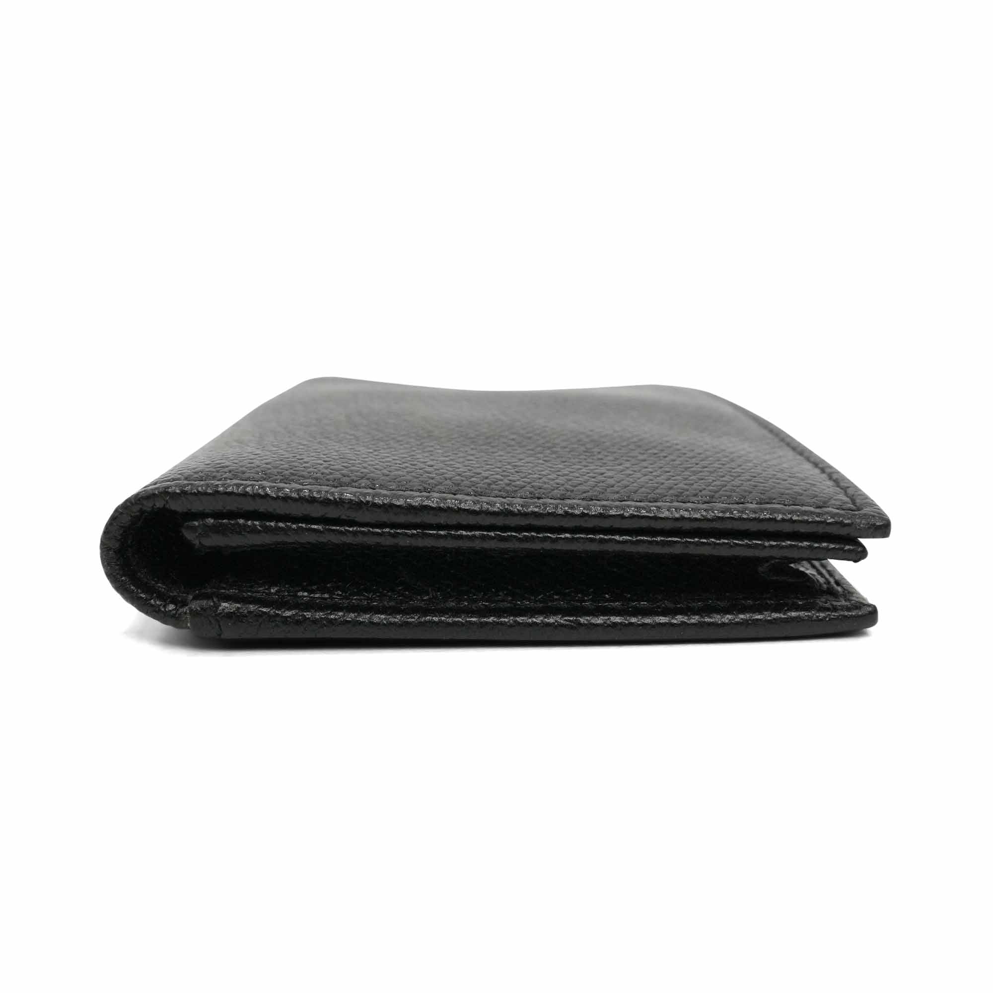 Tiffany & Co. bi-fold card holder wallet in black pebbled leather with tiffany blue lining. Features silver logo on inside, one side has three card slots, other side has two slip compartments for more cards with tiffany blue separating partition, and one card slot on outside.