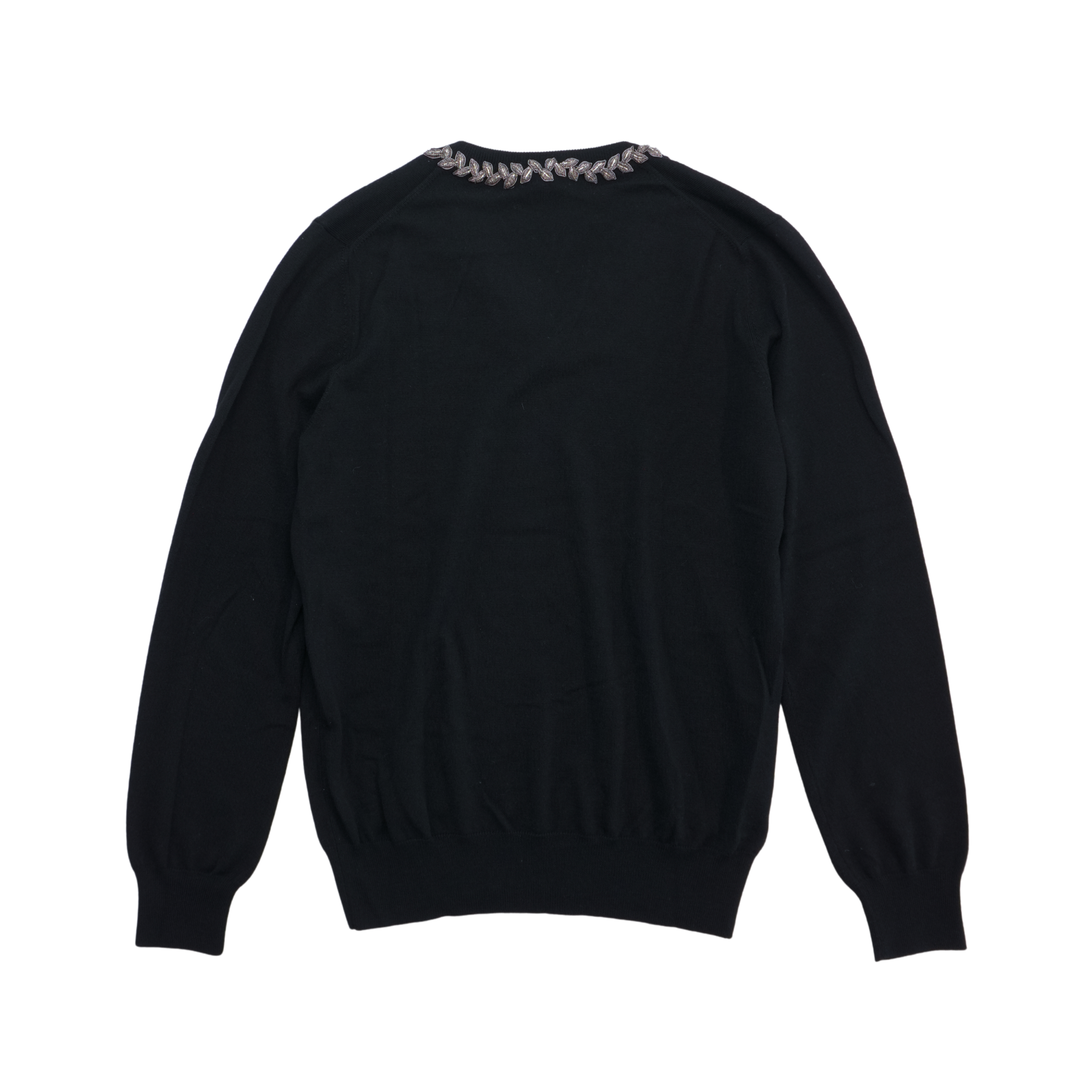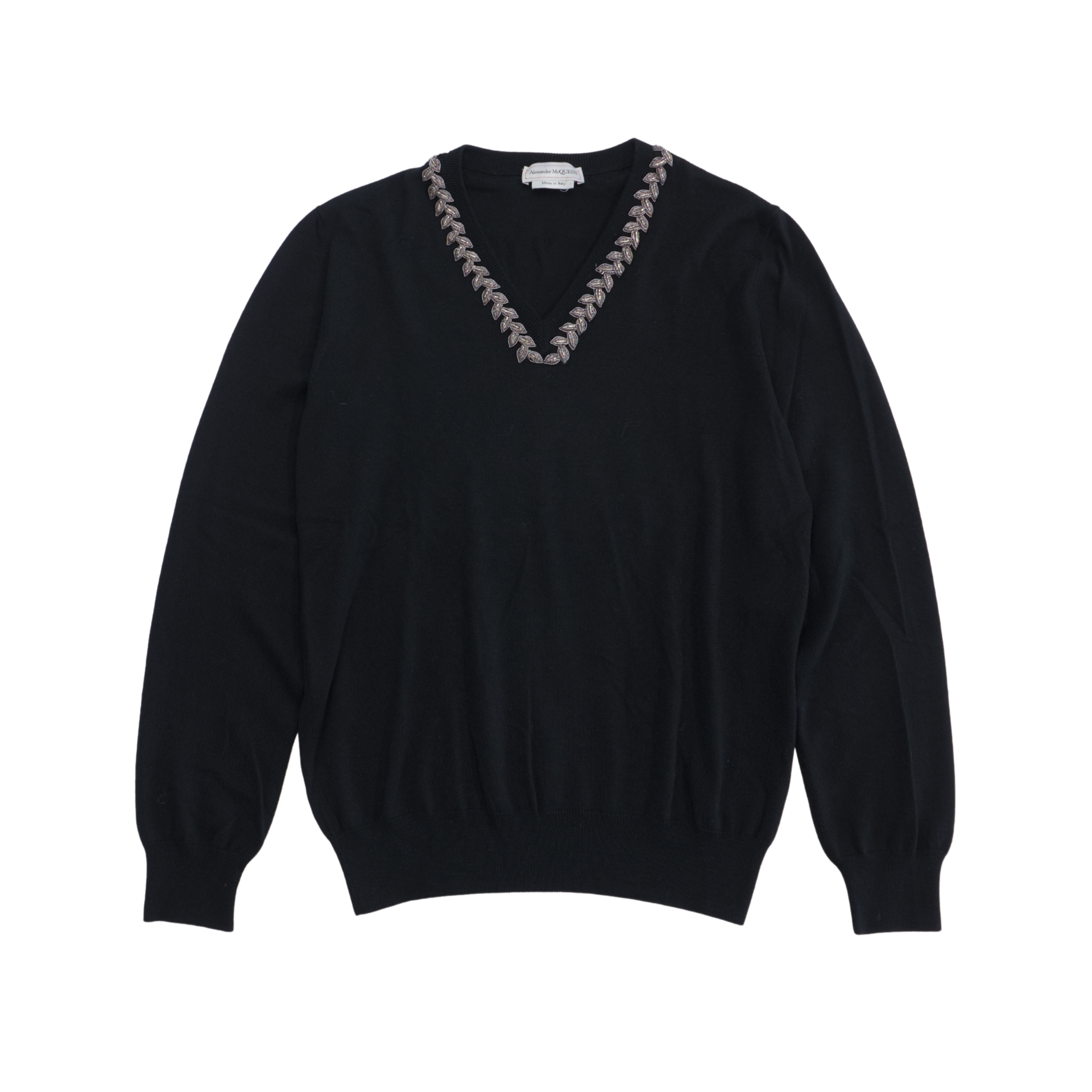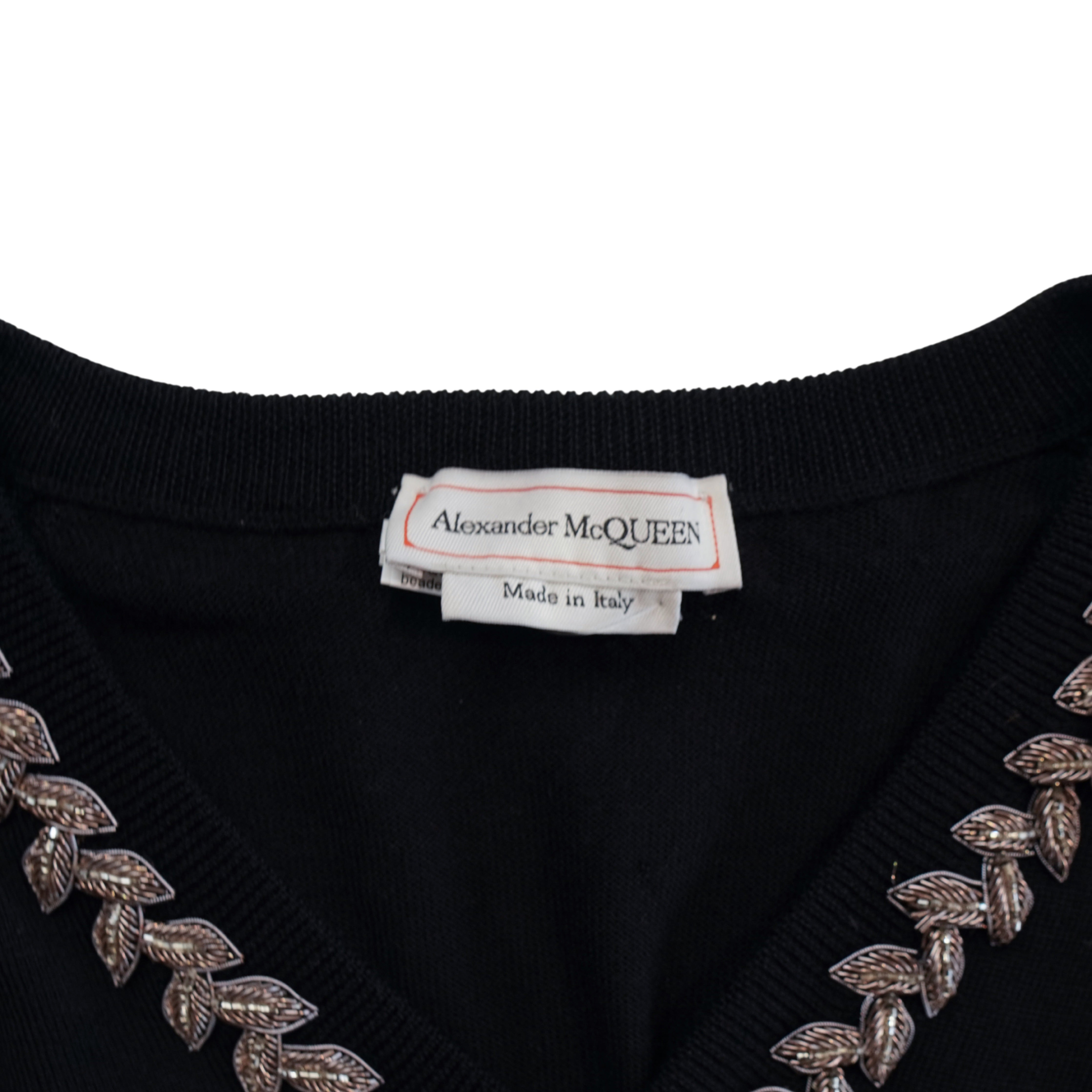 Alexander McQueen v-neck pullover sweater in black wool with silver beaded leaves around the neckline.