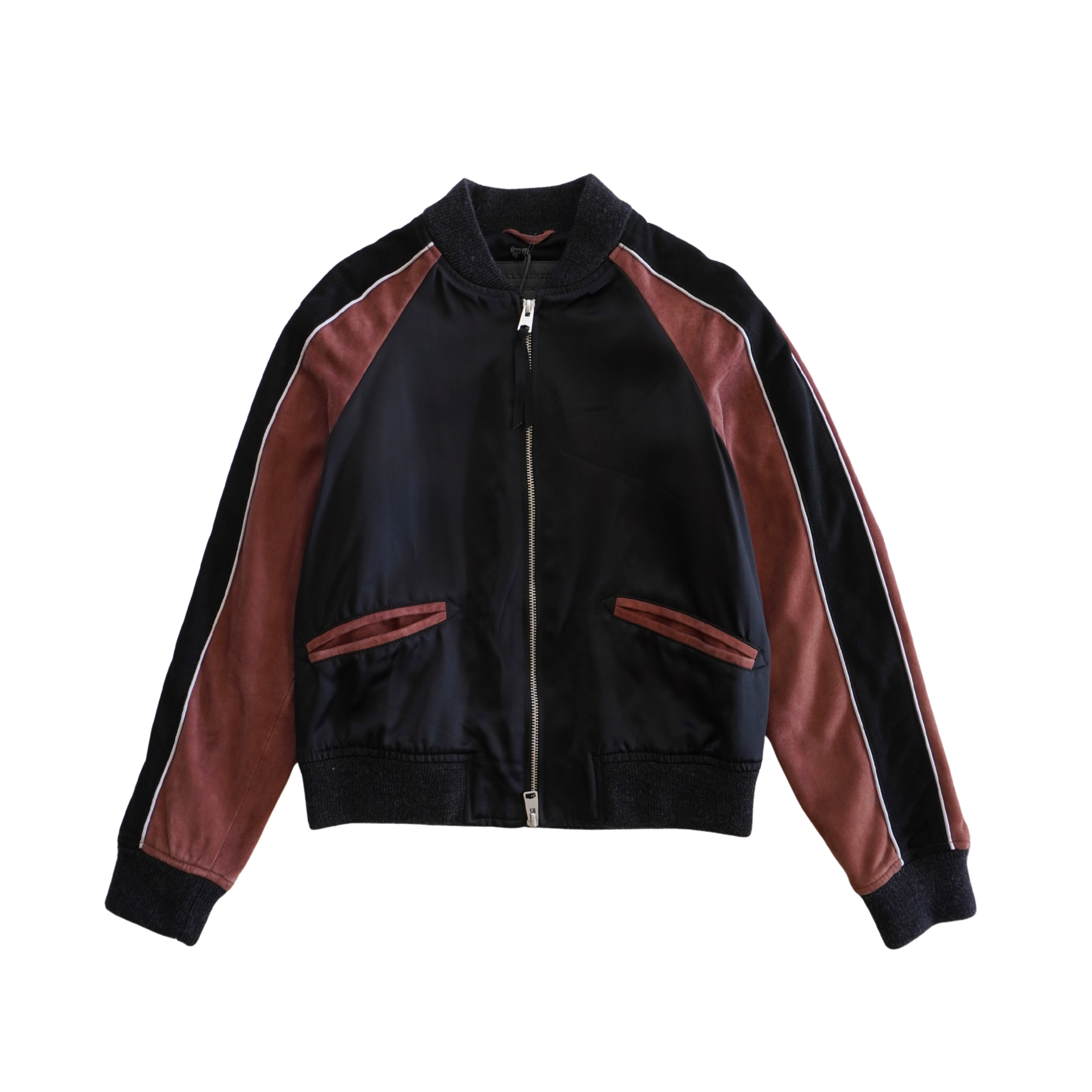All Saint 'Atley' bomber jacket in black satin with rust suede panels and dark grey knit trim.
