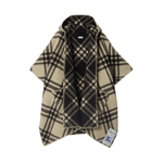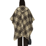 Burberry 'Catherine' cape in beige and black wool with an all-over novacheck pattern, whipstitch hems, patch pockets, a large white logo patch on the hem, and a hood.