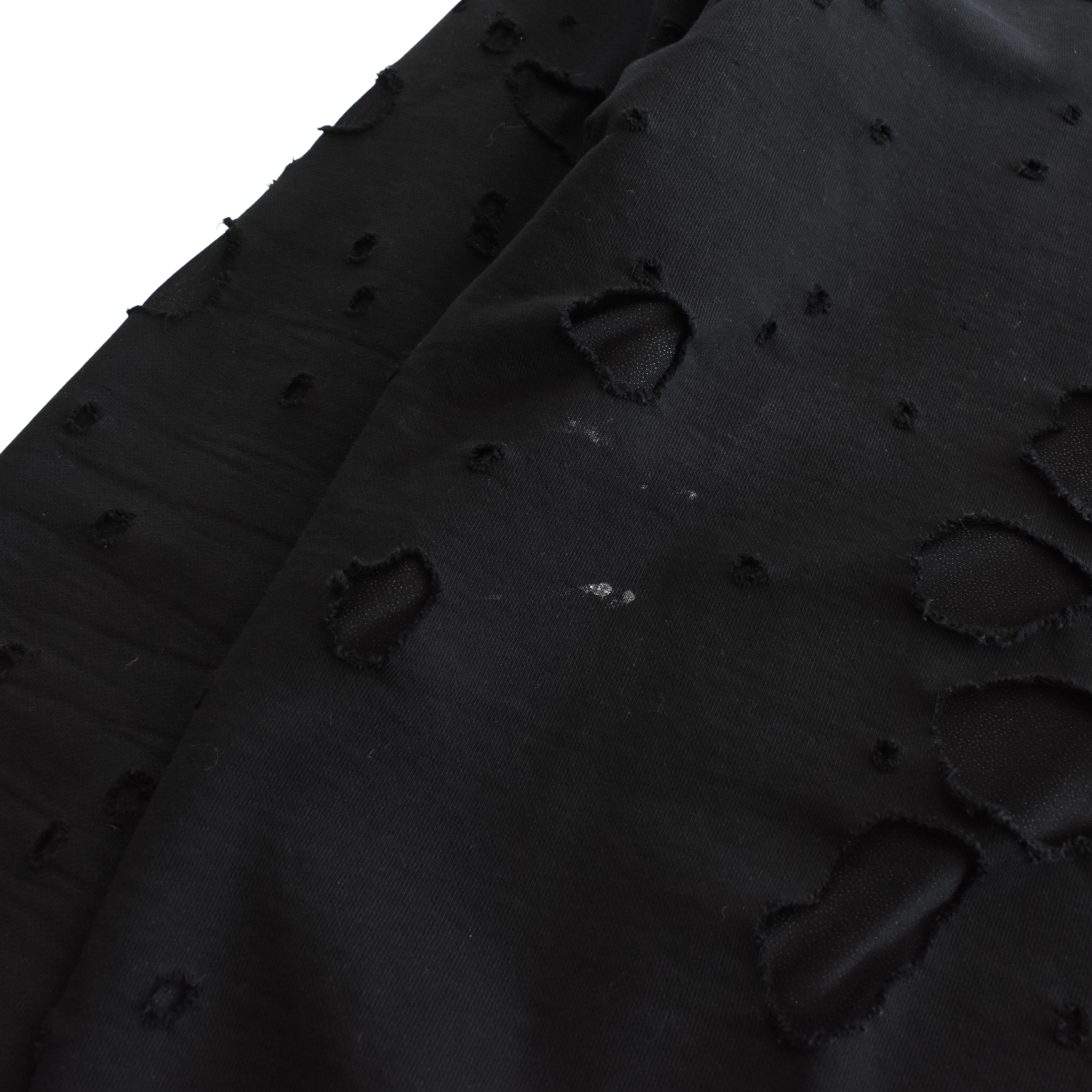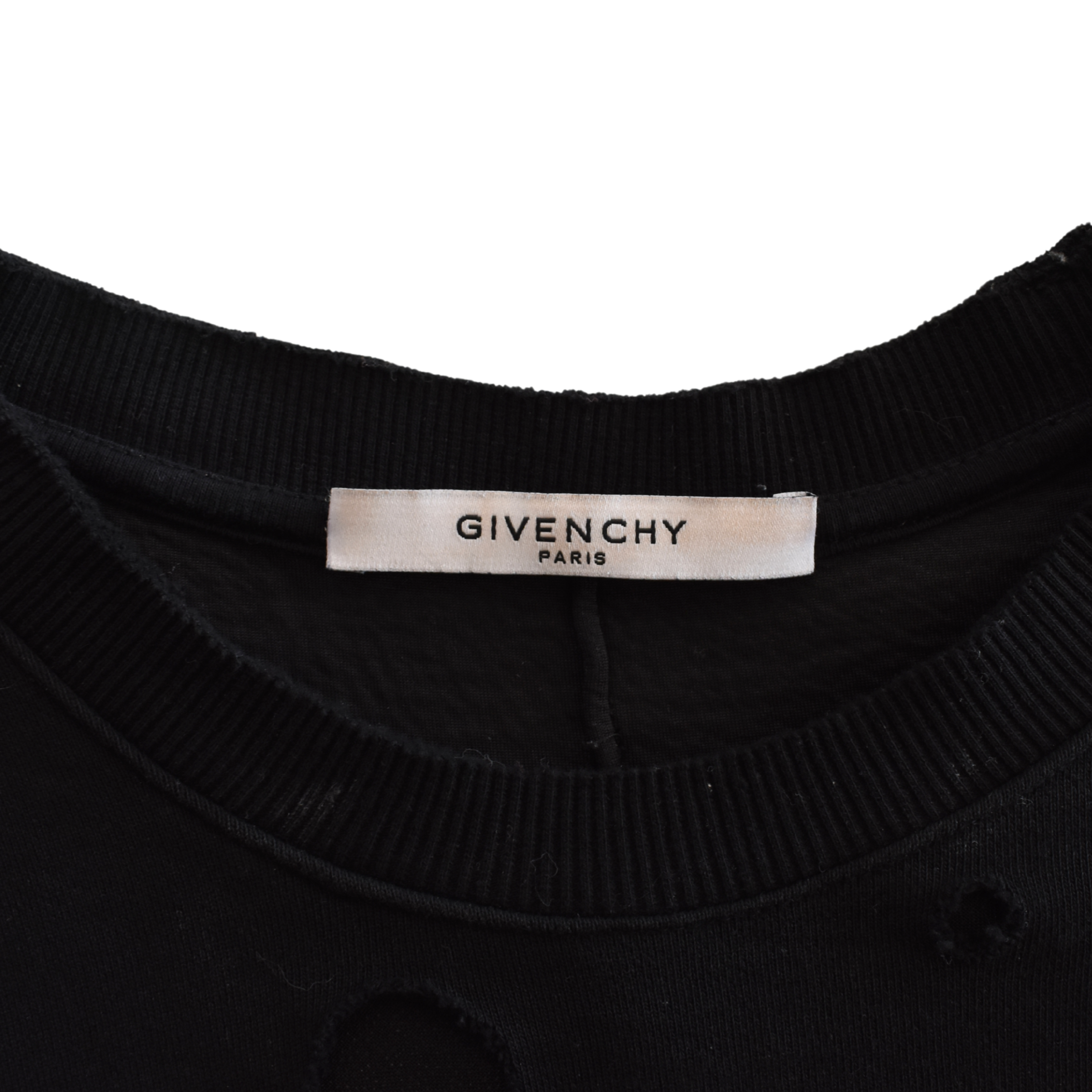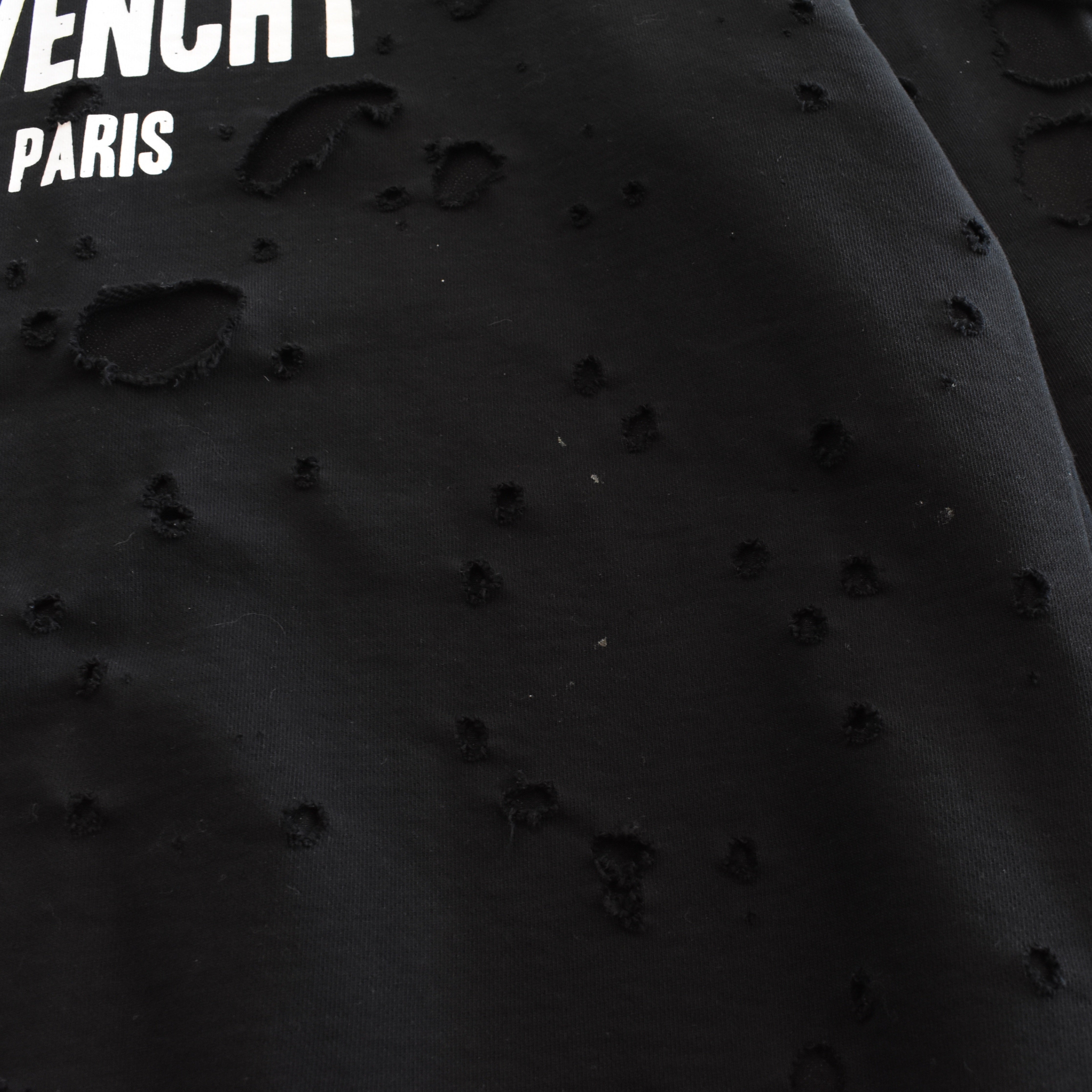 Givenchy pre-distressed black crewneck with white logo print and a textured sheer black inner layer that peaks through the holes.