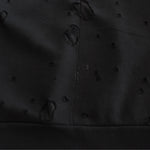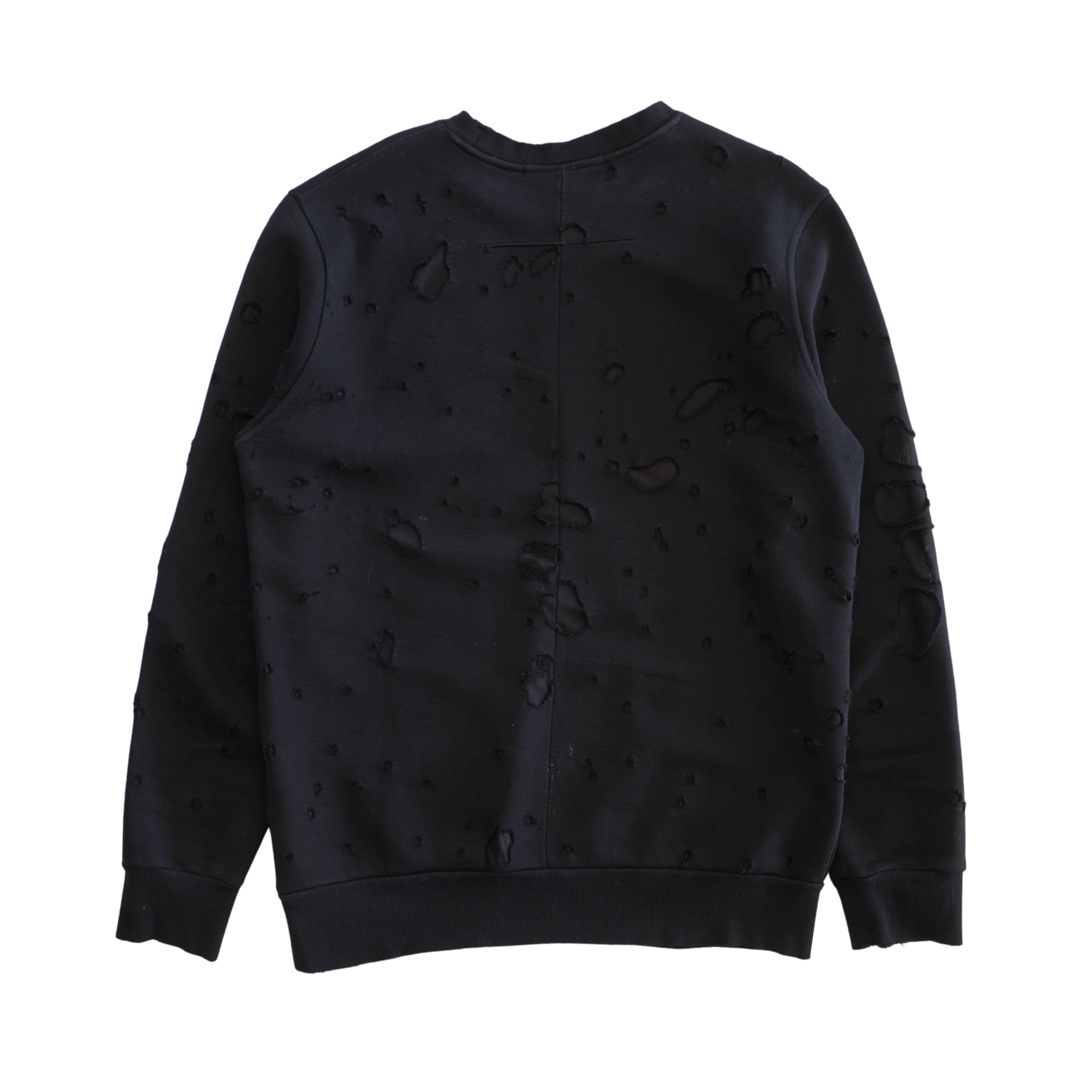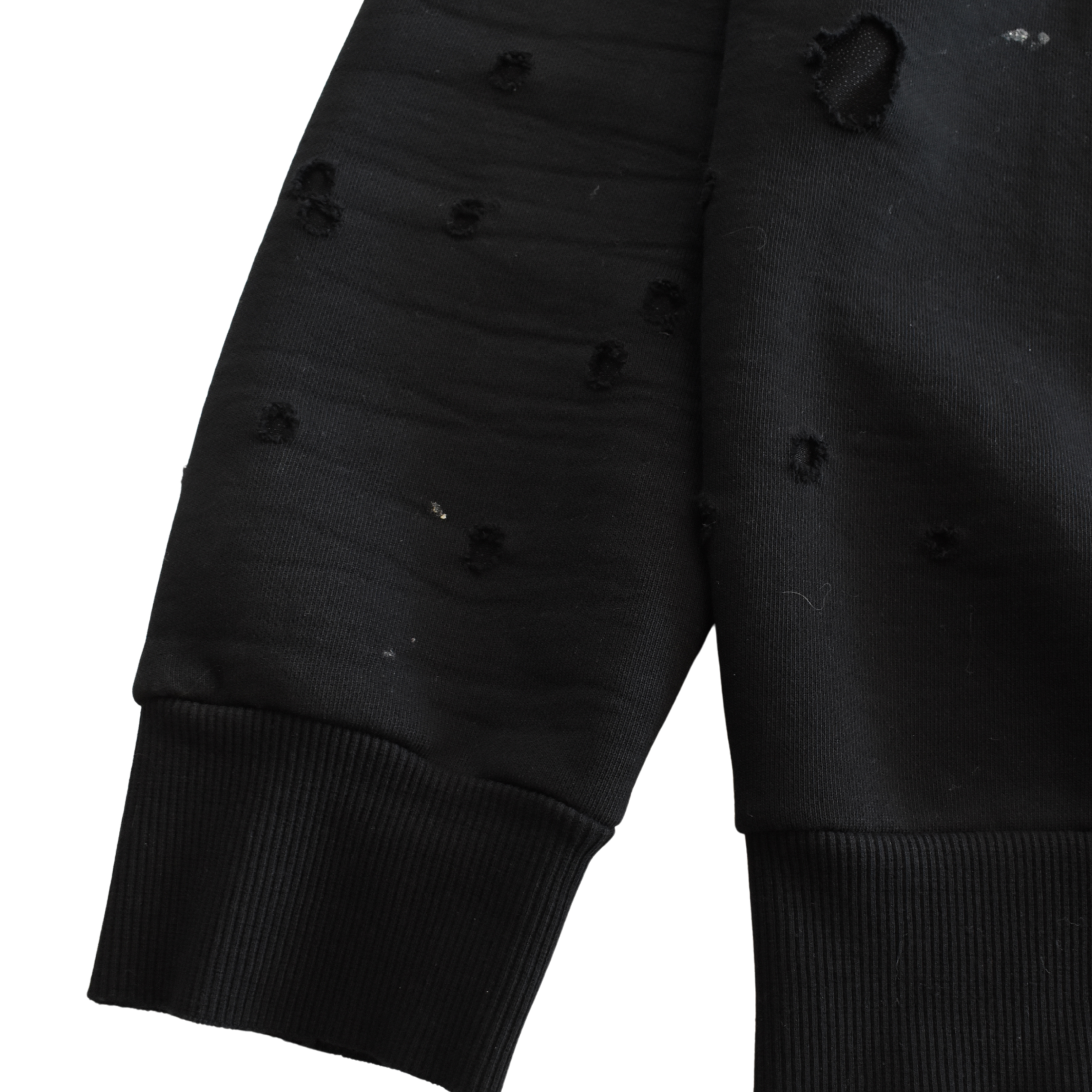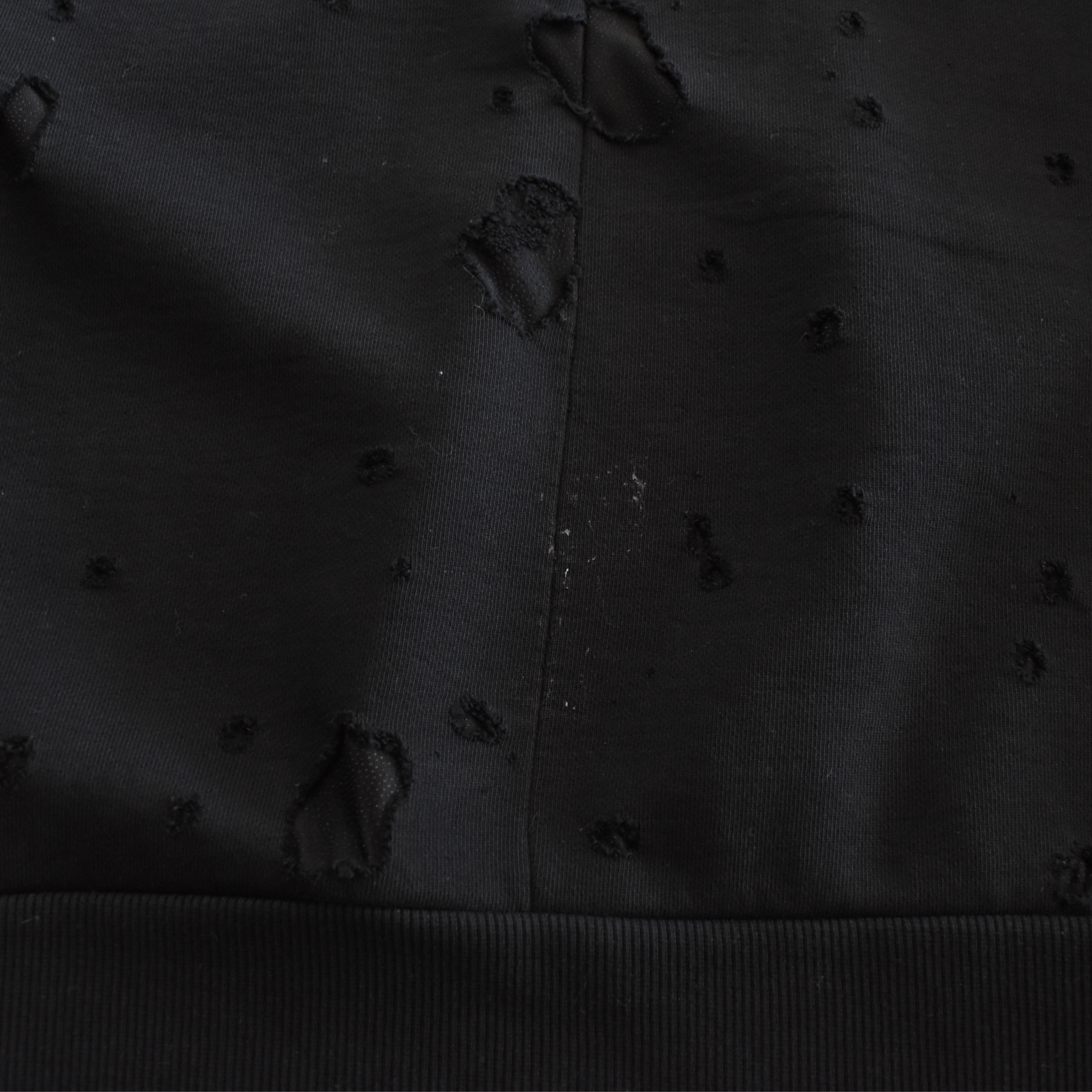 Givenchy pre-distressed black crewneck with white logo print and a textured sheer black inner layer that peaks through the holes.