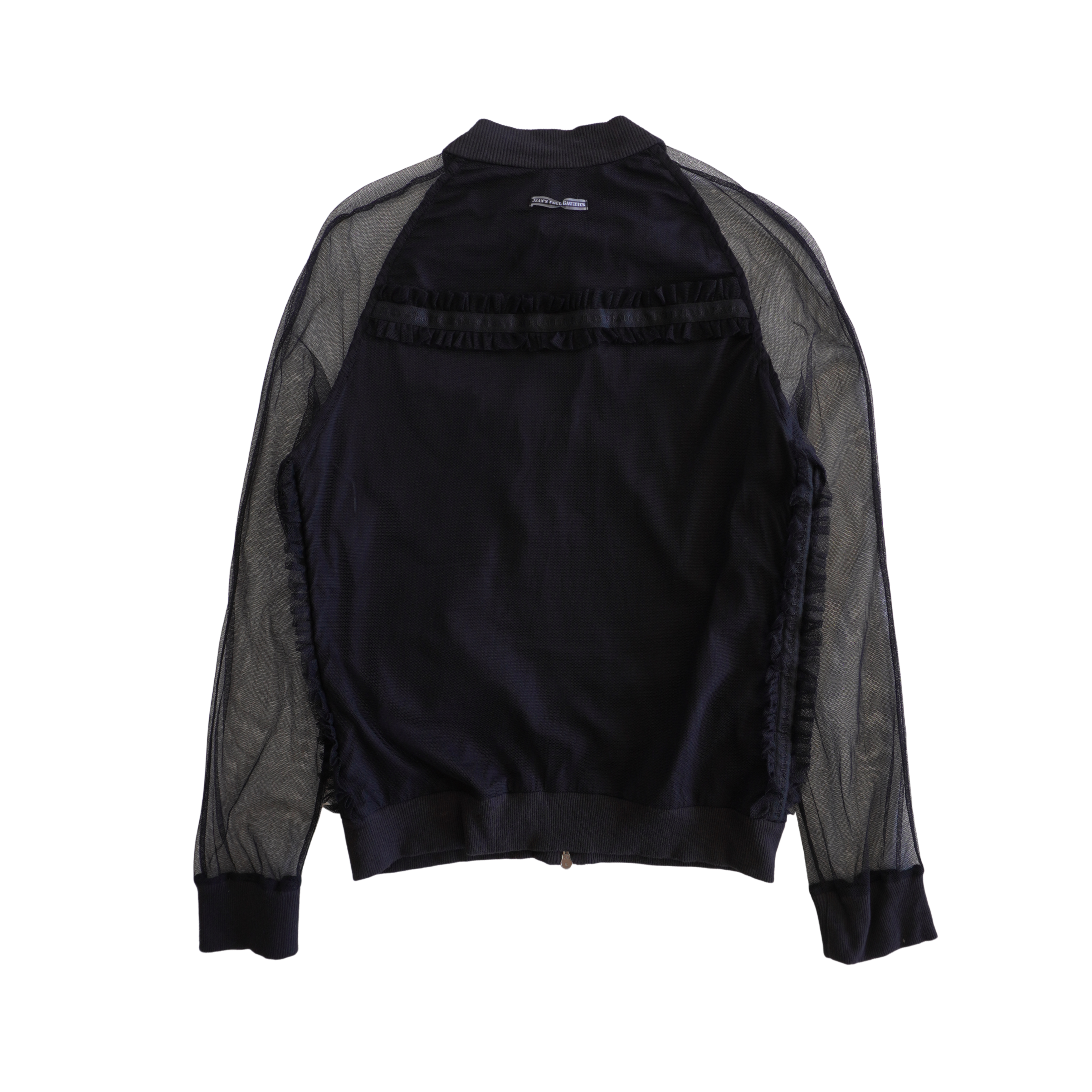 Jean Paul Gaultier zip-up jacket in black with sheer mesh sleeves, ruffle detailing on the sides and the back. Features rib-knit collar, cuffs, and hem with a two-way gunmetal zipper.
